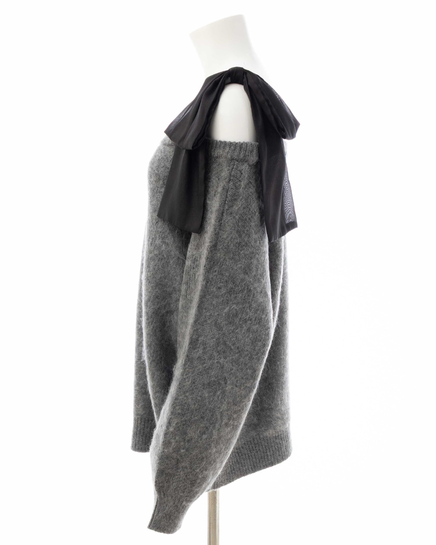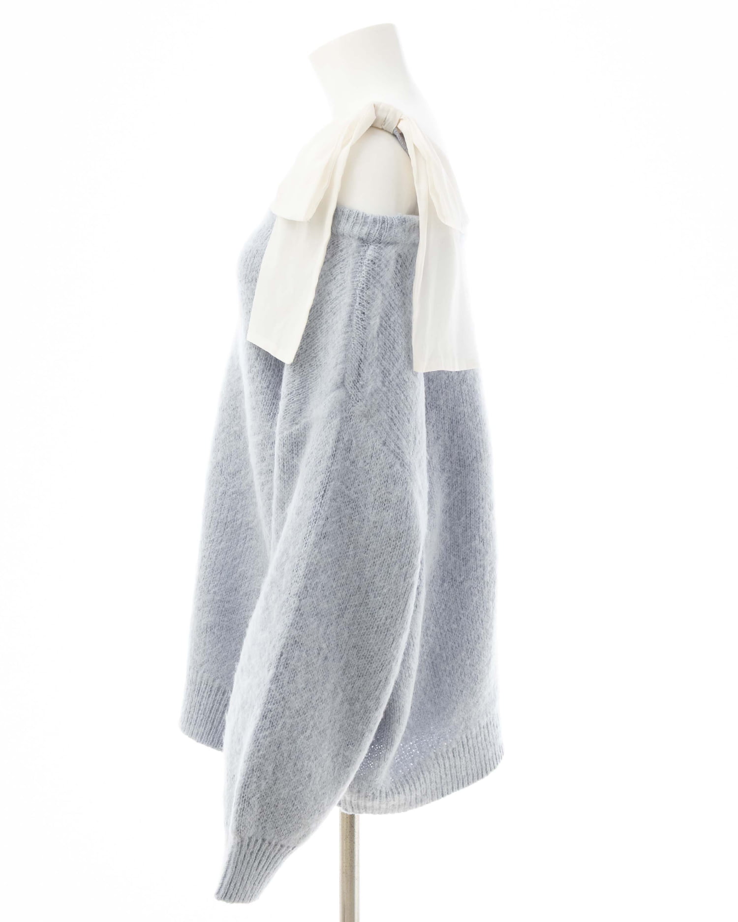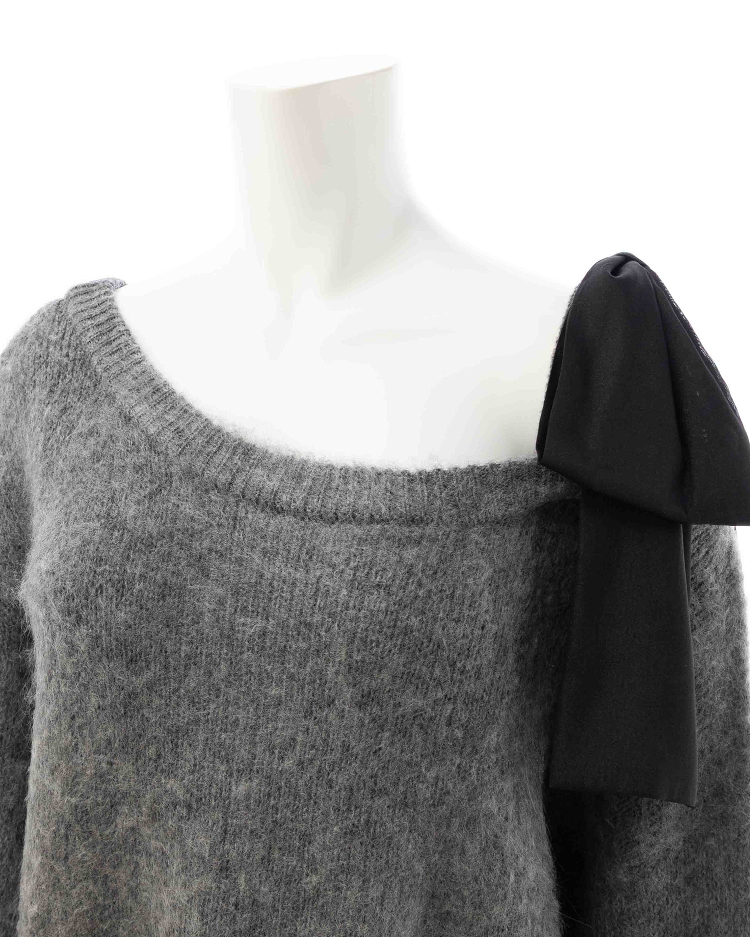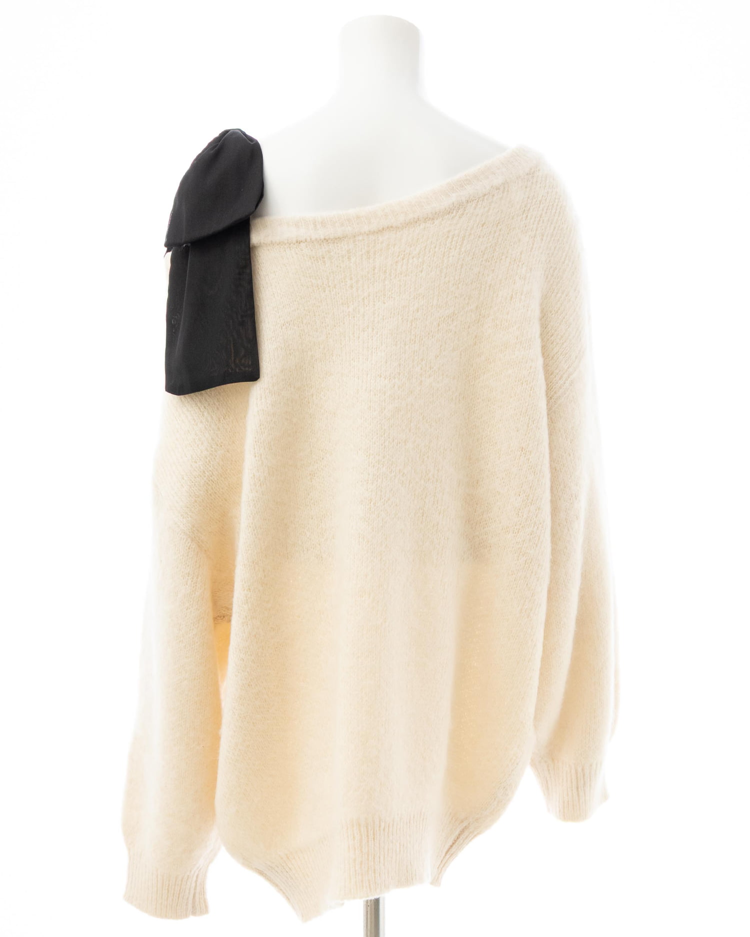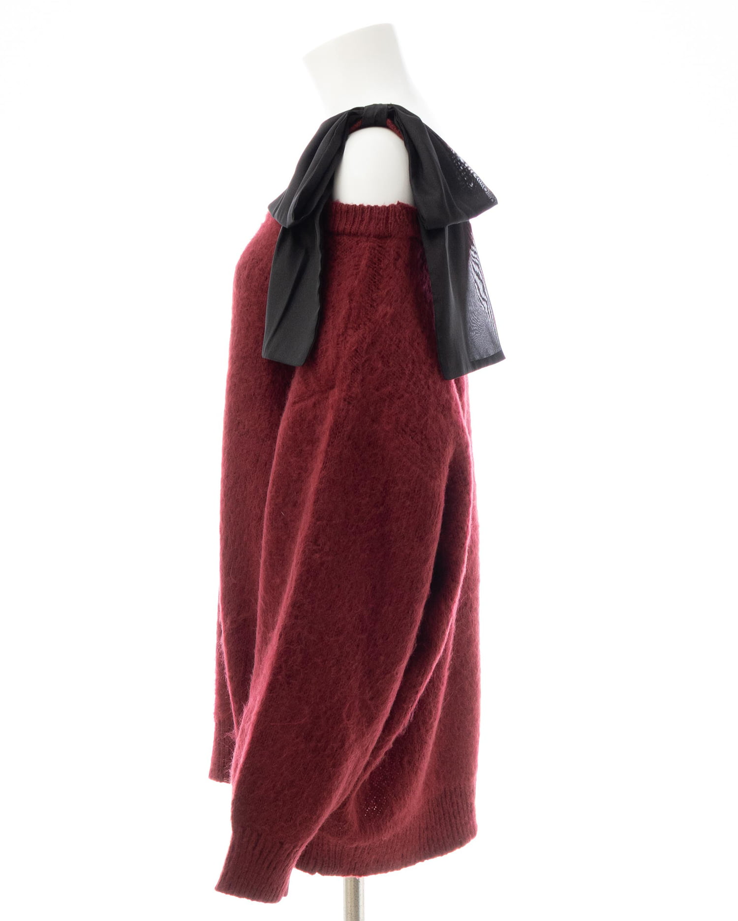 1254-900343 肩リボンワンショルシャギーチュニックニット