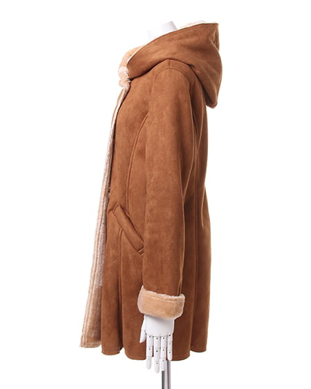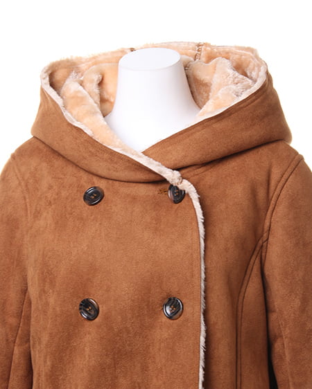 コートは、ダブルボタン仕様のカジュアルでしっかりとしたつくりです。斜めにデザインされたポケット付きで機能もばっちり。フードの内側や袖口からちらりと覗くボアがウォーミーな雰囲気を演出してくれます。バックスタイルもキレイに見える縦ラインを意識した生地合わせで、スタイル良く見せてくれるのもポイントです。