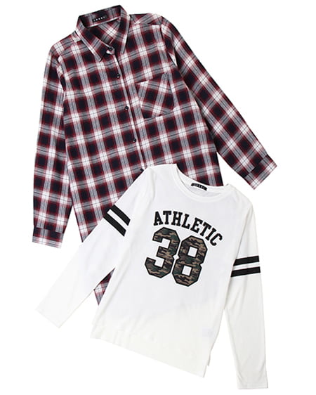 フロントにナンバリングロゴをのせたロングスリーブTシャツとカジュアルな雰囲気を放つチェック柄のロングシャツのSET☆ロングTシャツは着丈の前後差やサイドスリットなど、トレンドのディテールを盛り込んだオシャレなアイテムで、スタイリングのポイントになること間違いなし◎。ロングチェックシャツはワンピースとしてはもちろん、ボタンを開けて羽織れば、トレンドライクなスタイリングに早変わり。ストンと落ちるシルエットで、すっきりと着られるのが嬉しいポイントです。
