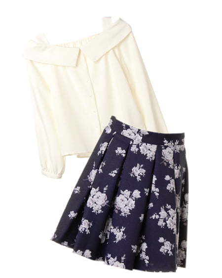 今シーズン欠かせないトレンドのオフショルダーブラウスとクラシックな雰囲気のフラワープリントが存在感たっぷりのフレアスカートのSET☆ブラウスは、折り返しのカラーが上品で愛らしく、小さめのボタンで大人ガーリーな雰囲気に。ON・OFF問わずに活躍すること間違いなしの1枚です。スカートは、タックフレアデザインで、ふんわりとしたフェミニンなシルエットに仕上げました。甘さを控えた花柄が、全体のコーディネートをワンランクアップさせてくれます。