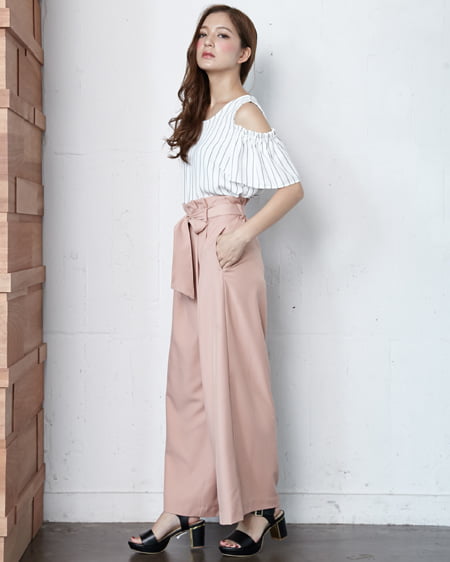 マルチストライプ肩開きTOPSとサッシュ付PeツイルワイドパンツのSET☆