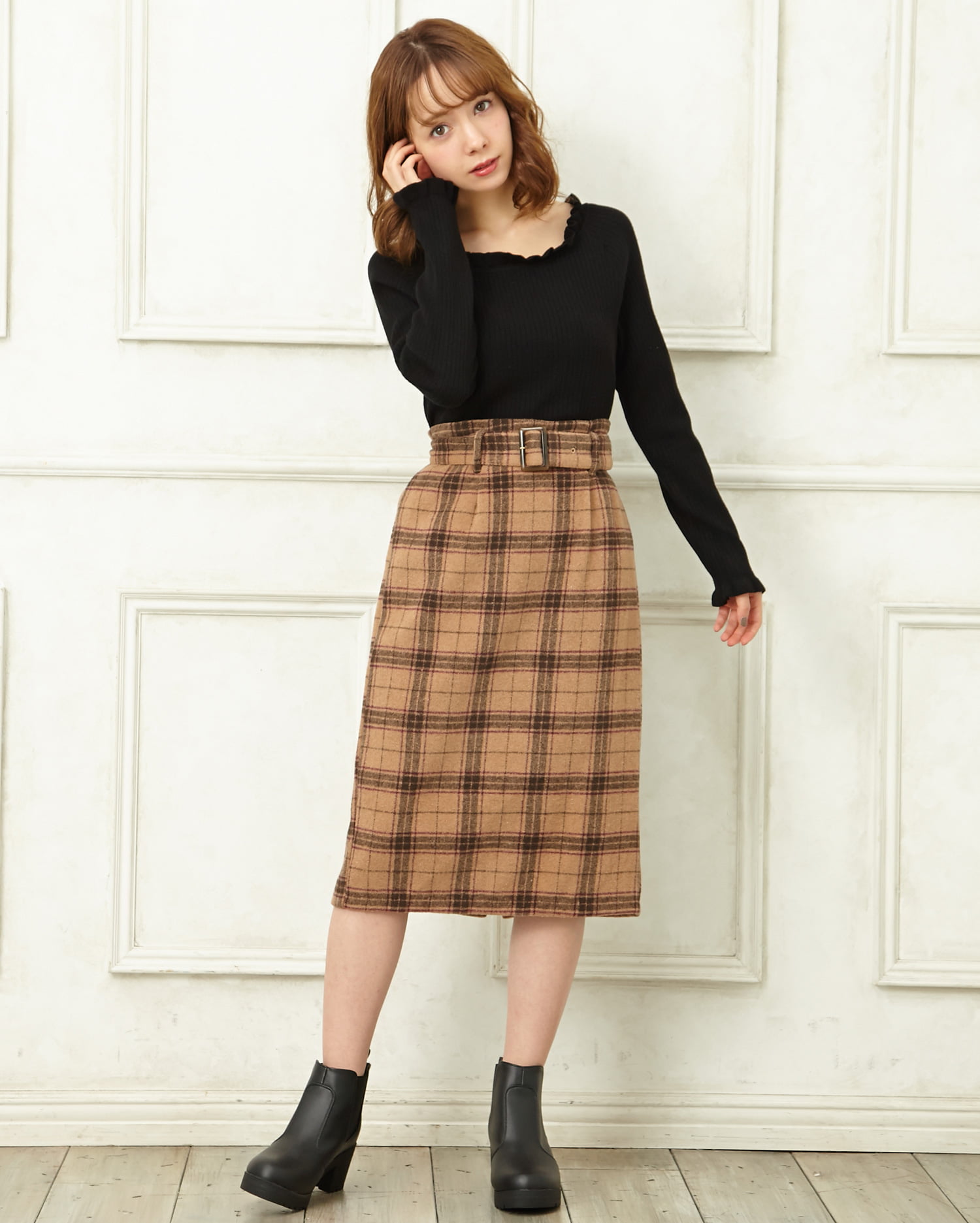 襟フリルリブニットとシャギーチェック柄ナロー/スカートのSET☆