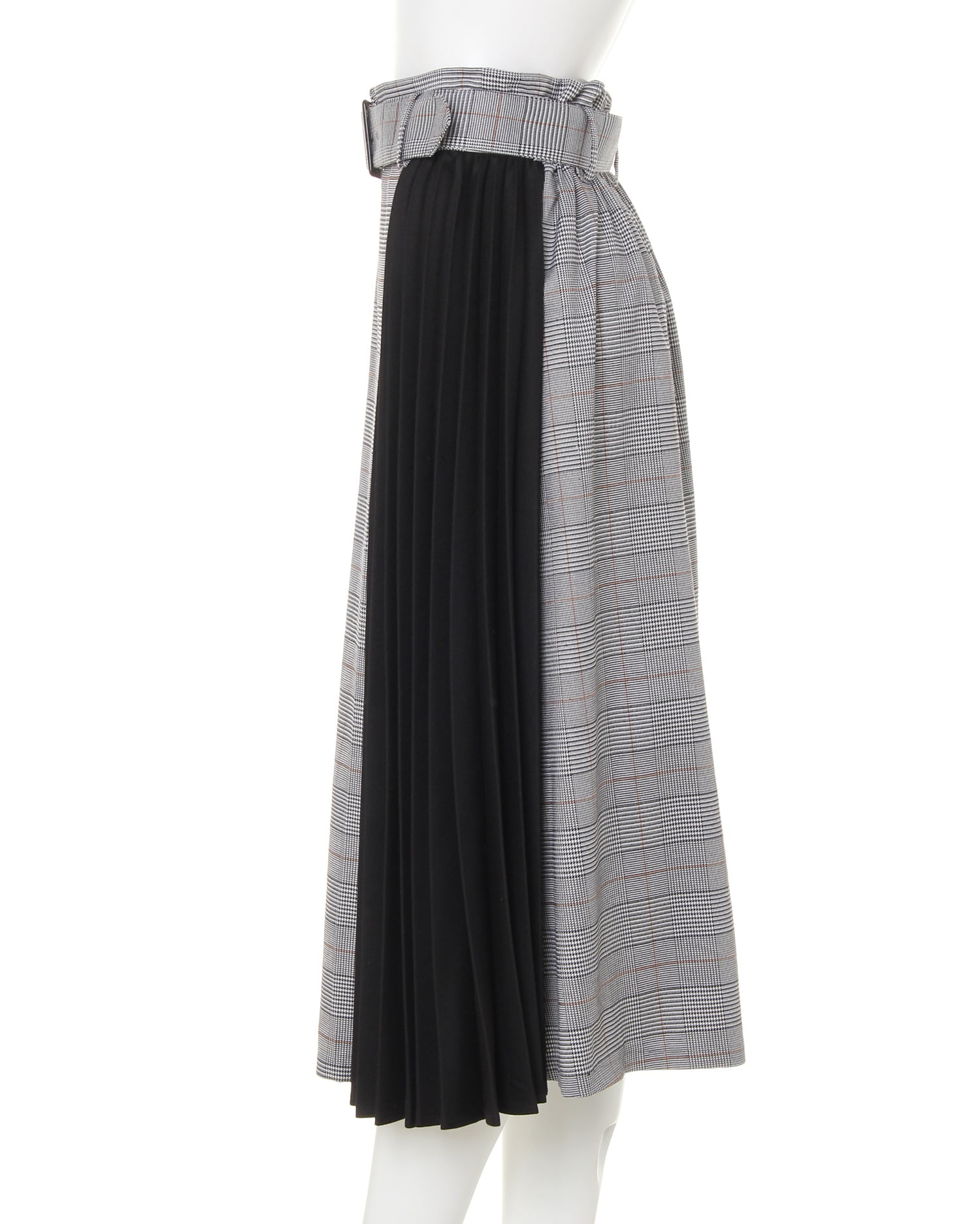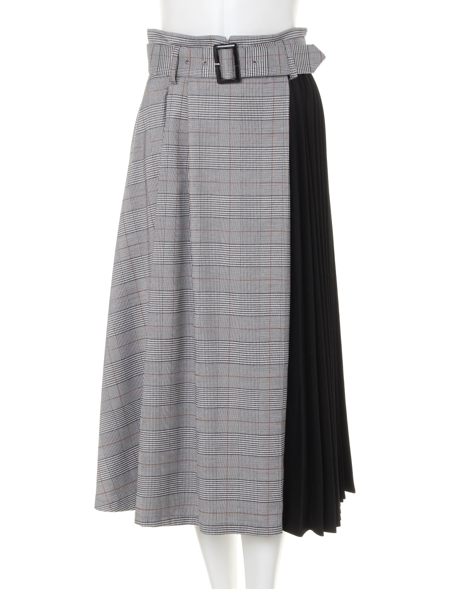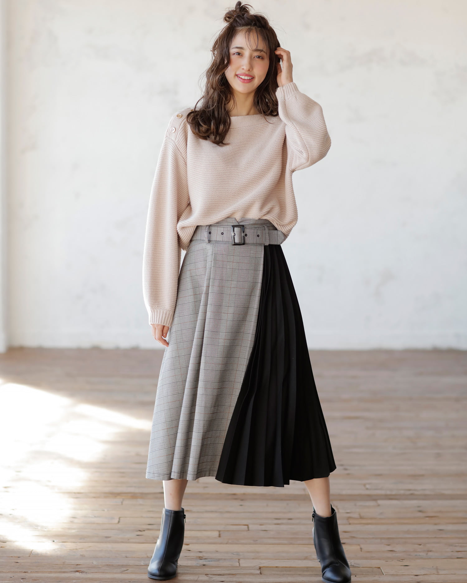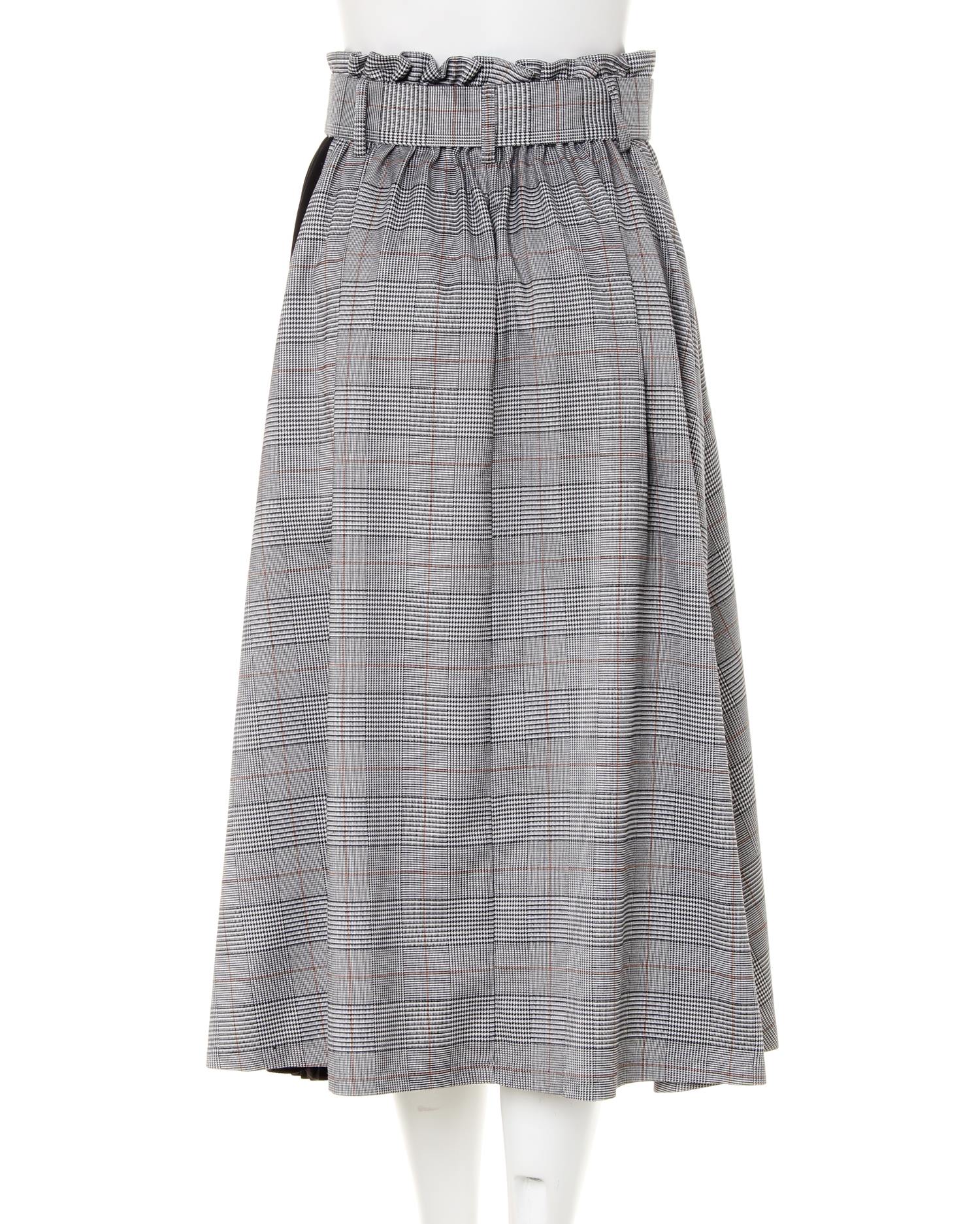 ガーター肩ボタン/ボートネックニットと配色チェック柄ミディ/スカートのSET☆