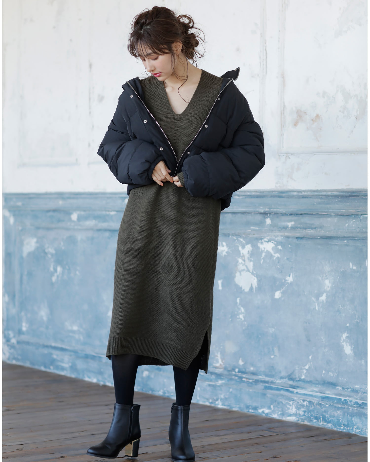 ガーター編みニットロングワンピースとBIGフード/ショートエコダウンのSET☆