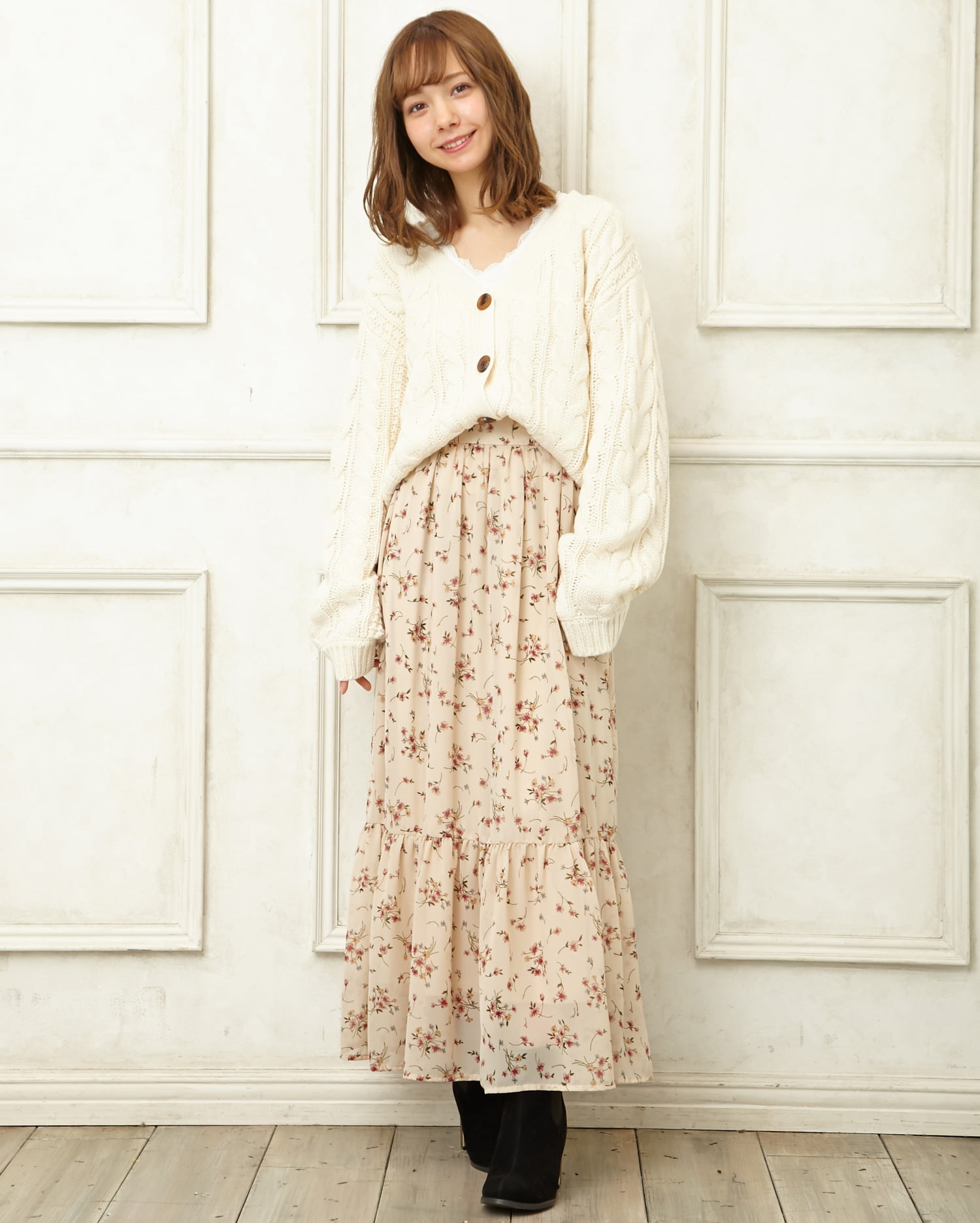 ケーブルショートVネックカーディガンと花柄シフォンティアードロング/スカートのSET☆