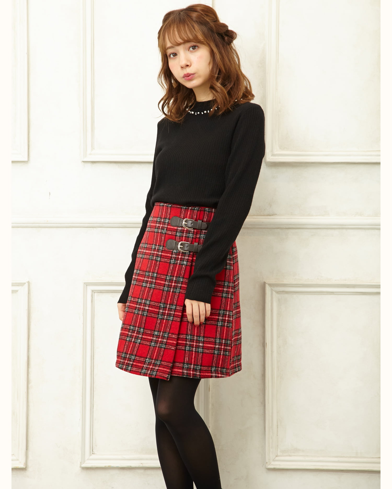ハイネック装飾付/ニットとサイドベルトチェック柄台形/スカートのSET☆
