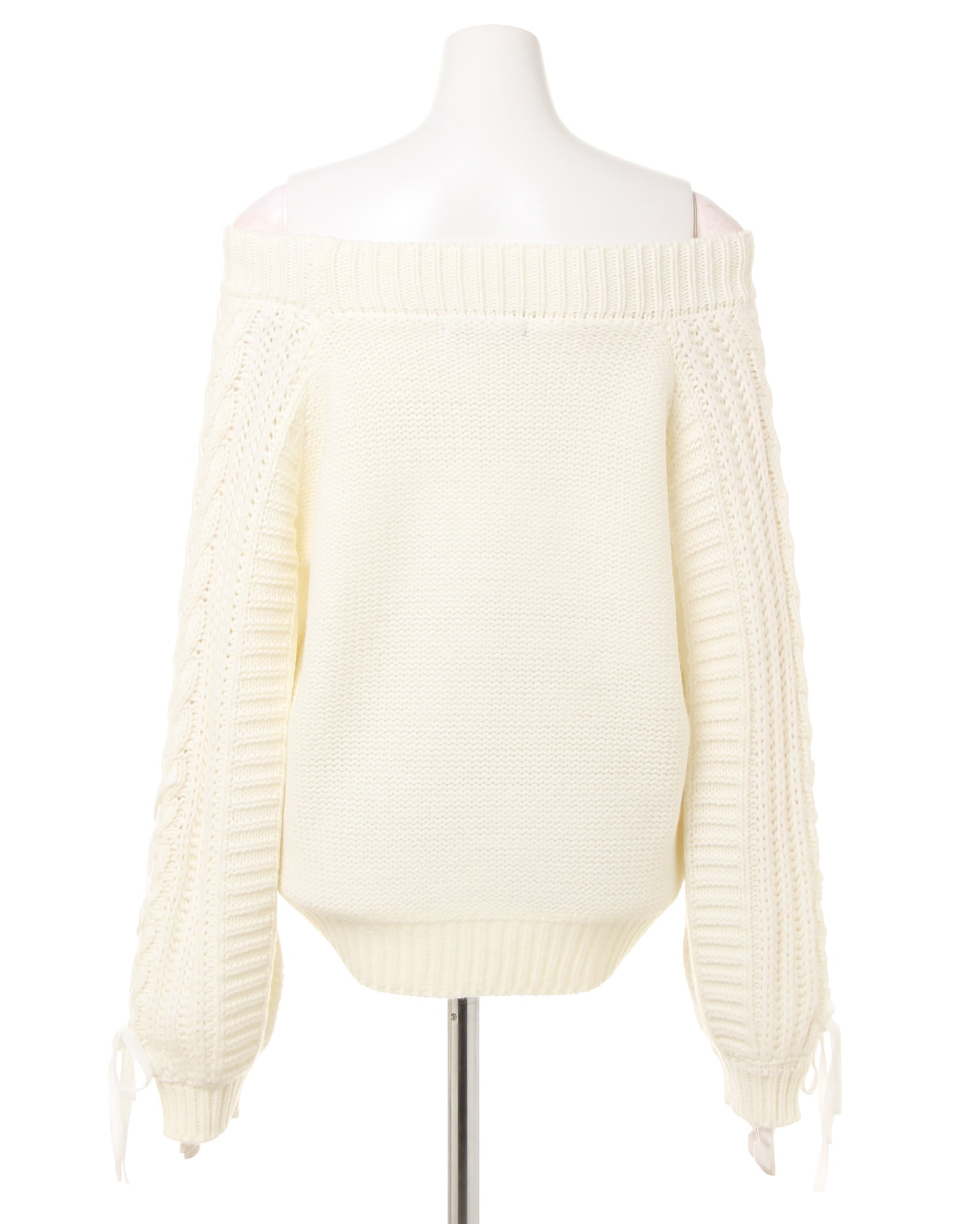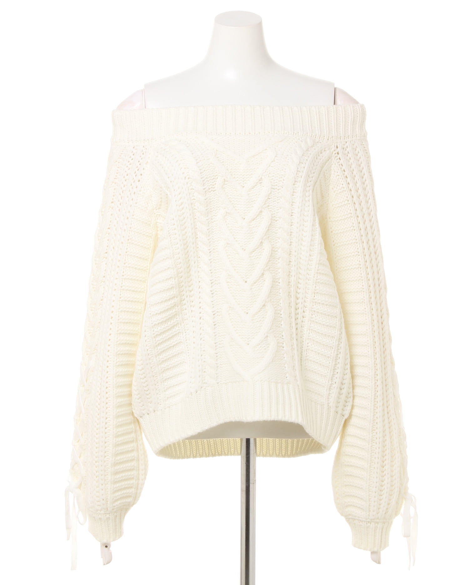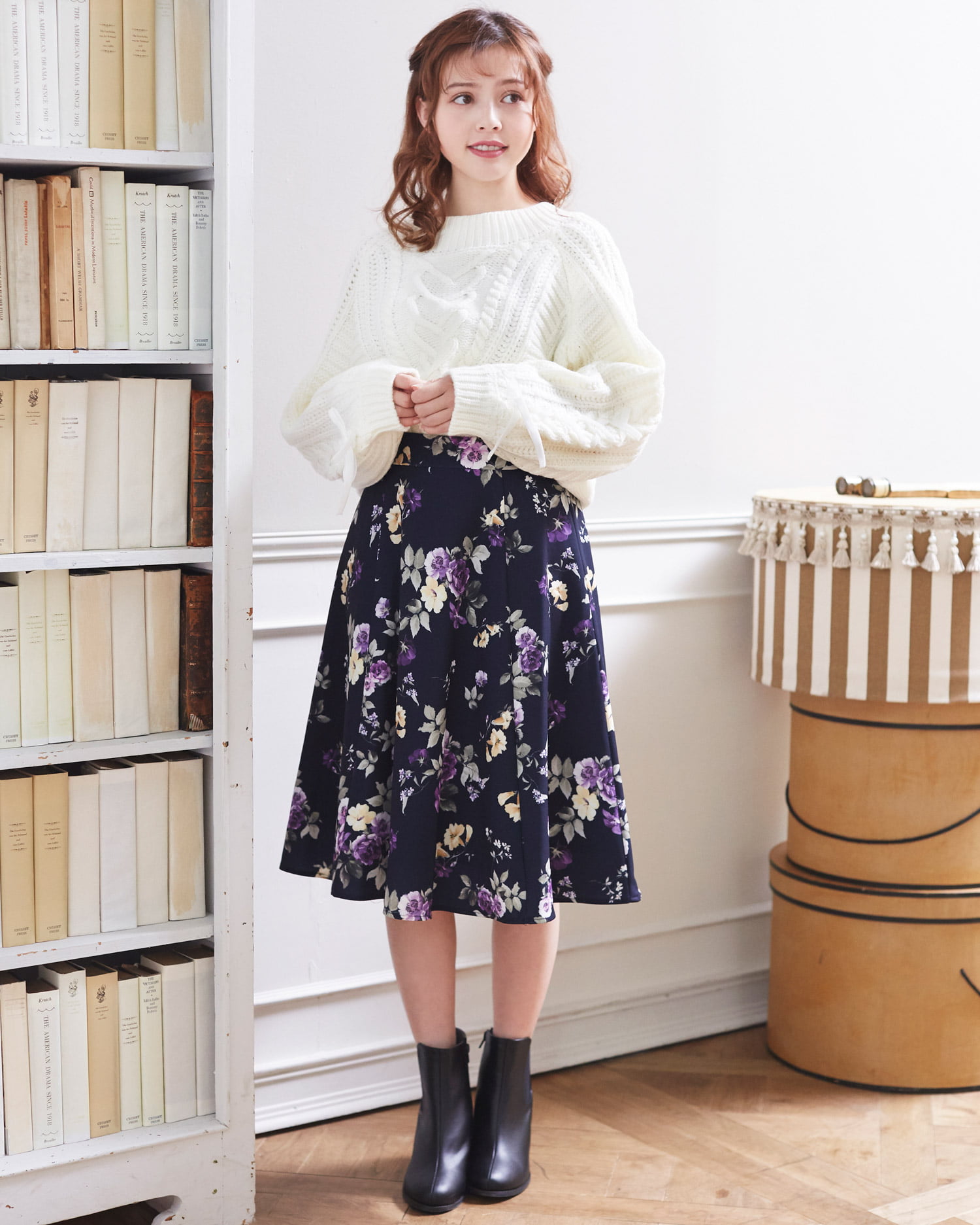 ベロアレースアップ袖オフショルニットと花柄ミディスカートのSET☆