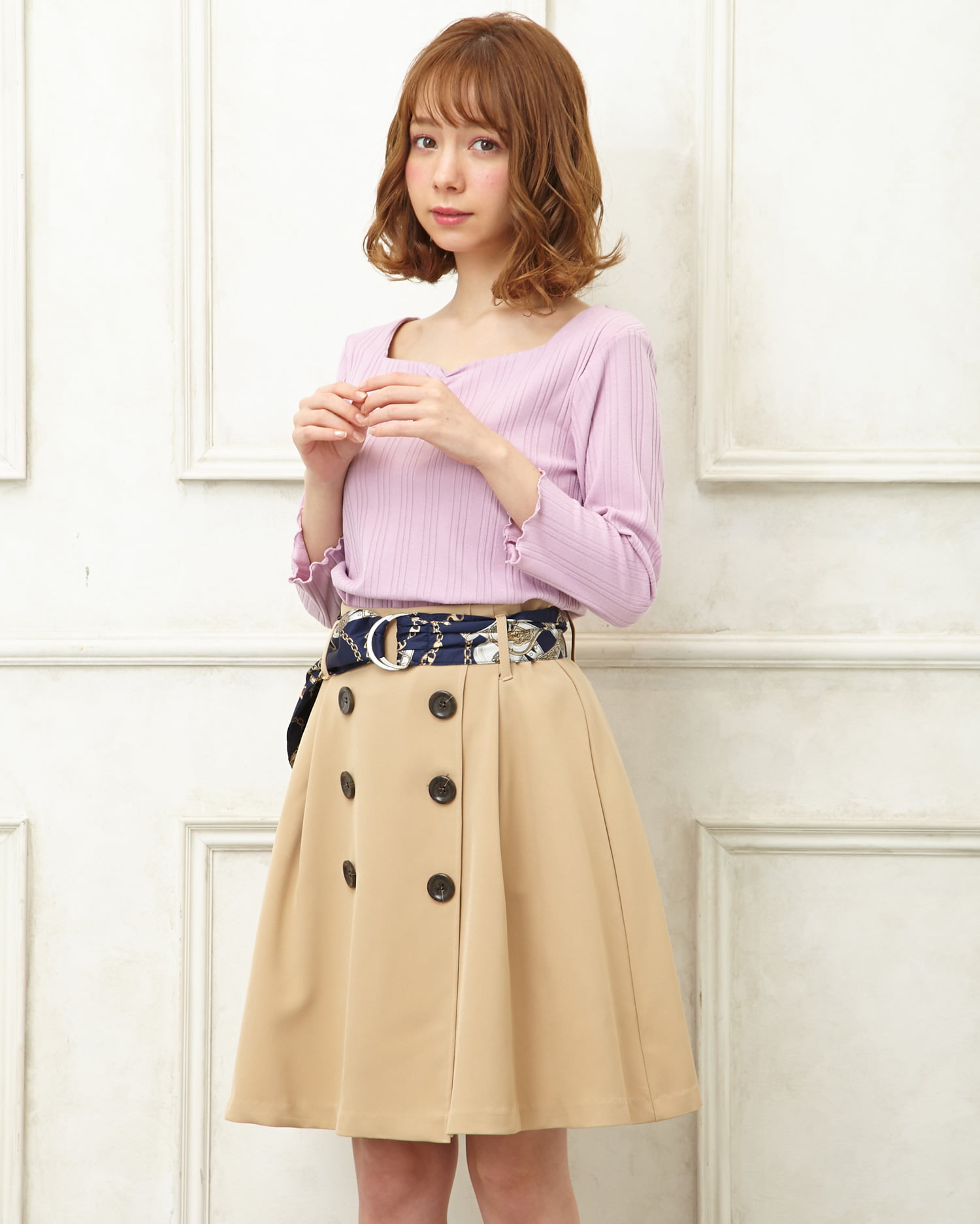 イレギュラーリブスクエアネックトップス/7分袖と柄サッシュ付トレンチミニフレア/スカートのSET☆