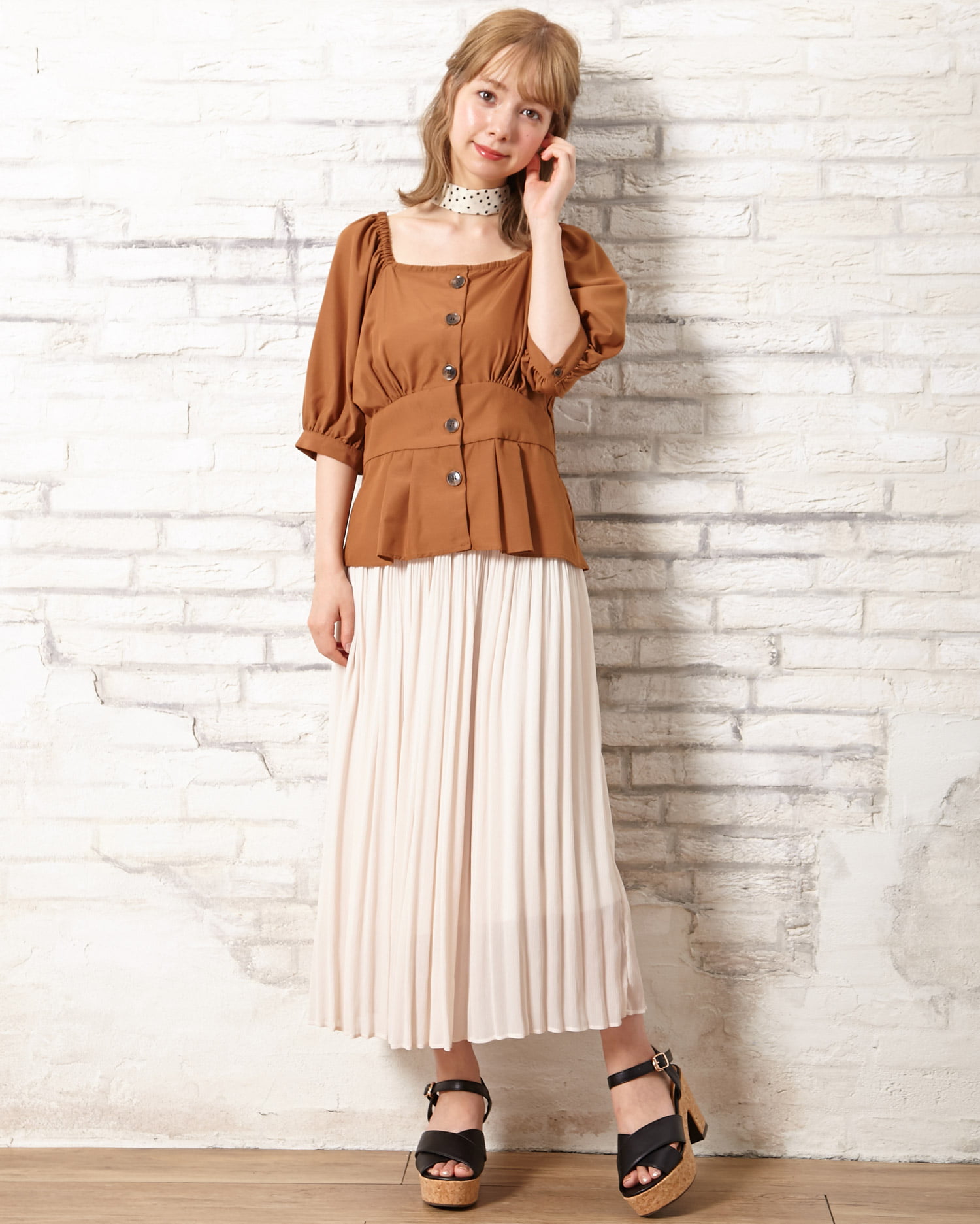 スカーフ付サテン前ボタンペプラム/トップスと楊柳プリーツ/スカートのSET☆