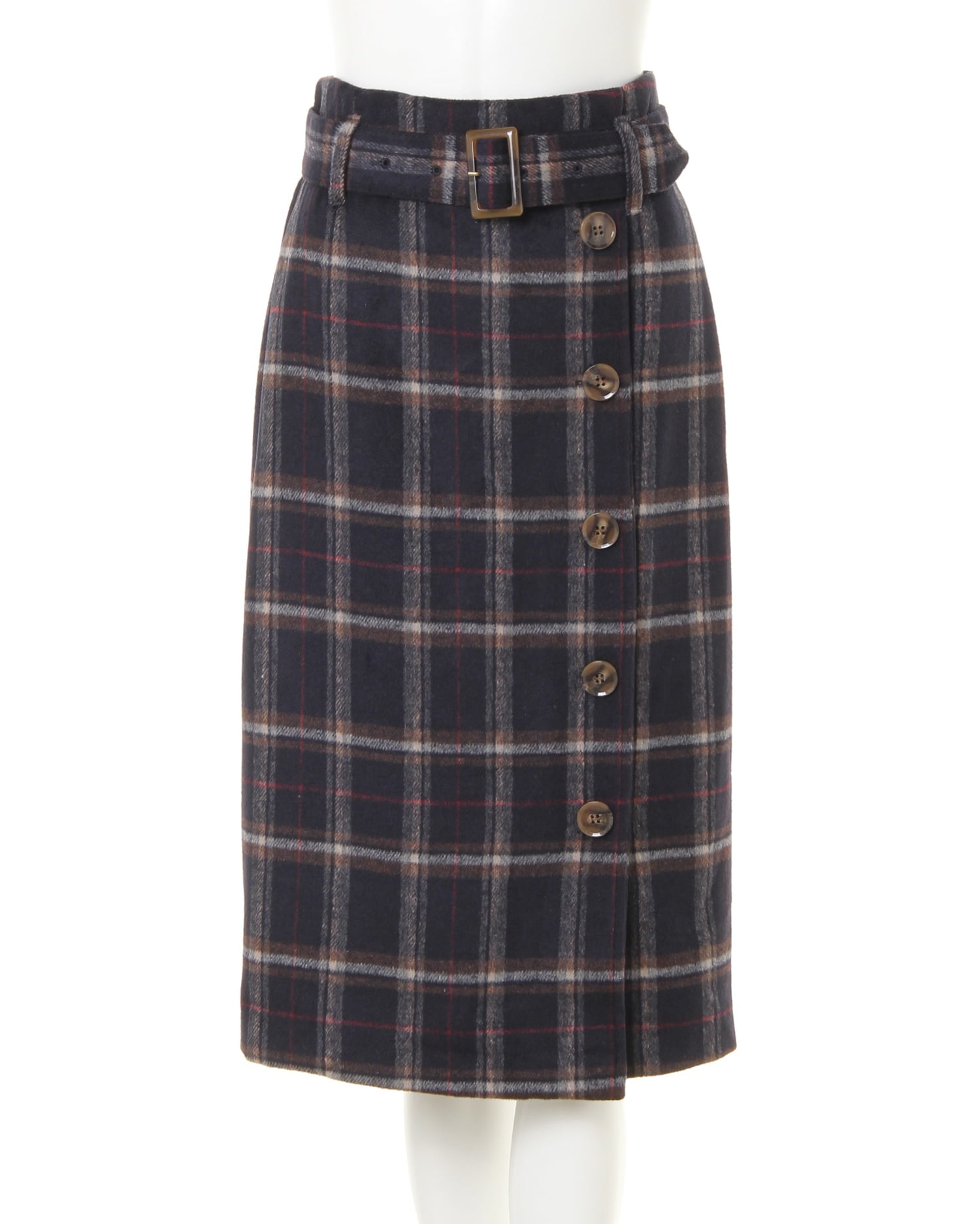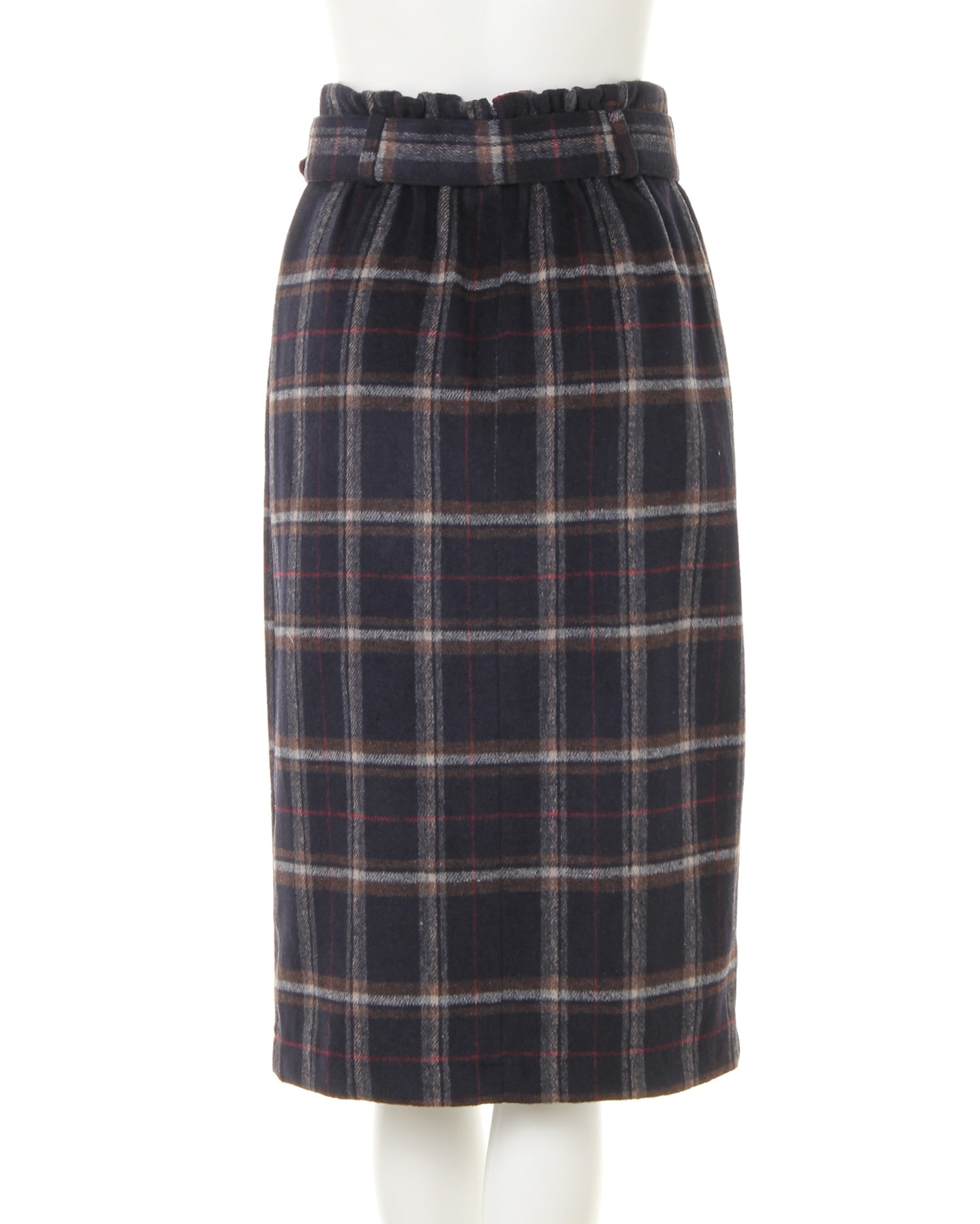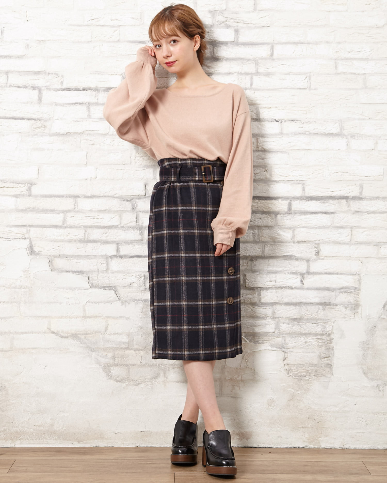 ボートネックボリューム袖ニットとベルト付シャギーチェックナロー/スカートのSET☆