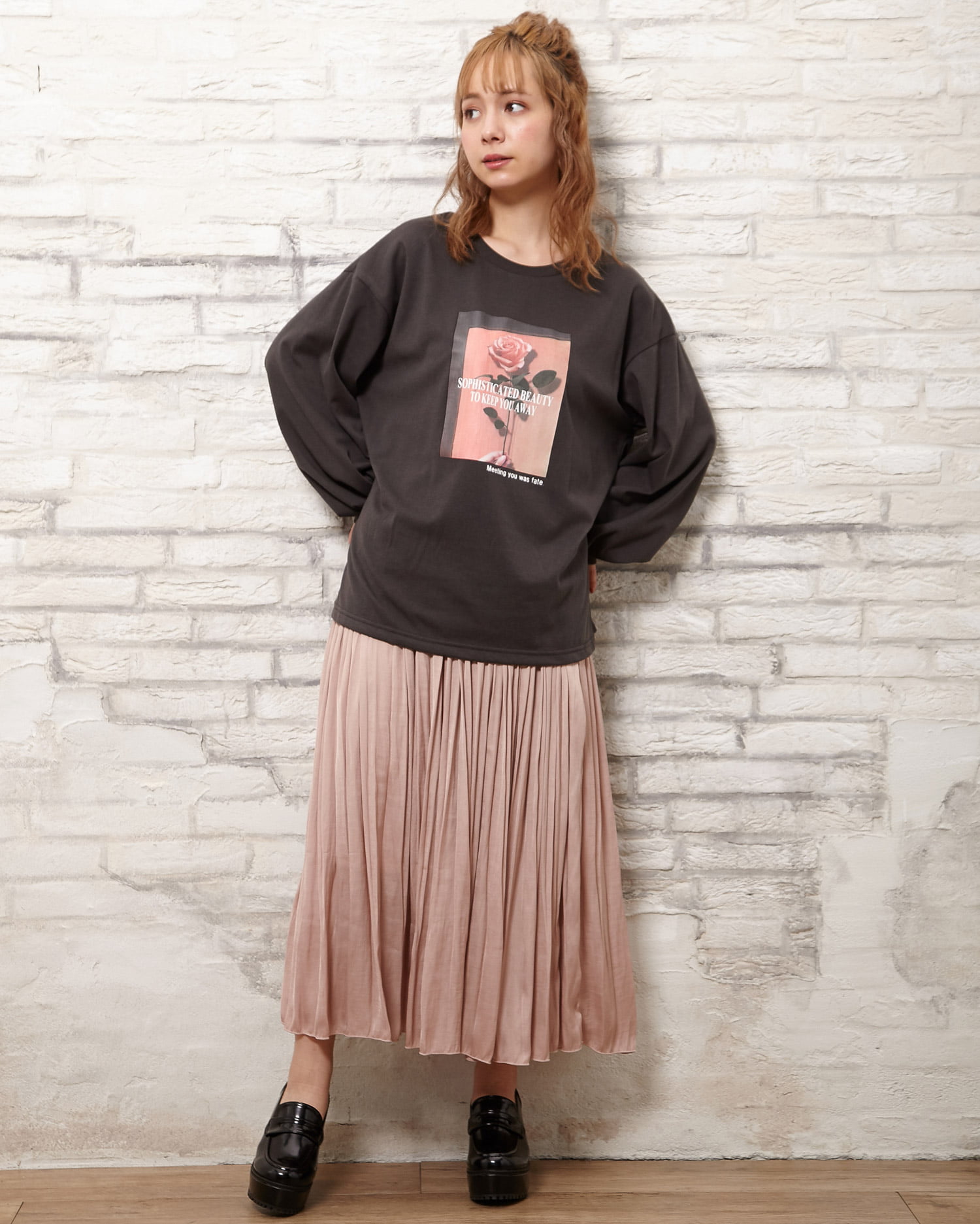 スウェット/フラワーフォトプルオーバーとサテン/プリーツスカートのSET☆