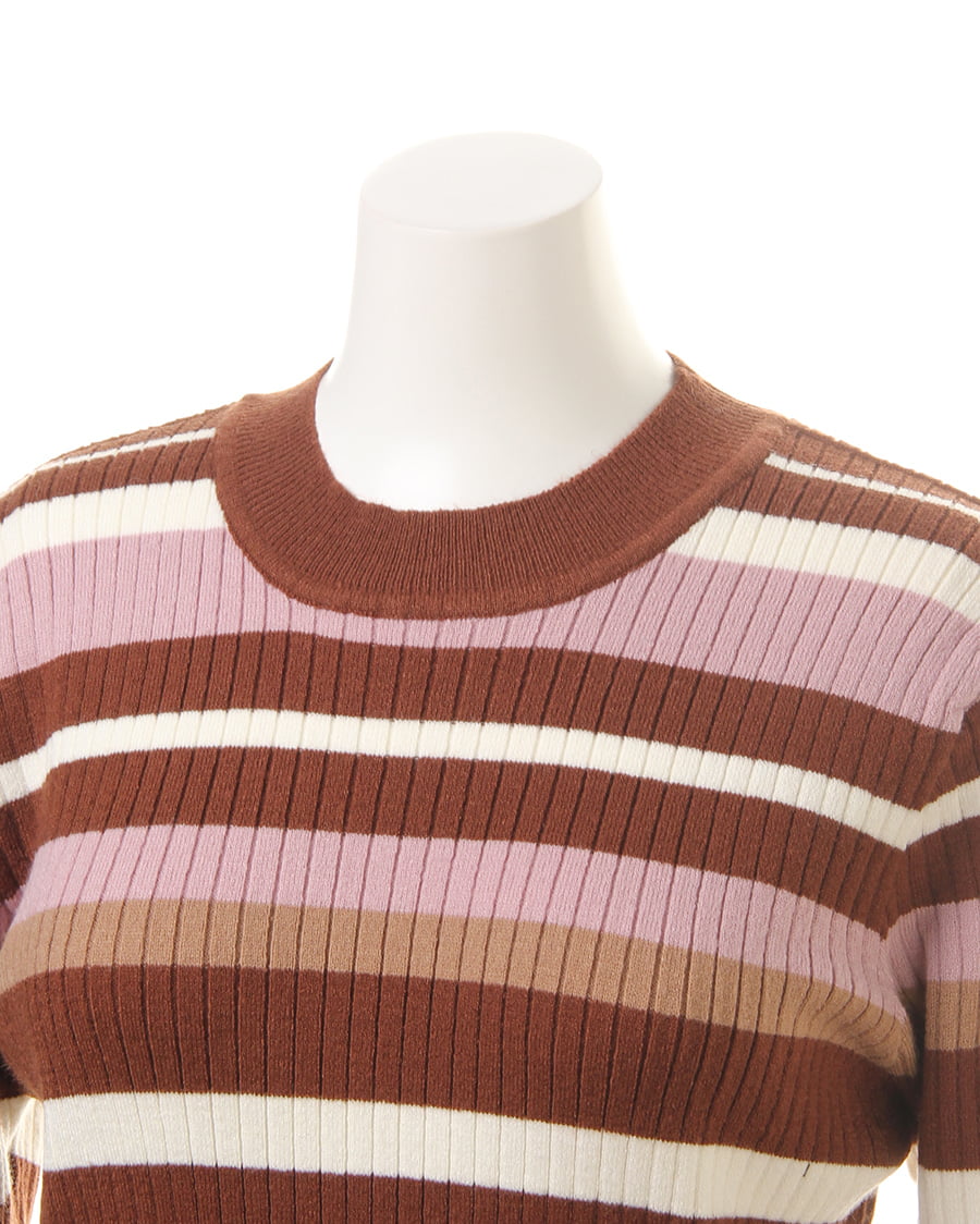すっきりとしたクルーネックのボーダーニットは、カジュアルスタイルの定番アイテム。ボディに沿うような伸縮性のある生地は、上半身をすっきり見せてくれる効果も。細めのリブで子供っぽくなりすぎず、上品に着こなせます。全体にあしらった、マルチボーダーのカラー切り替えがアクセント。ブルゾンのインにも活躍の薄手のニットは、1枚持っていると重宝。
