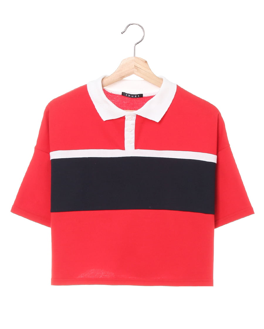 インパクトのあるカラーコントラストで魅せる技ありトップスが登場。スポーティなラガーシャツをベースに裾丈を短くしてデザイン性をプラスした1枚です。すっきり感のある襟元はボタンを開けて着こなすのも◎。ハリ感のある固めの生地がシルエットをキレイにキープ。人気のハイウエストボトムにもバランス良く合わせられるのも嬉しいポイントです。