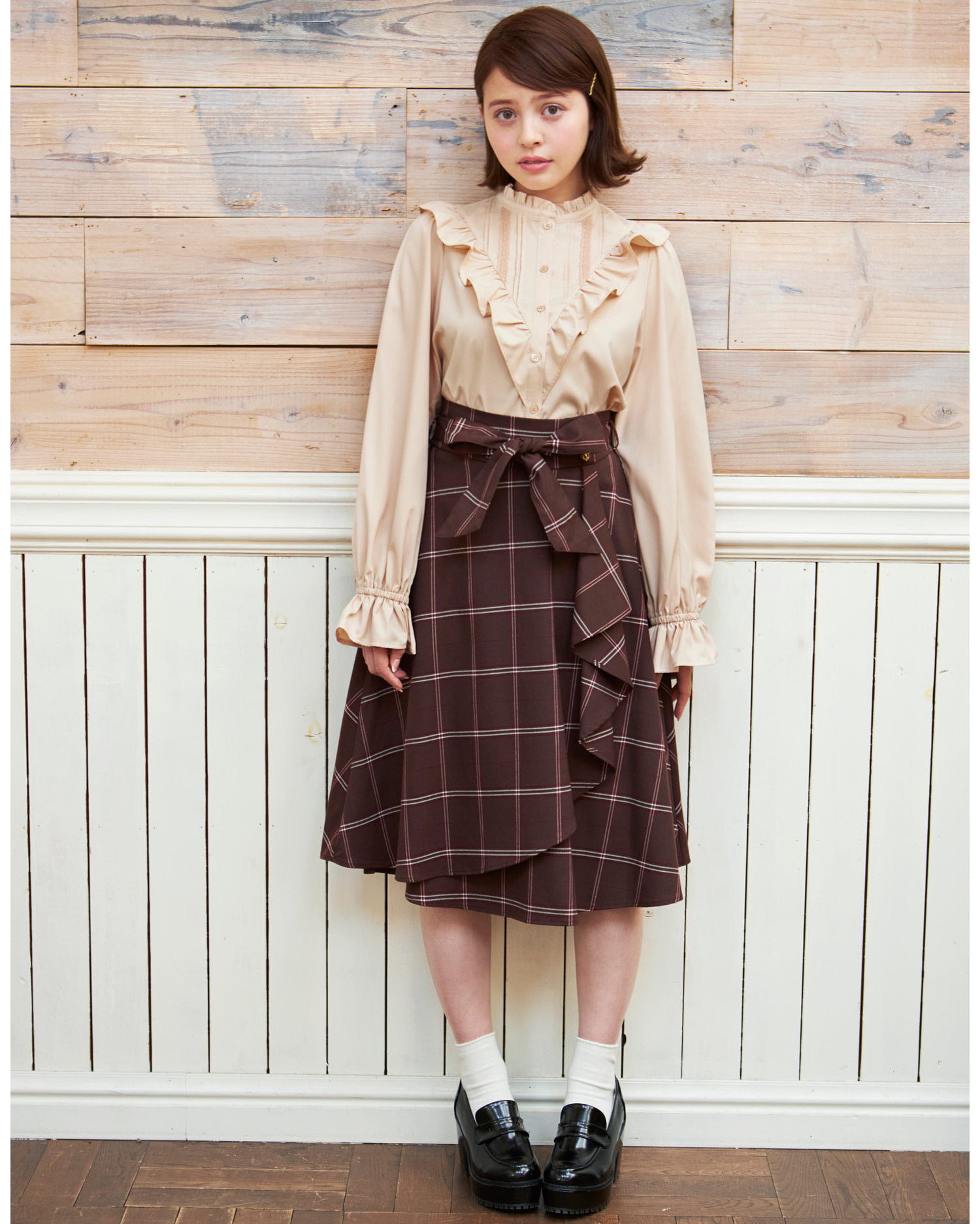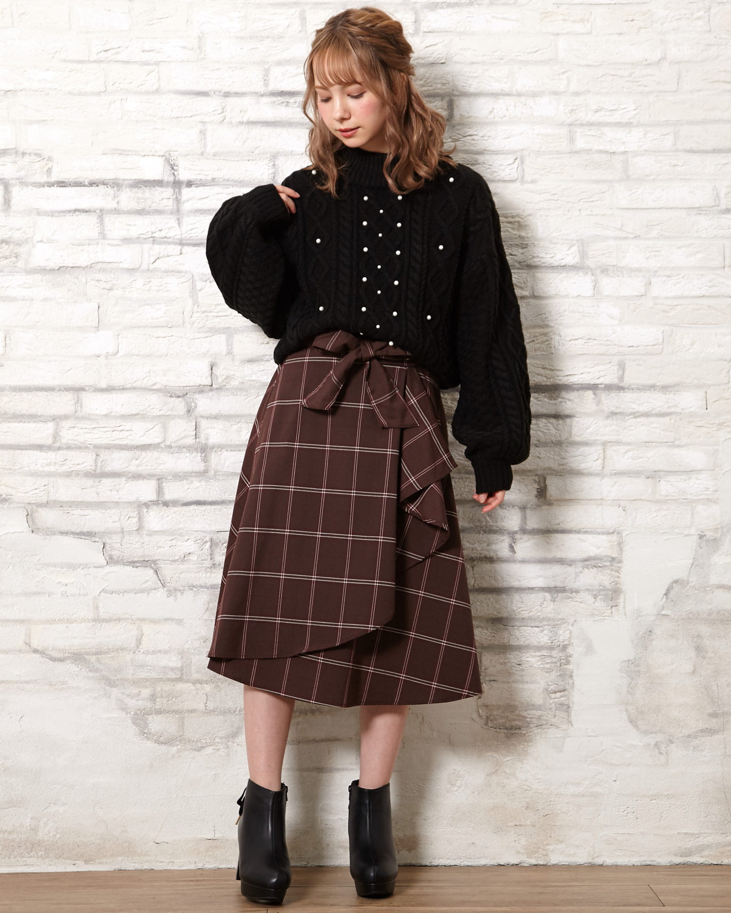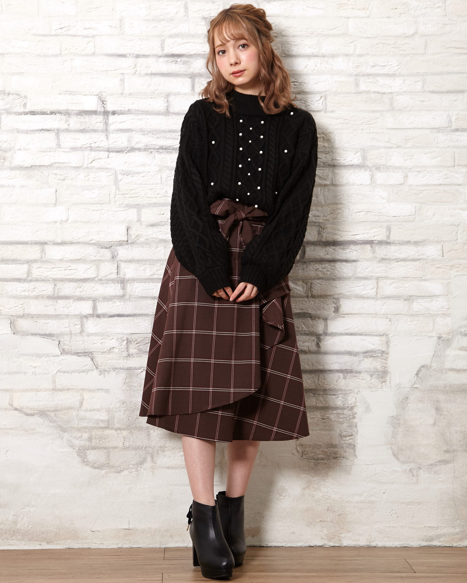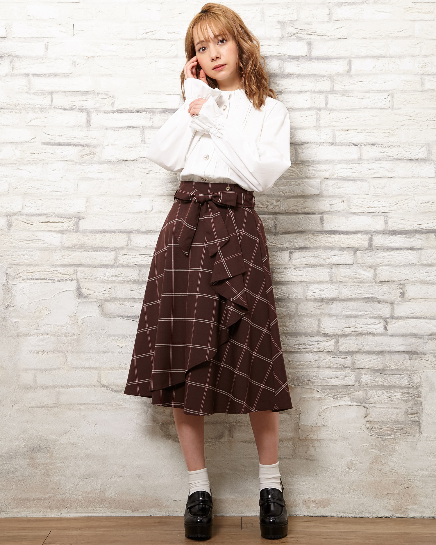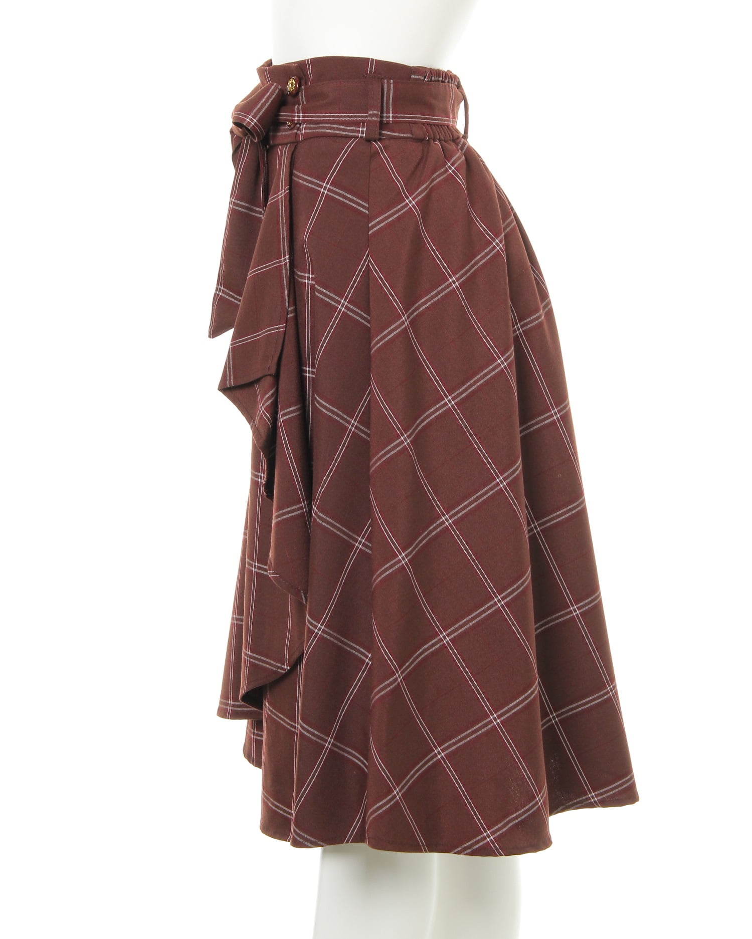 落ち着いたカラー使いできちんとした雰囲気のあるスカートはオンオフ問わず着まわせて便利。フロント部分のアシンメトリーなドレープが表情豊かな着こなしを叶えます。裾に向かって広がるシルエットで気になる太ももを自然にカバーしてスタイルアップ効果も◎。ミディ丈でバランスの取れたコーディネイトが仕上がります。サイドのコロンとした飾りボタンがクラシカルなアクセント。