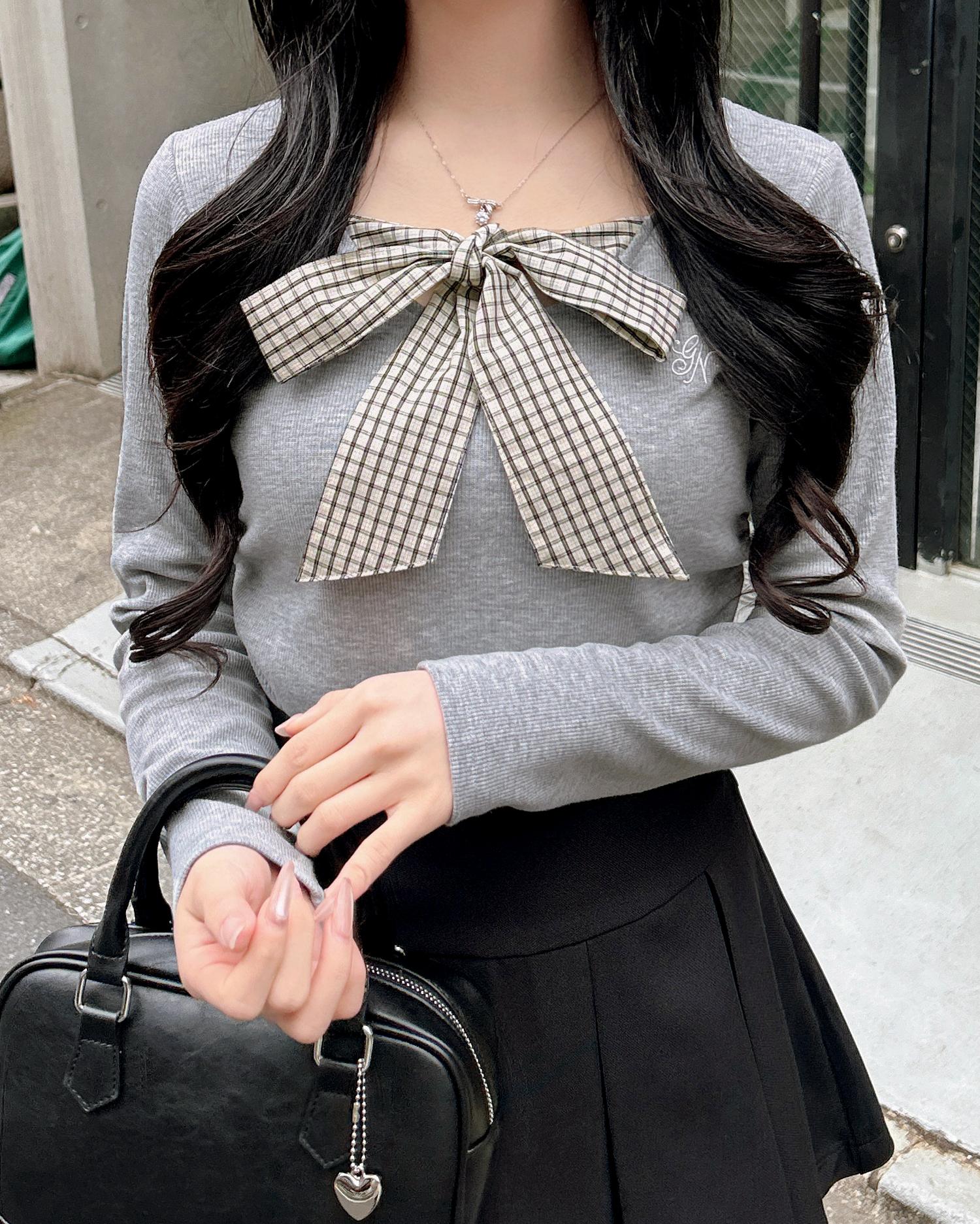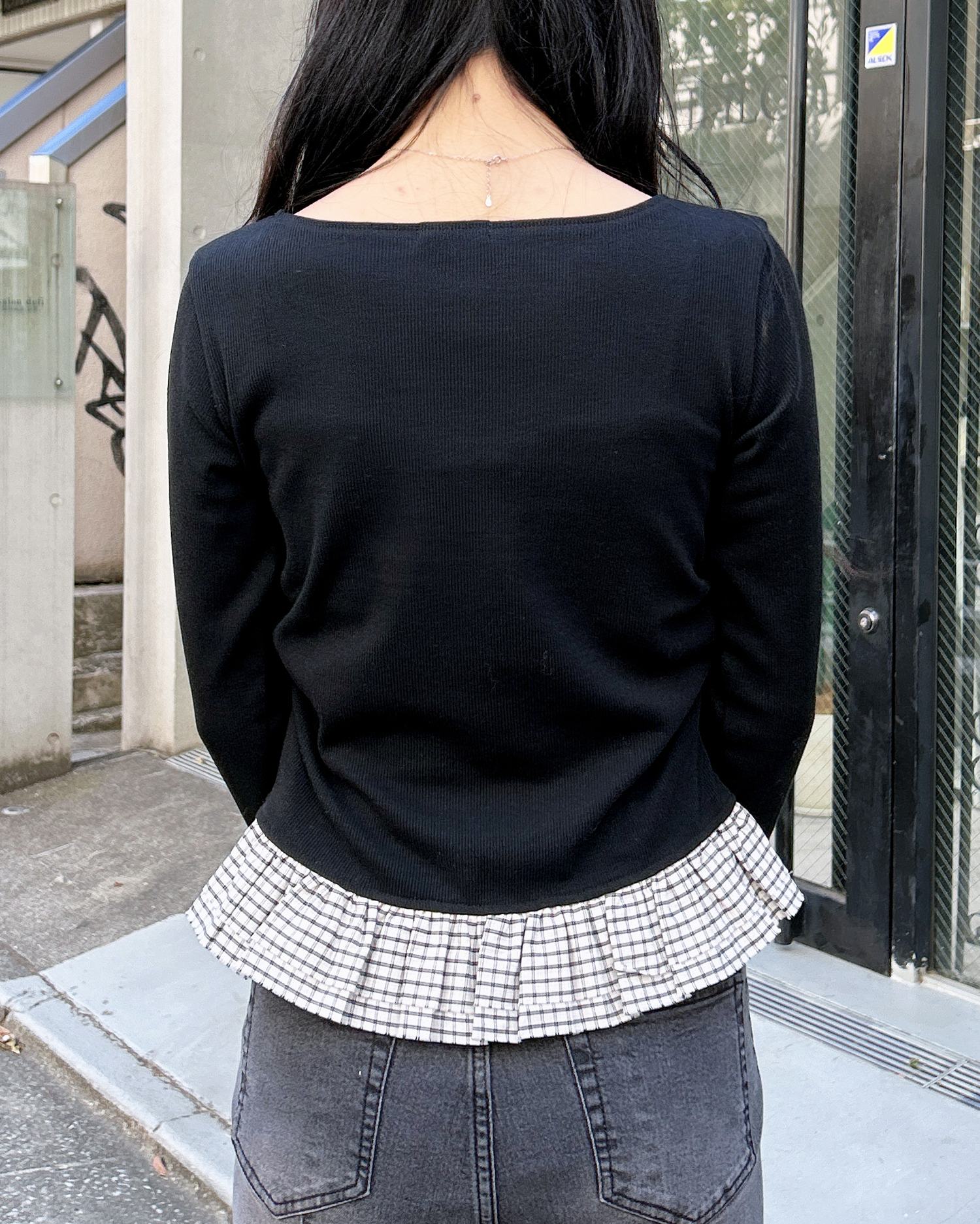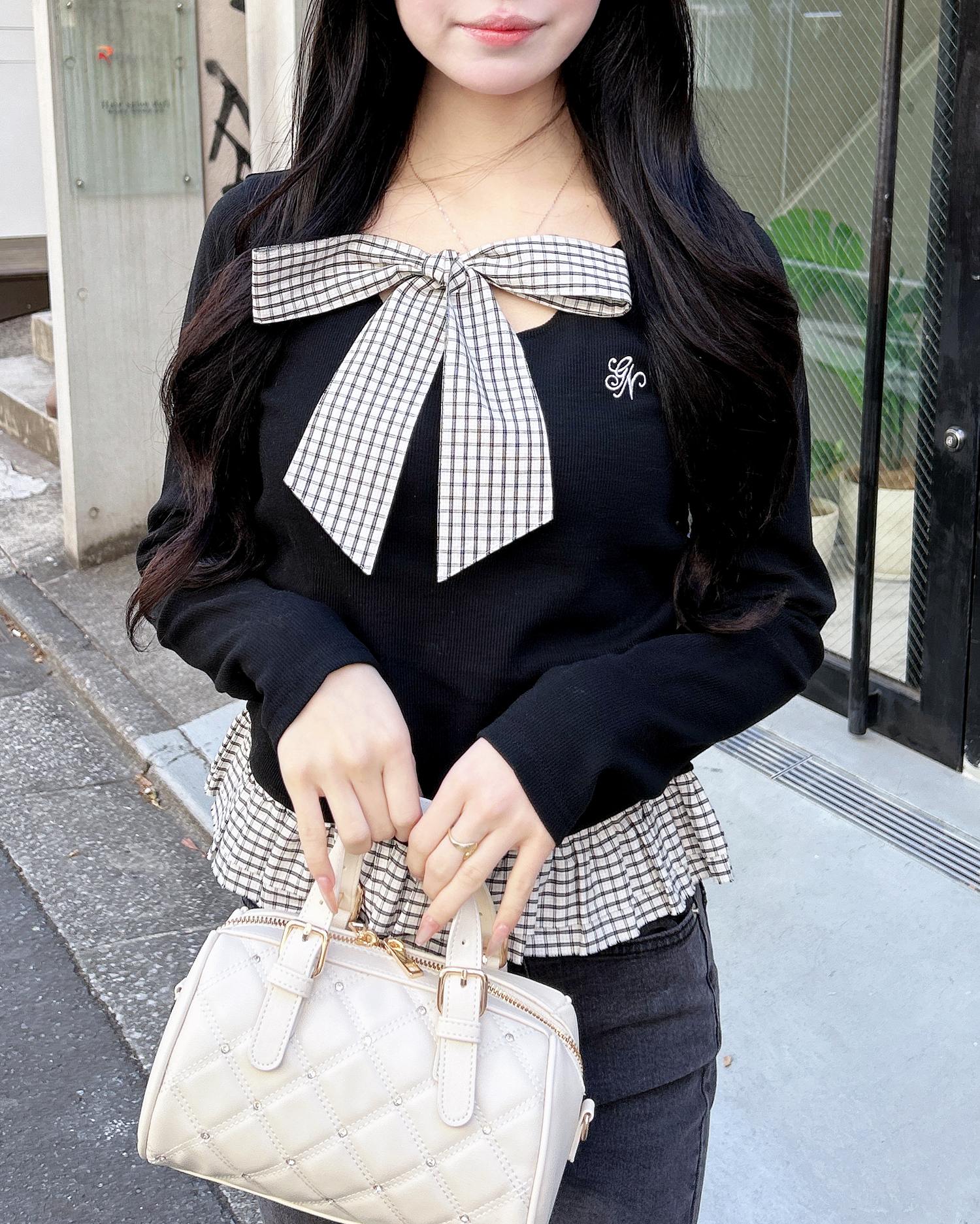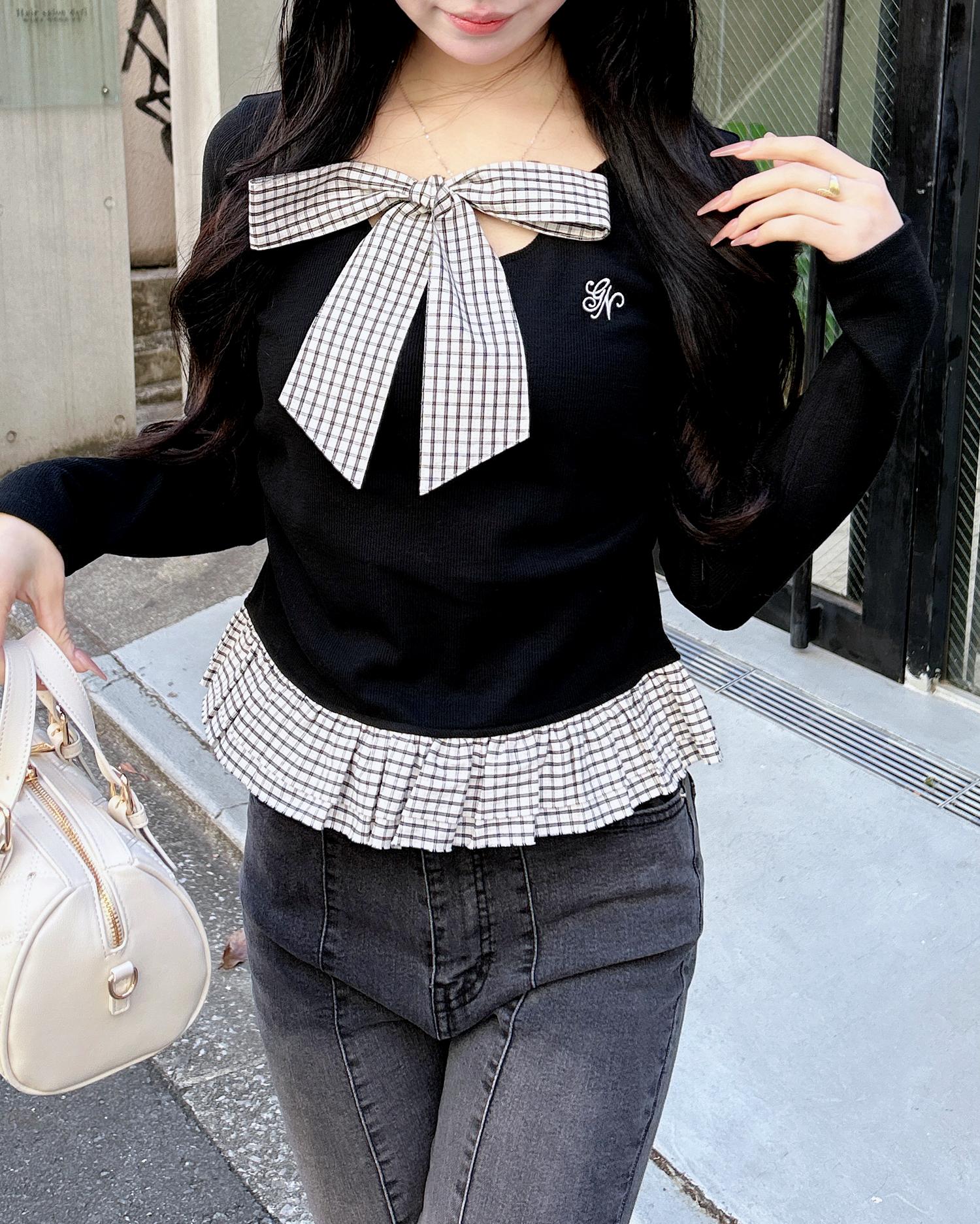 伸縮性抜群のリブカットソーにチェック柄のリボンと裾のフリルでアクセントをプラス。