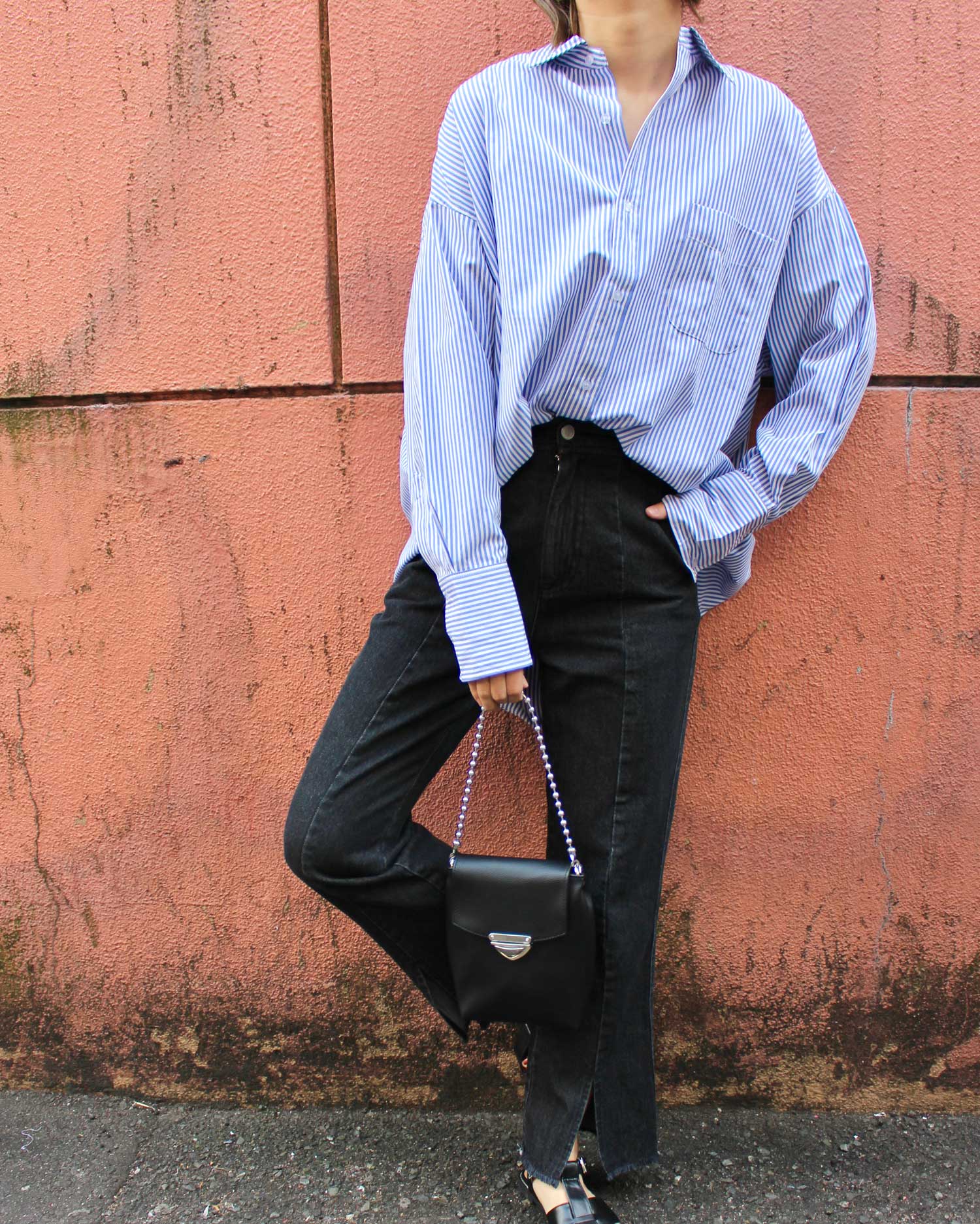 カジュアルスタイルの定番デニムはフロントスリットで抜け感をプラス。
