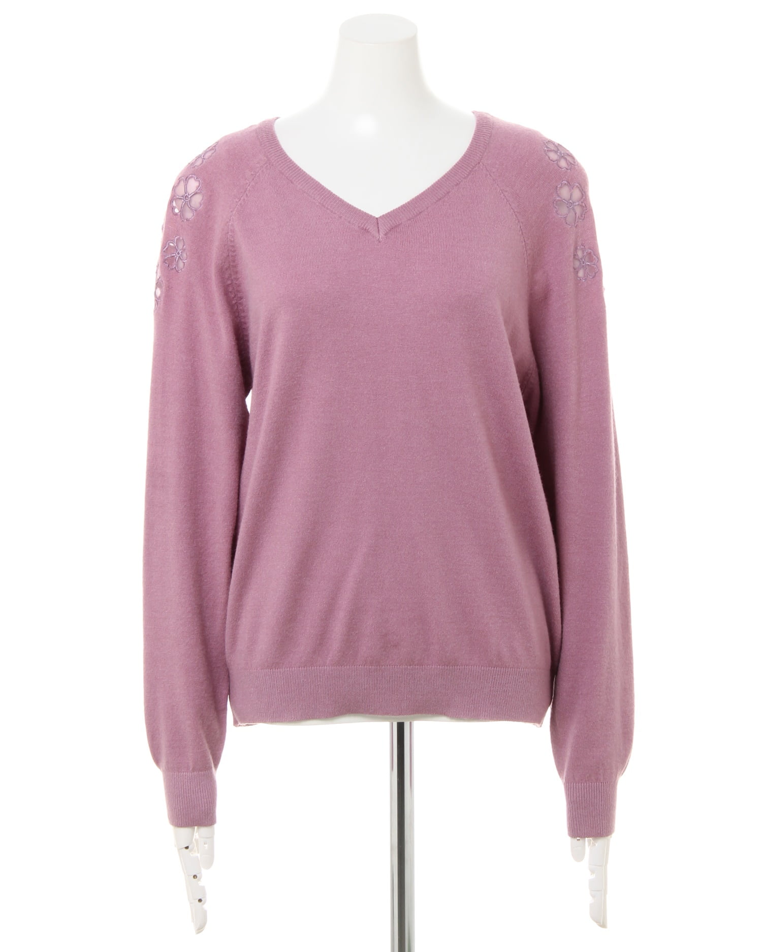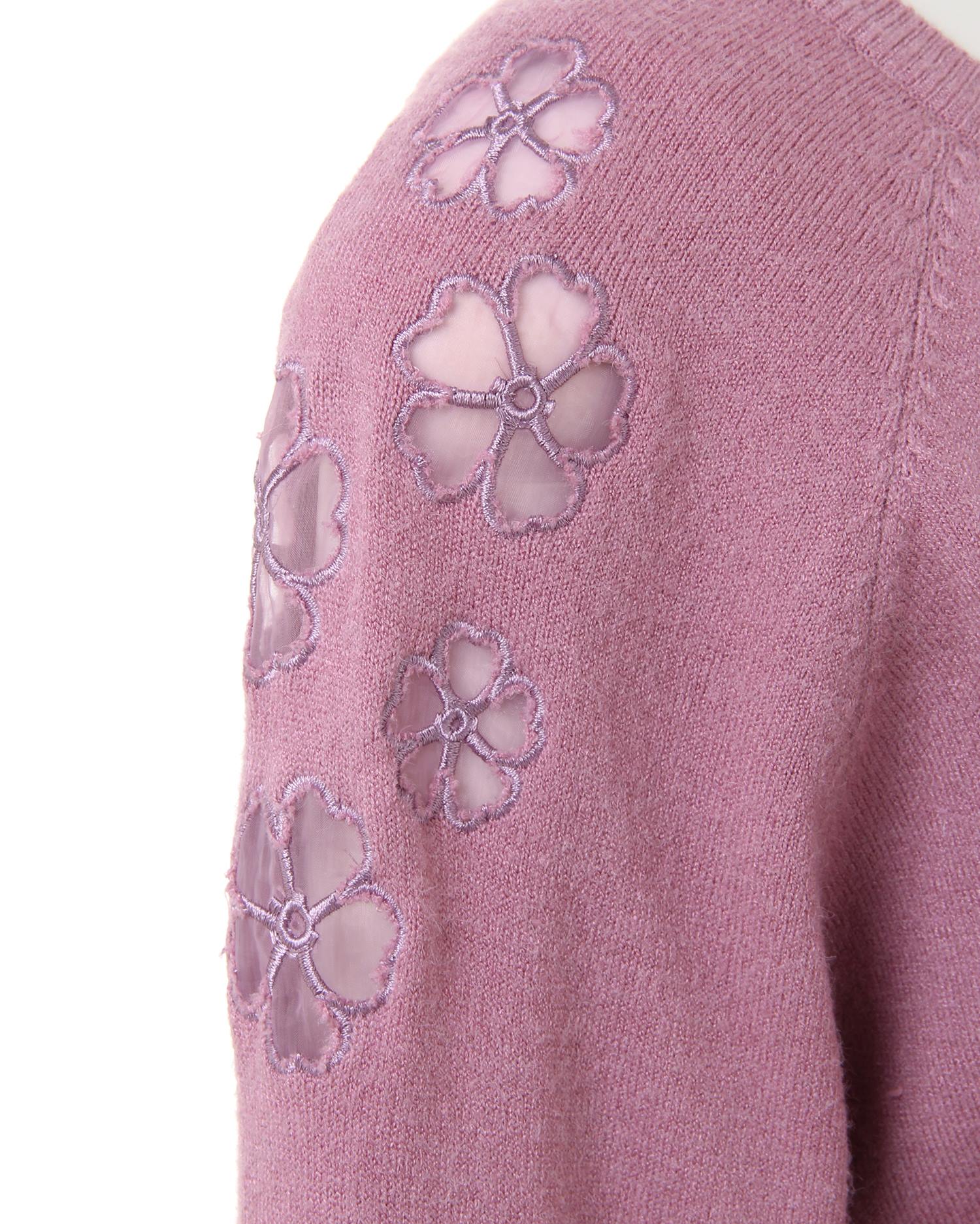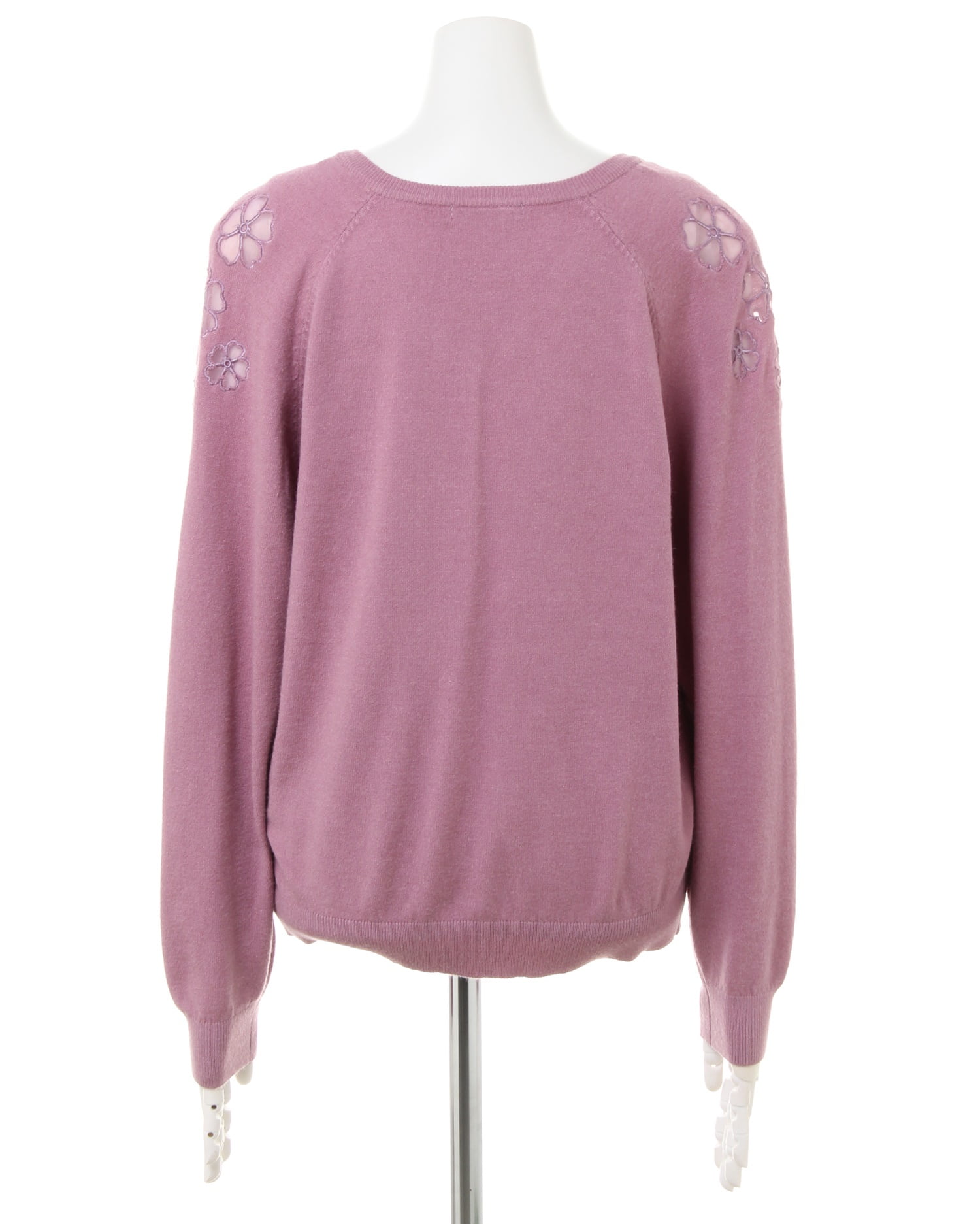 大きめのフラワーから覗く素肌でフェミニンなコーディネイトが完成するニットプルオーバー。程よく開いたネックラインとシアーなフラワーの組み合わせで、顔周りを明るく華やかに彩ります。コンパクトなシルエットで合わせるボトムを選ばないのもポイント。薄手のニットは1枚で着るのはもちろん、ジャケットやアウターのインナーとしても活躍します。