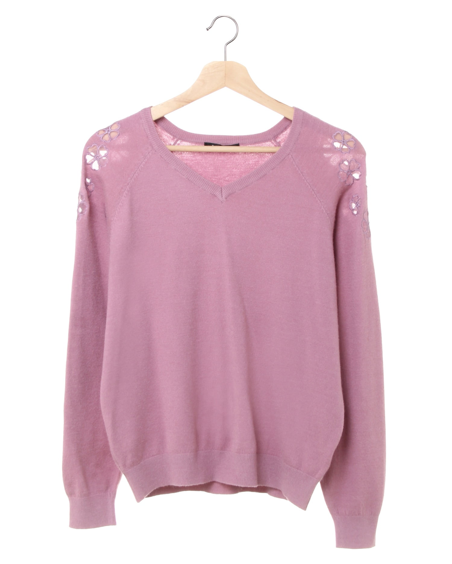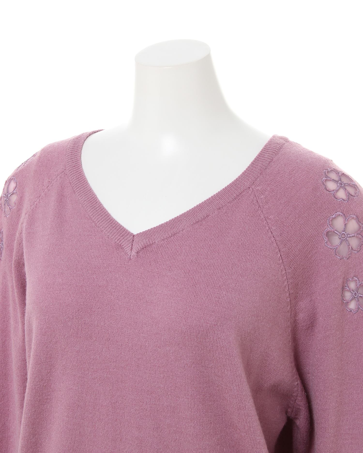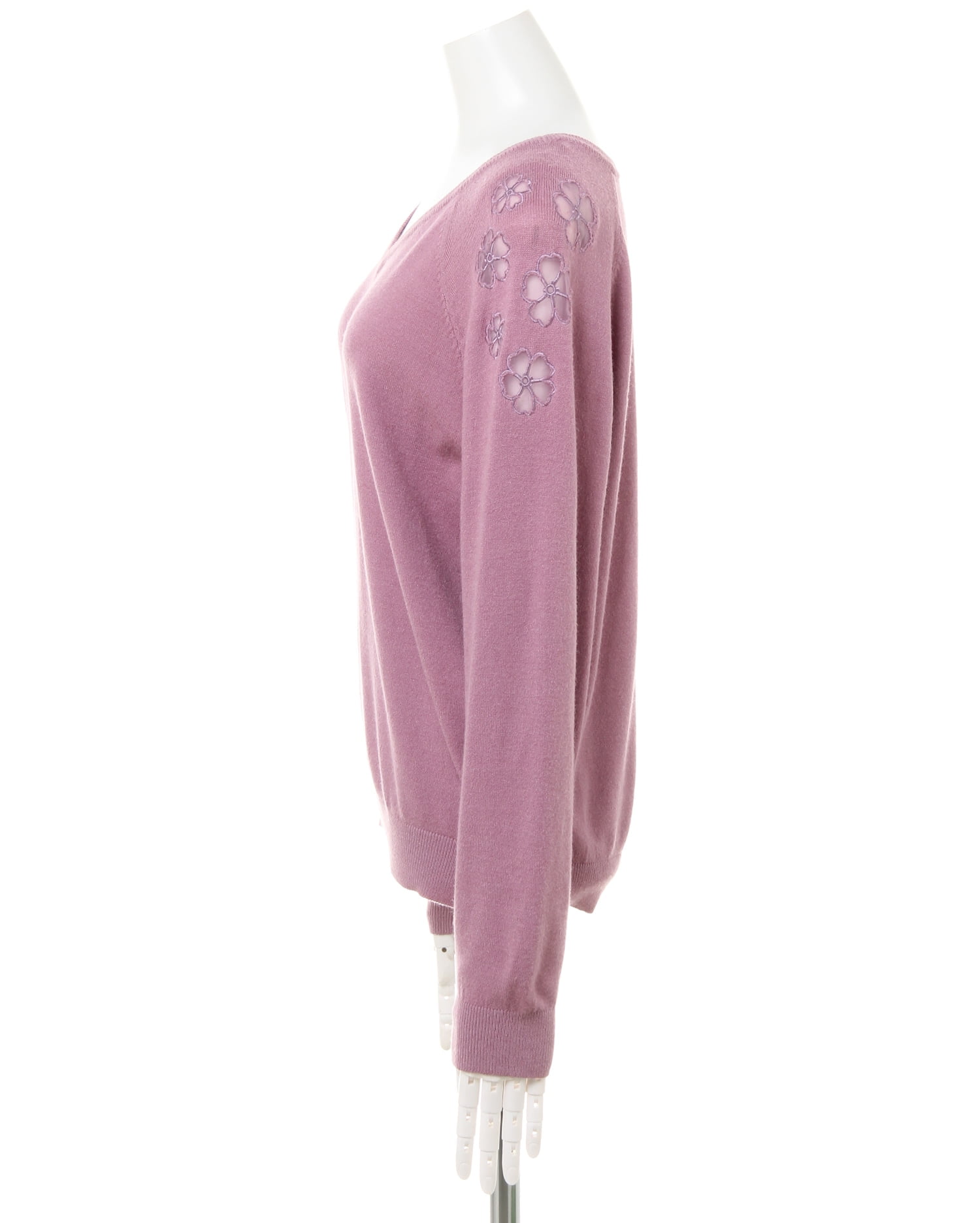 大きめのフラワーから覗く素肌でフェミニンなコーディネイトが完成するニットプルオーバー。程よく開いたネックラインとシアーなフラワーの組み合わせで、顔周りを明るく華やかに彩ります。コンパクトなシルエットで合わせるボトムを選ばないのもポイント。薄手のニットは1枚で着るのはもちろん、ジャケットやアウターのインナーとしても活躍します。