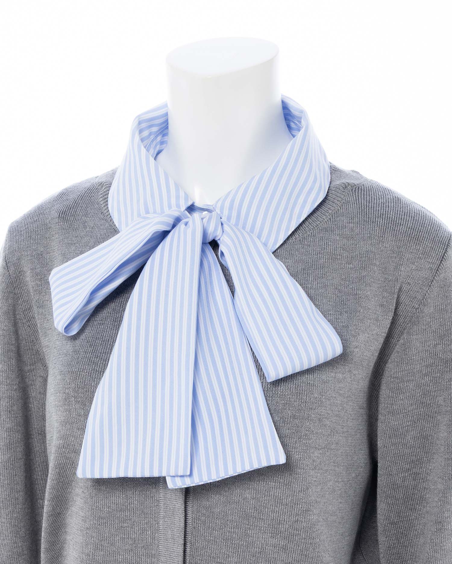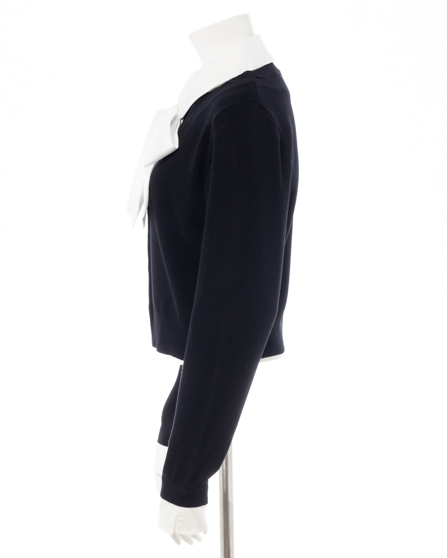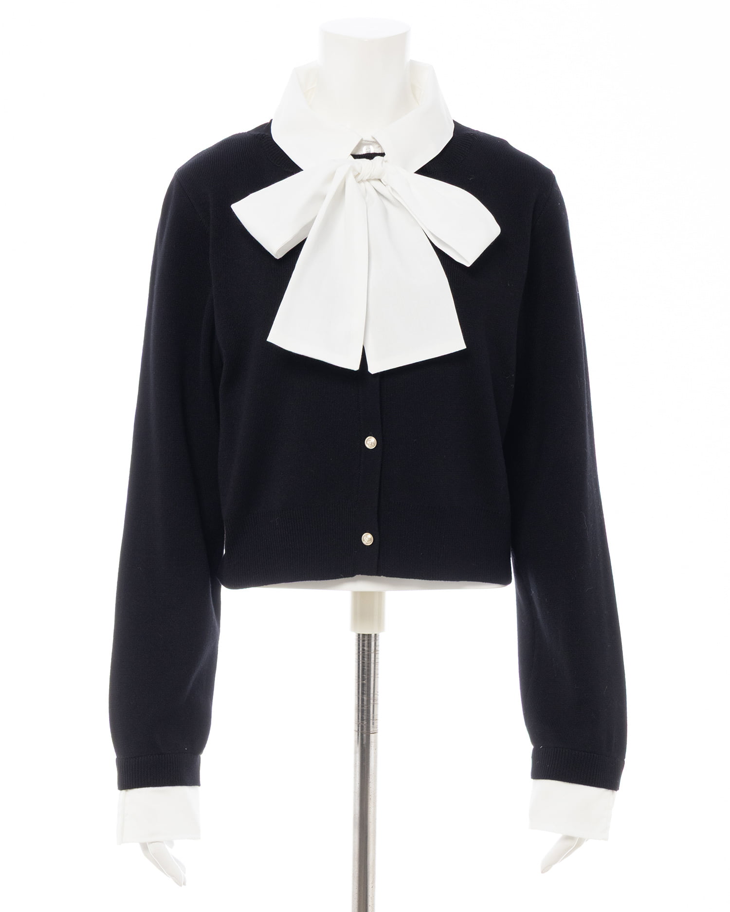 ボウタイだけを外したり、襟ごと外してクルーネックのカーディガンとしても着用可能。