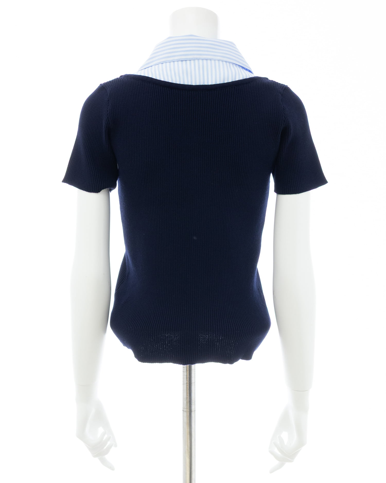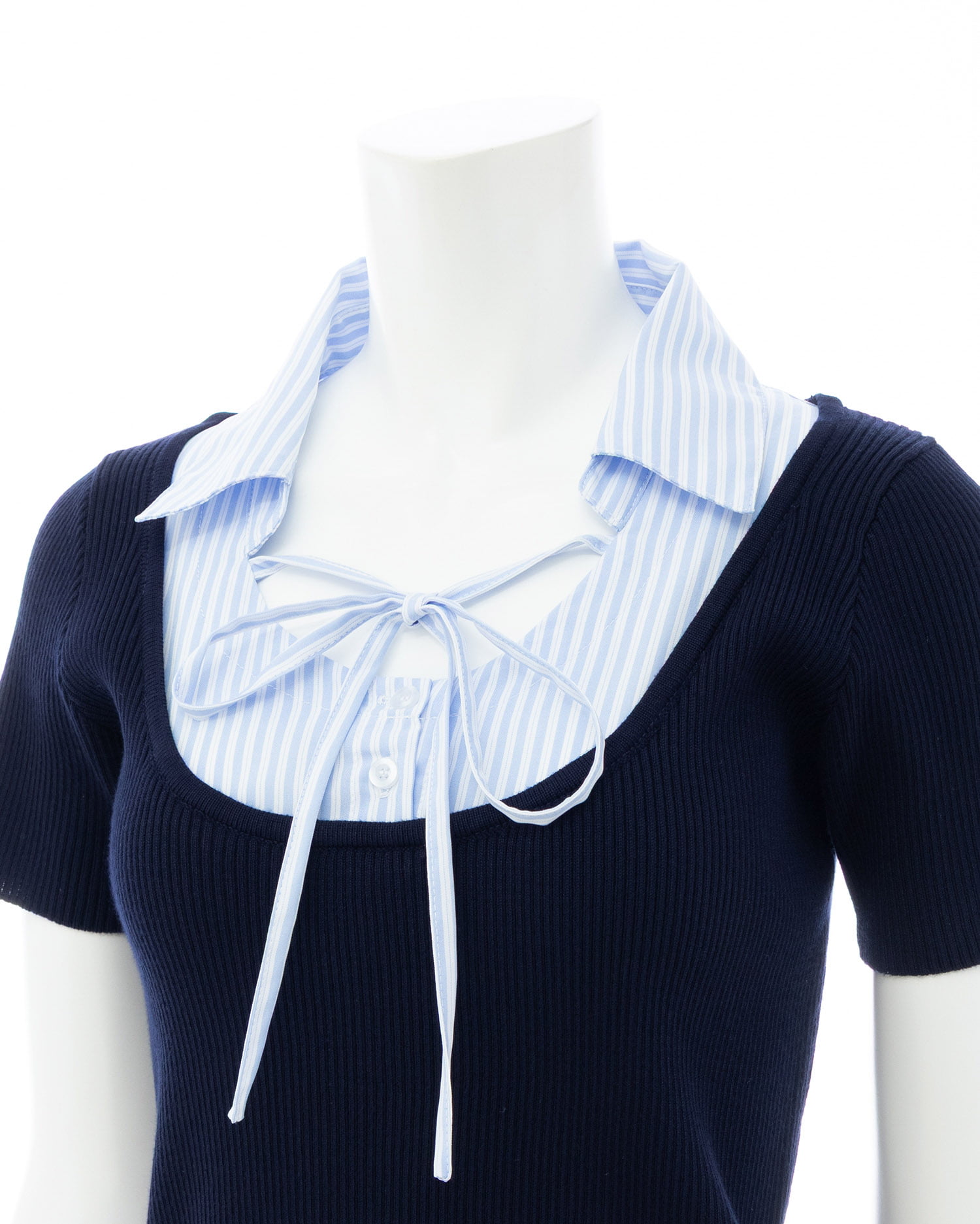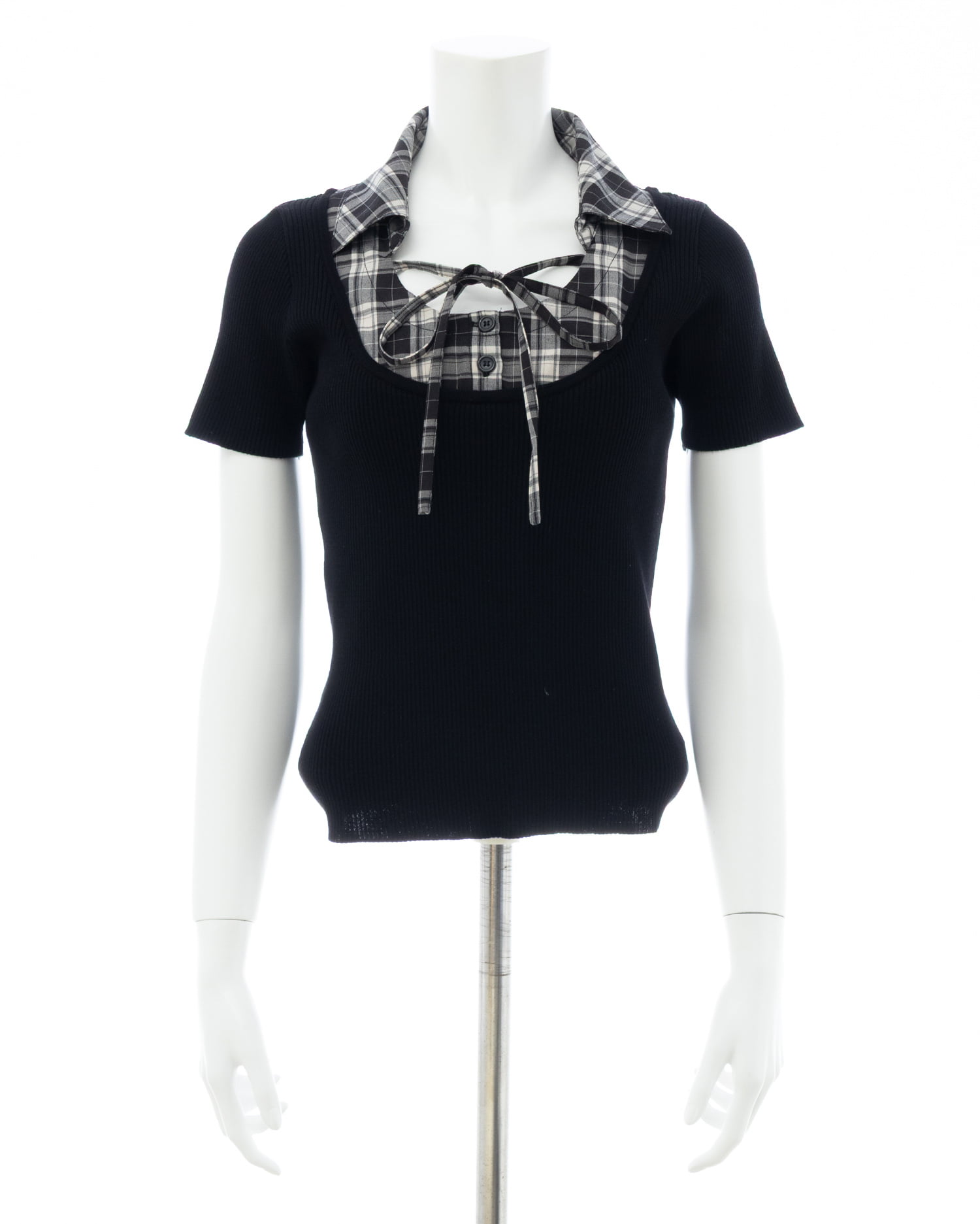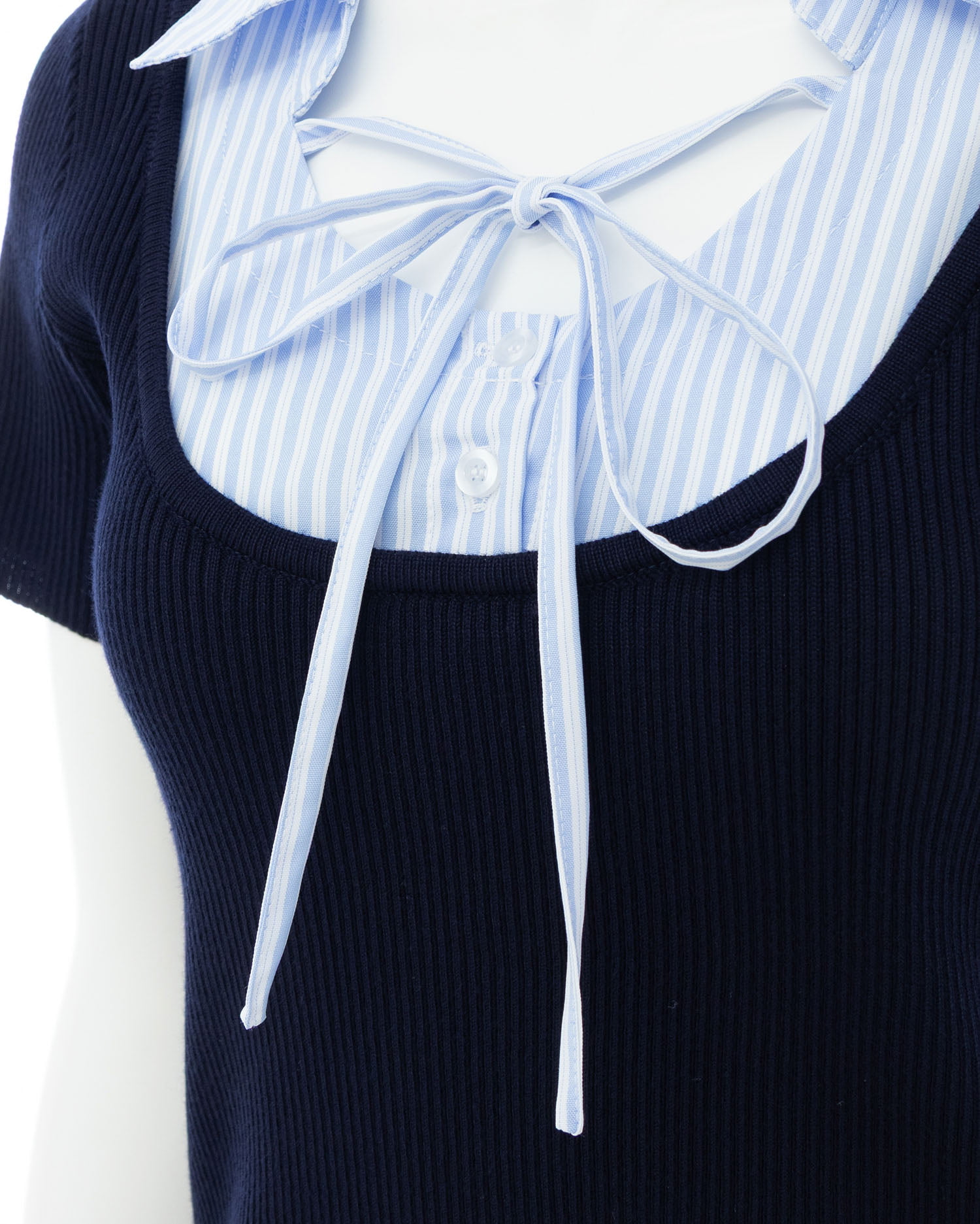 シャツにニットを重ねたようなドッキングデザインが魅力。