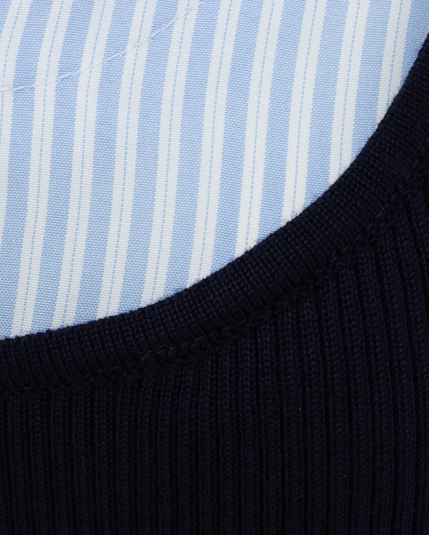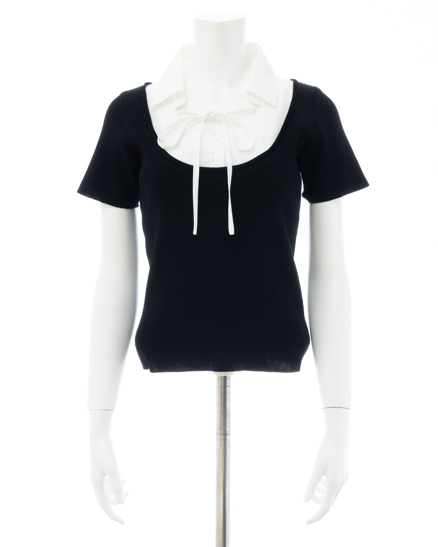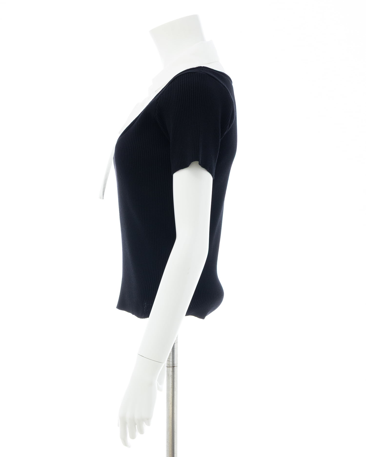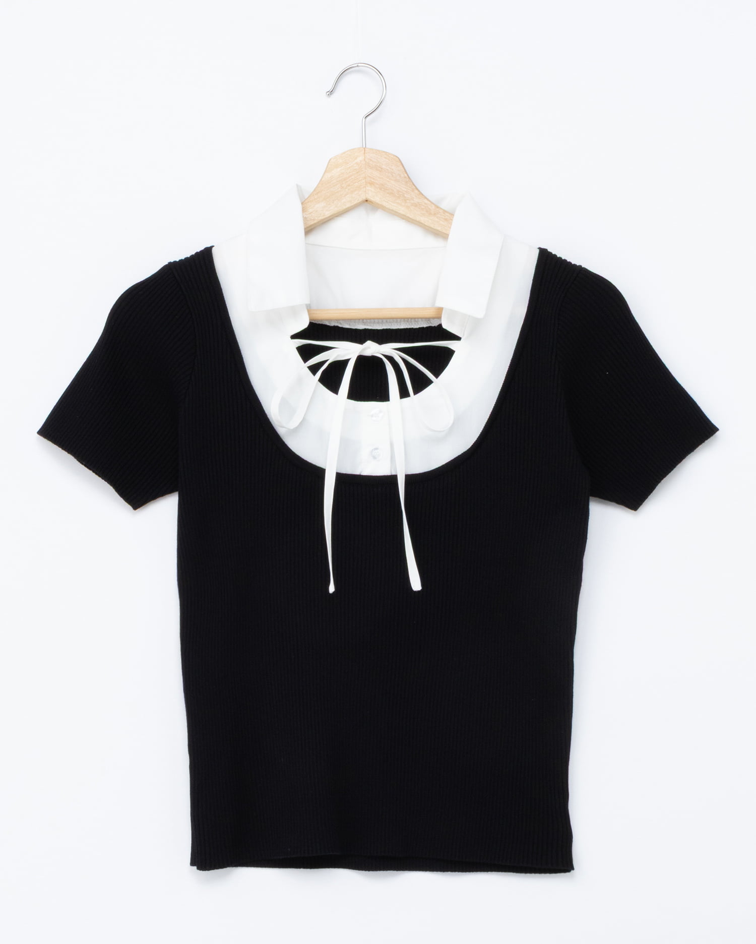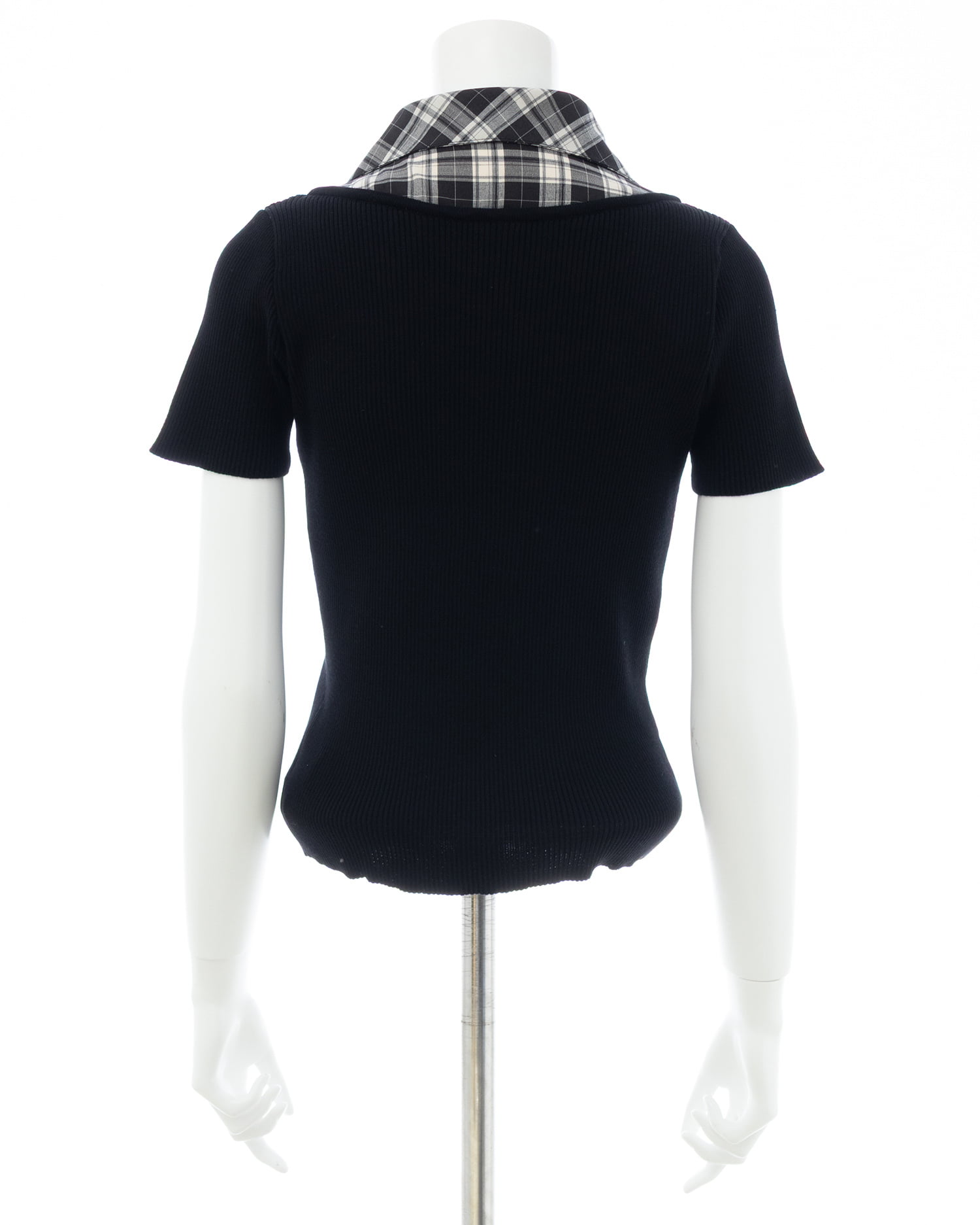 シャツにニットを重ねたようなドッキングデザインが魅力。