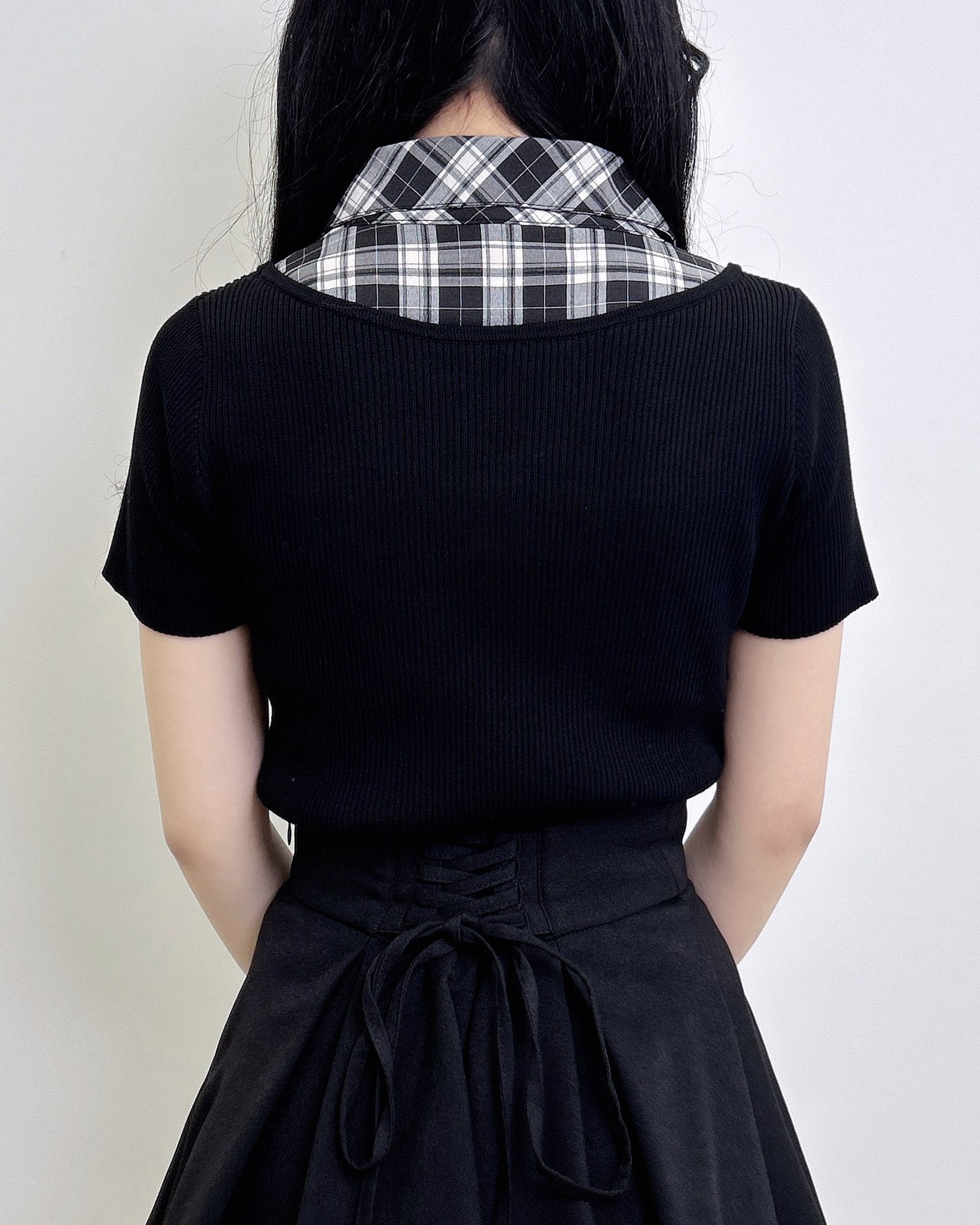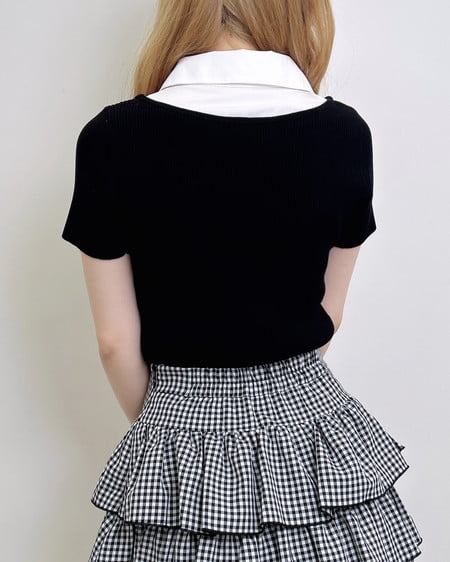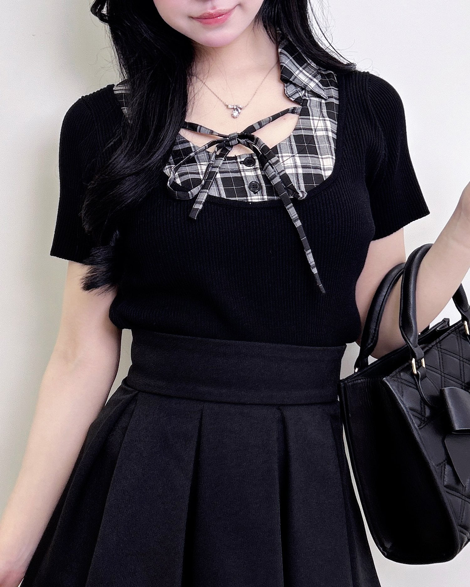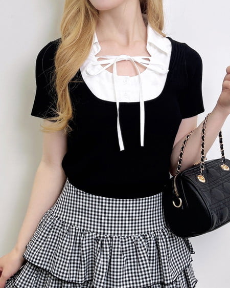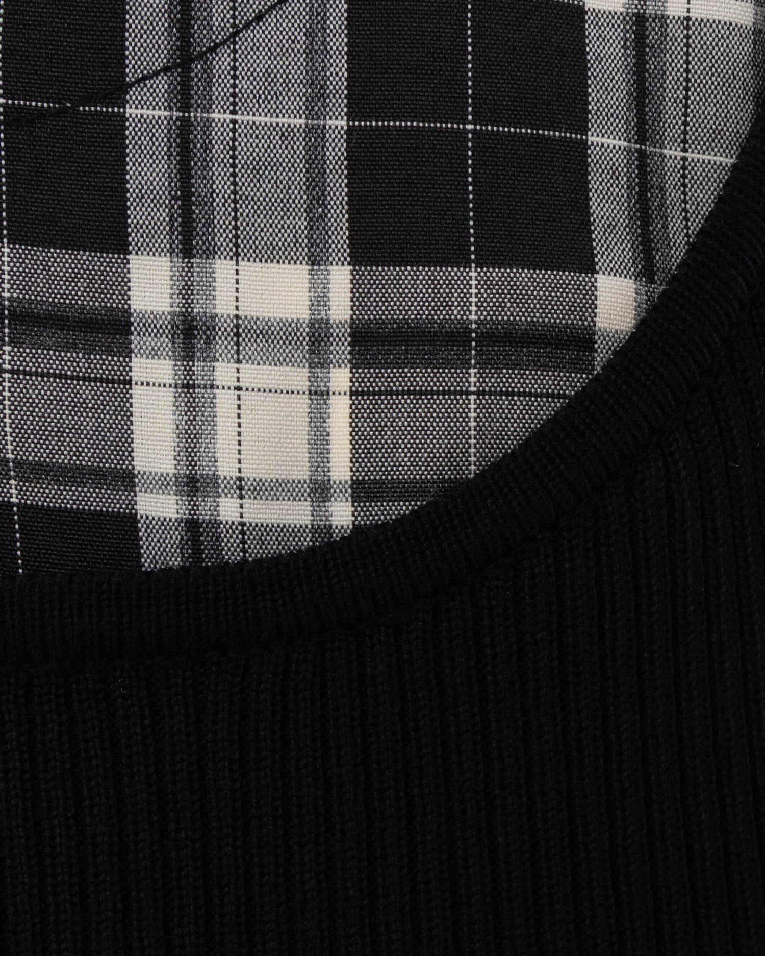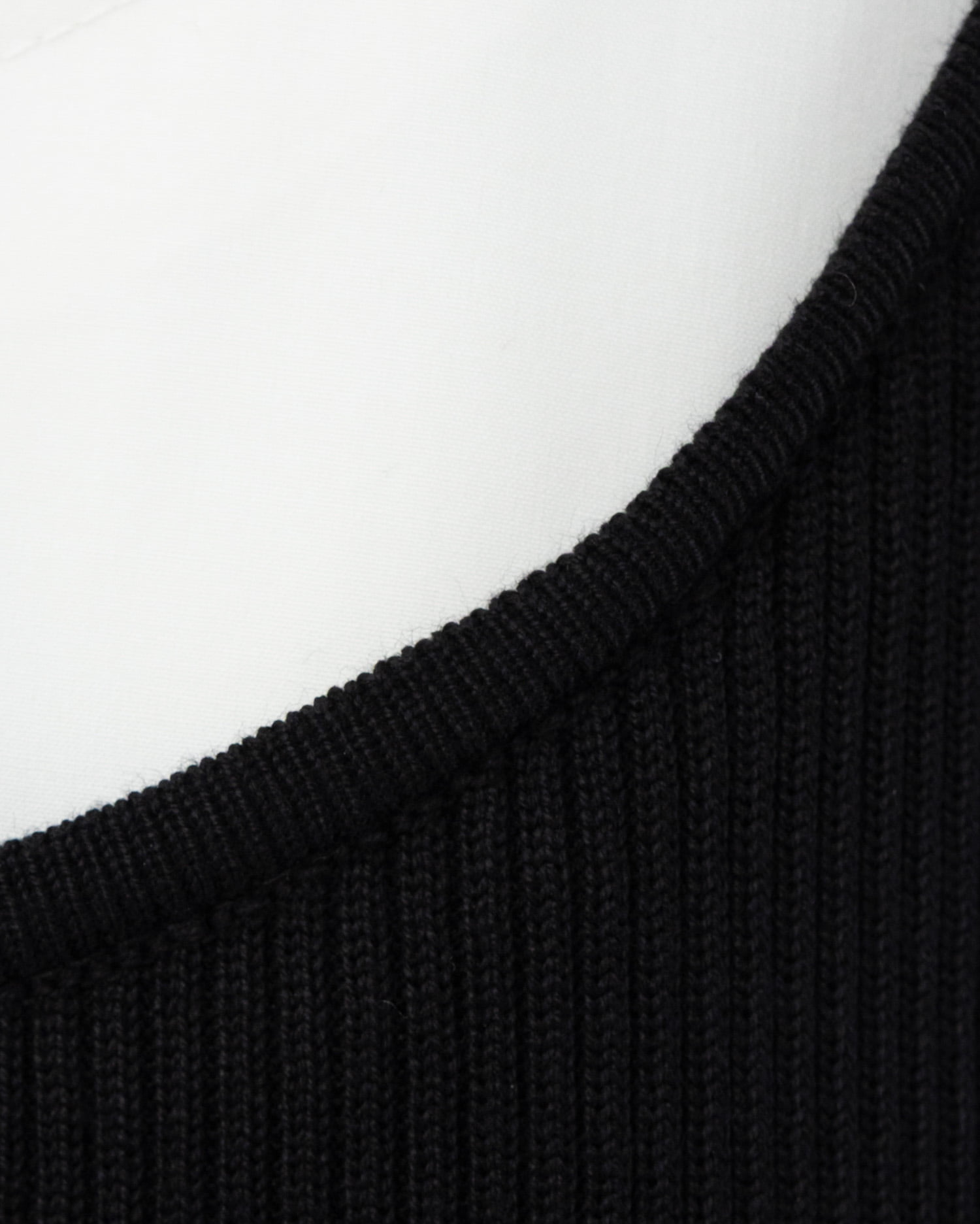 シャツにニットを重ねたようなドッキングデザインが魅力。