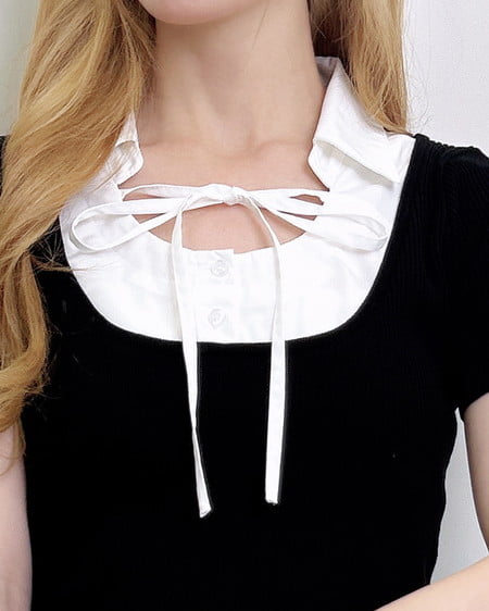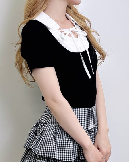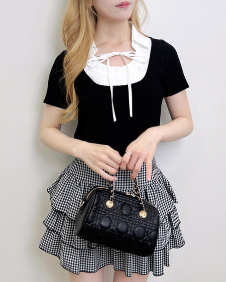 広めに開いたデコルテ部分にはキュートなリボンでアクセントをプラス。