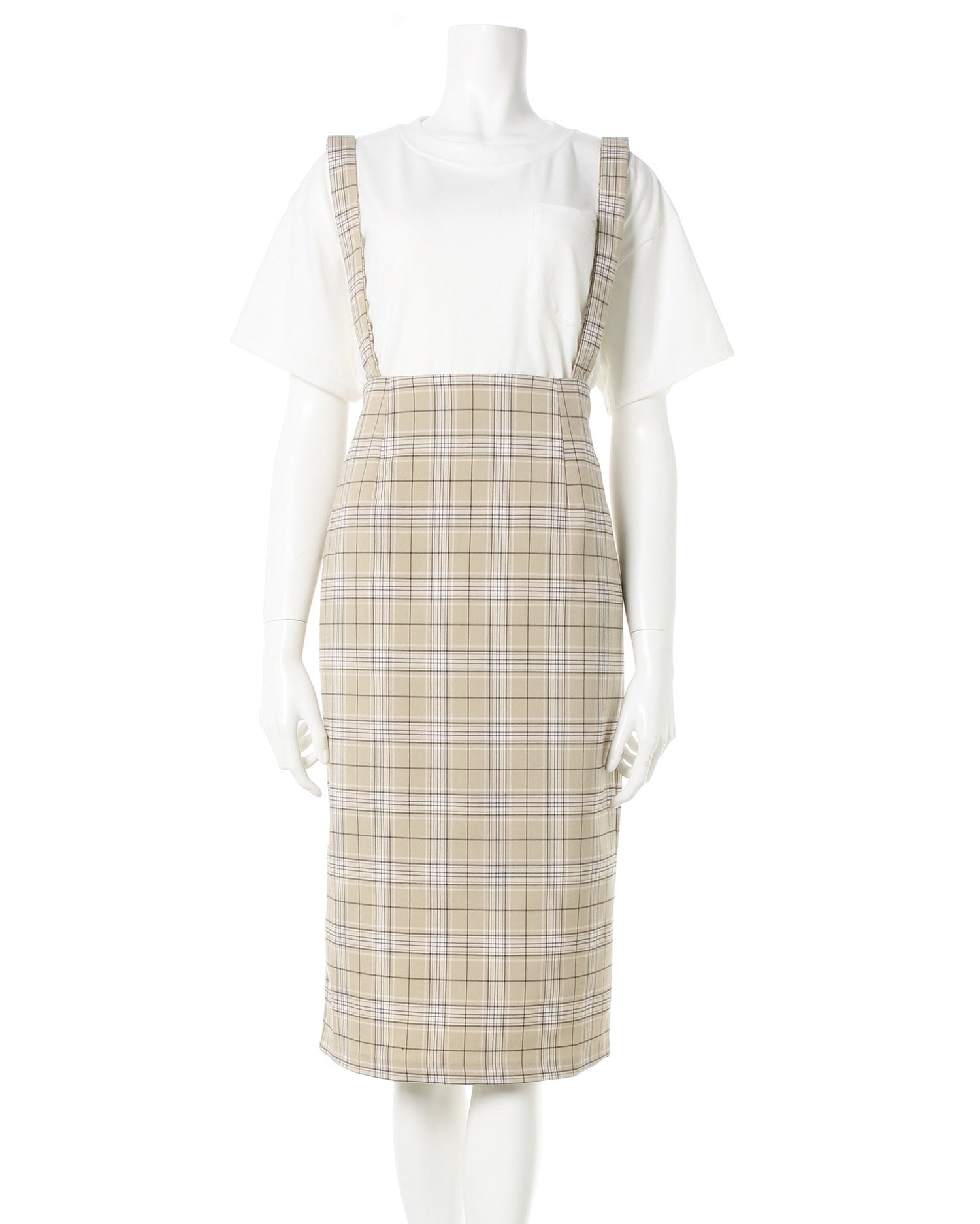 トレンドのチェック柄スカートはタイトなシルエットと膝下の長め丈で大人な雰囲気。落ち着いたカラー使いでシックに着こなせるのでオフィスシーンにもオススメです。太めのサス付きでカジュアルにも着回せるのが◎。サスペンダーはボタンで取り外し可能なので、スカート単品でも着回せます。バックウエストはゴムになっているのでフィット感があり、着心地も快適。