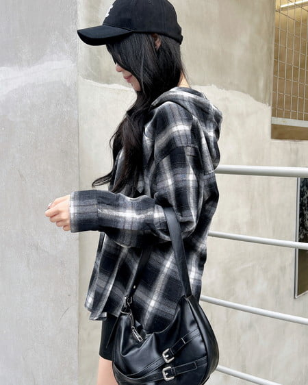 【羽織りとしても着まわせるフード付きのチェック柄シャツ】