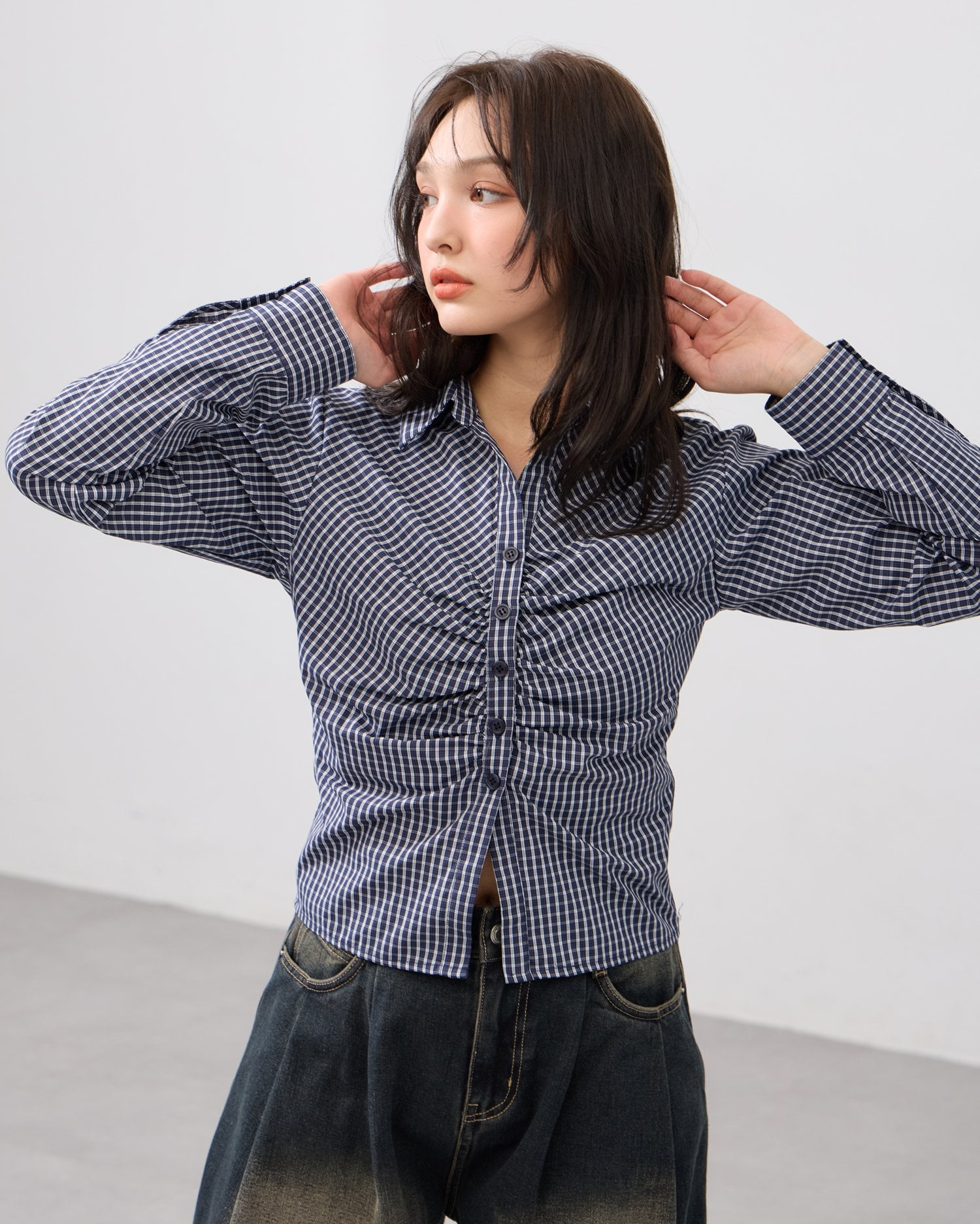 胸元のギャザーでメリハリシルエットに仕上げたシャツ。