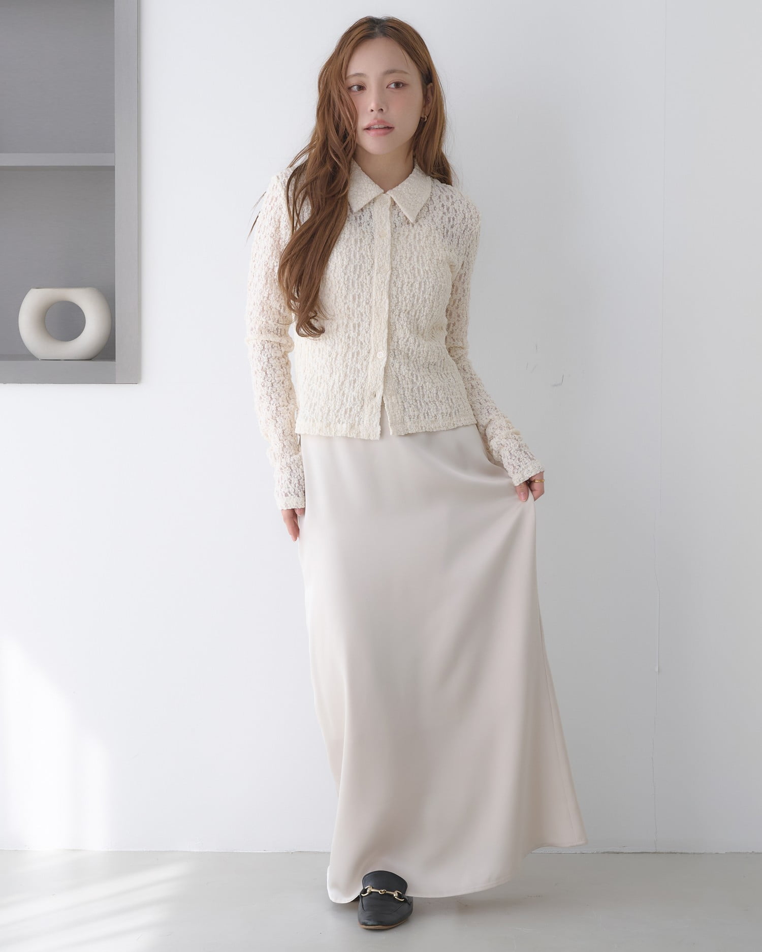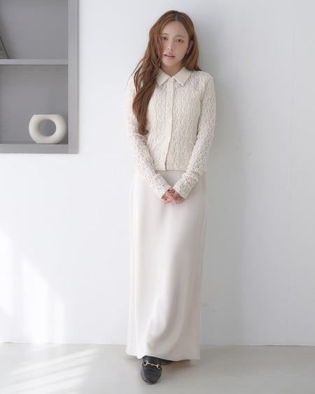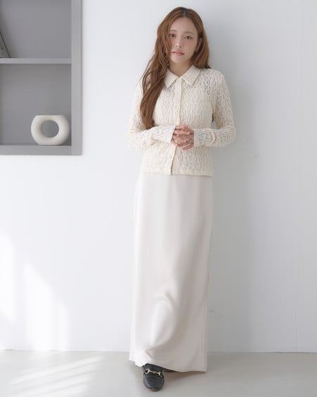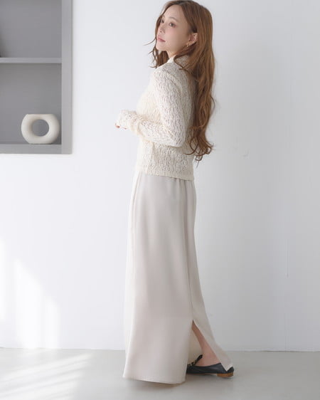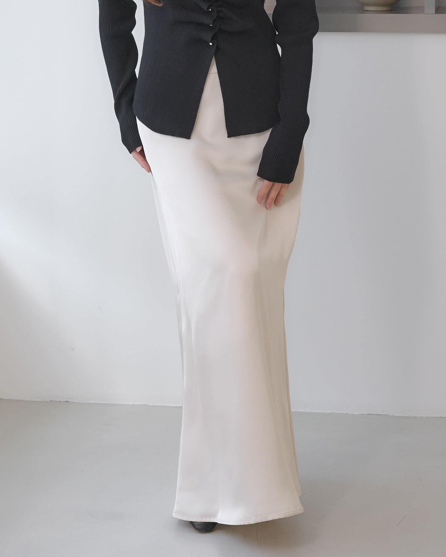 光沢のあるサテン生地で仕立てたマーメイドシルエットのロングスカート。