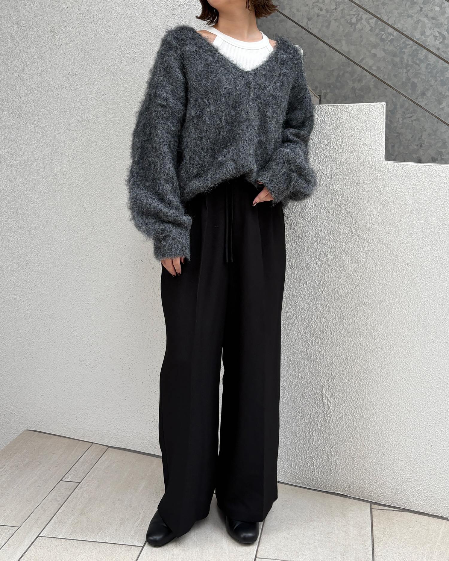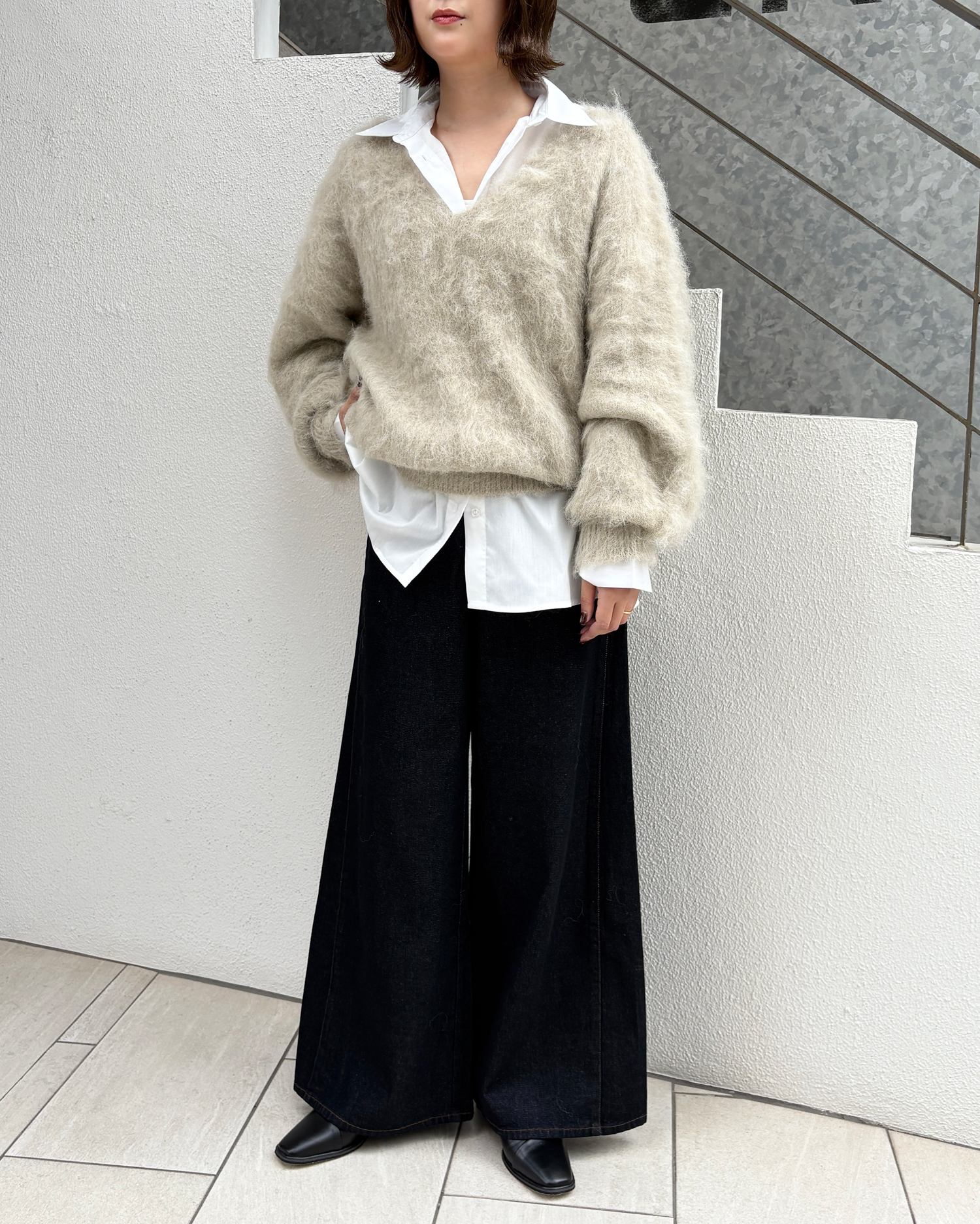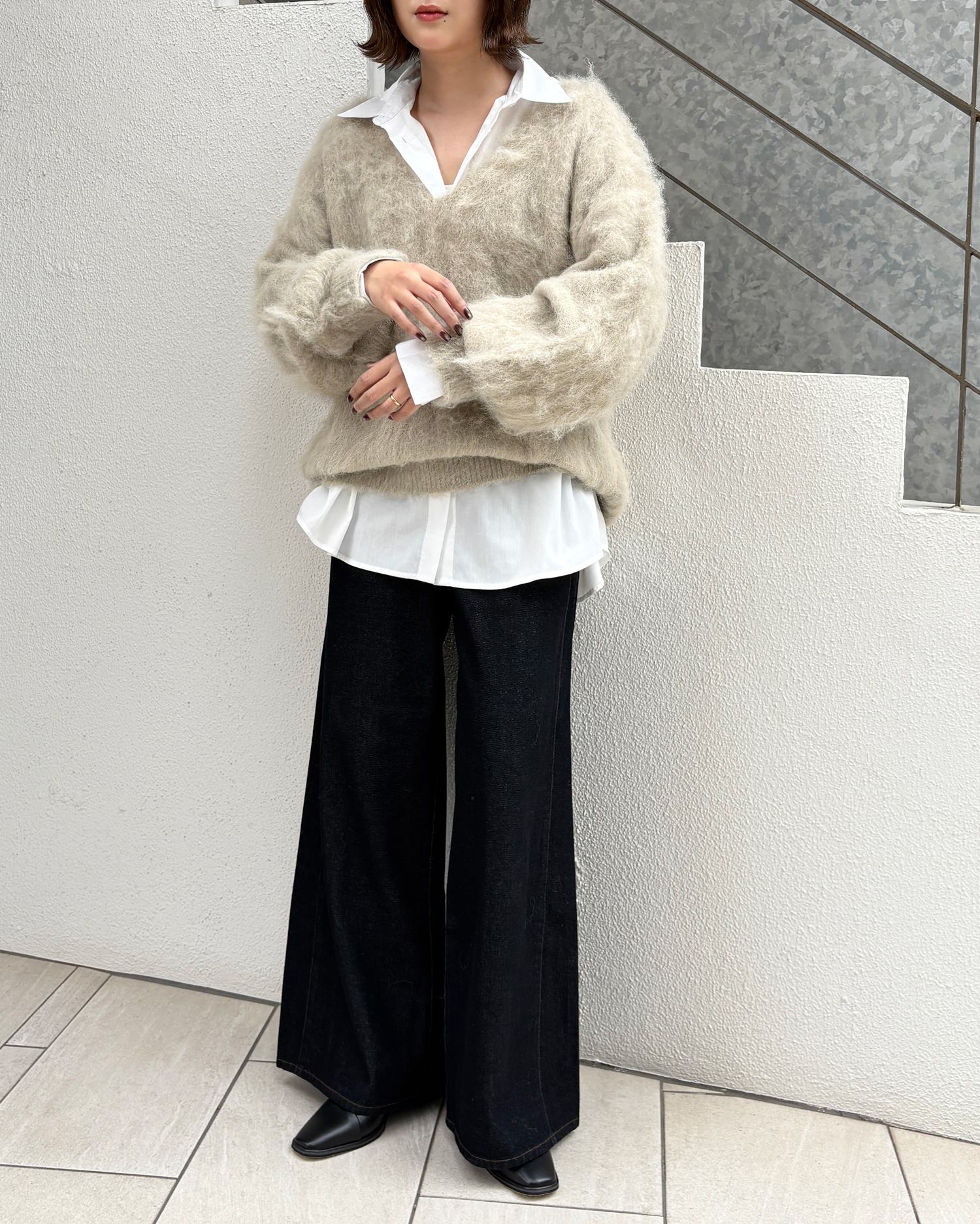 裾へ向かって広がるラインでブーツなども合わせやすくなっています。