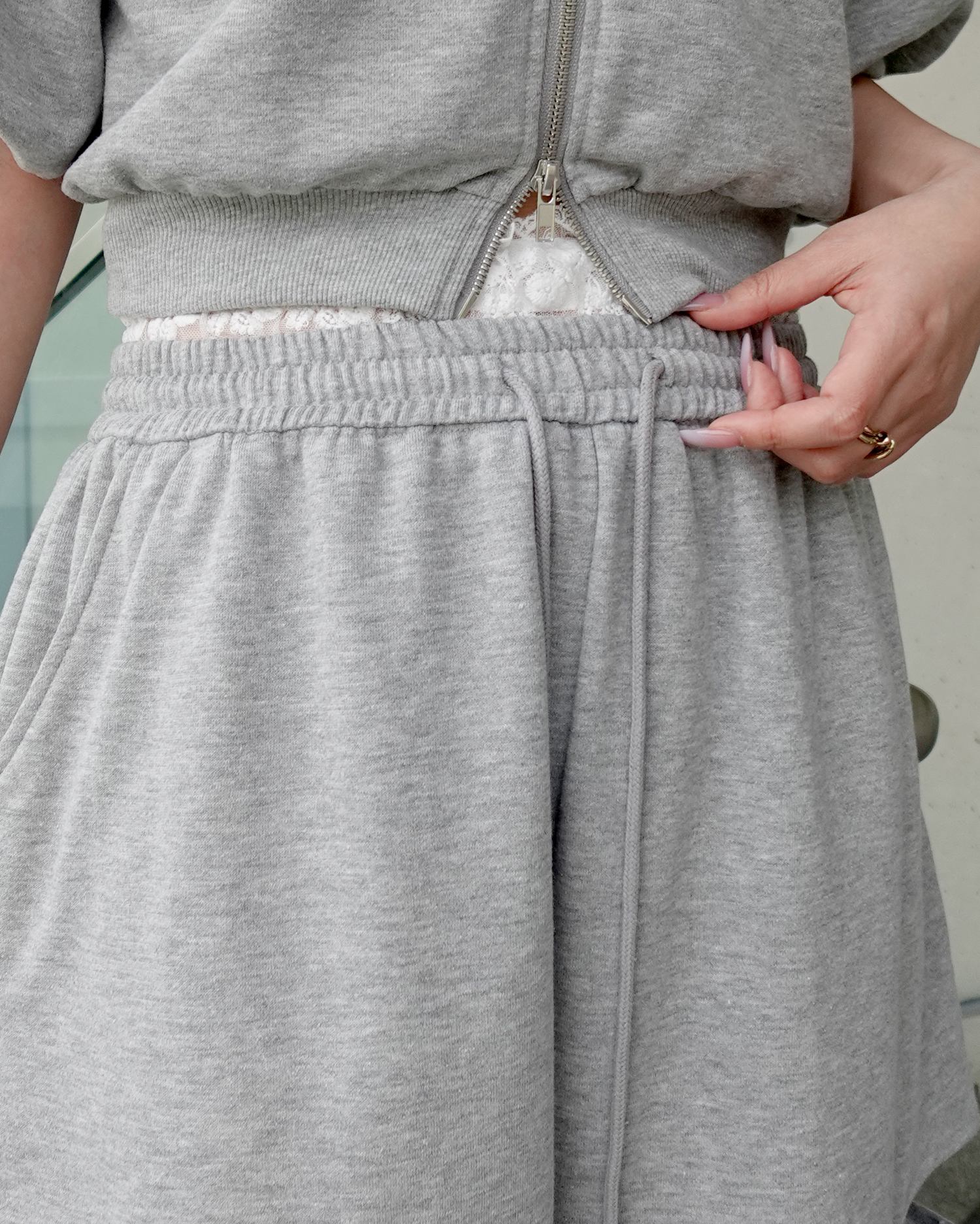 伸縮性のある薄手のスウェット生地は着心地も抜群。