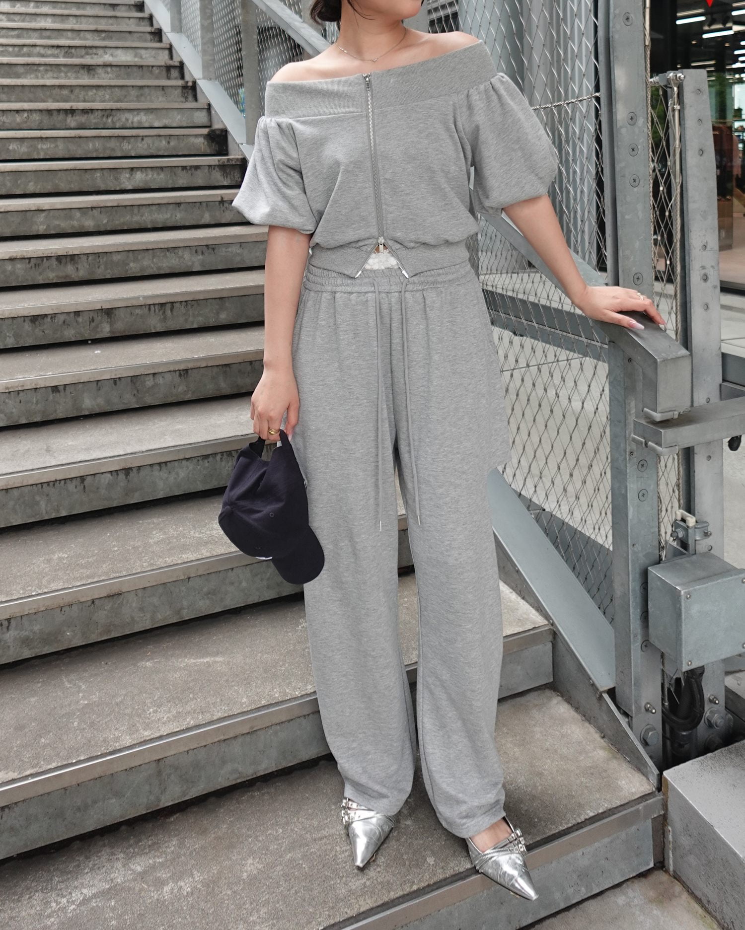同素材のトップスと合わせてセットアップ風に着るのもおすすめです。