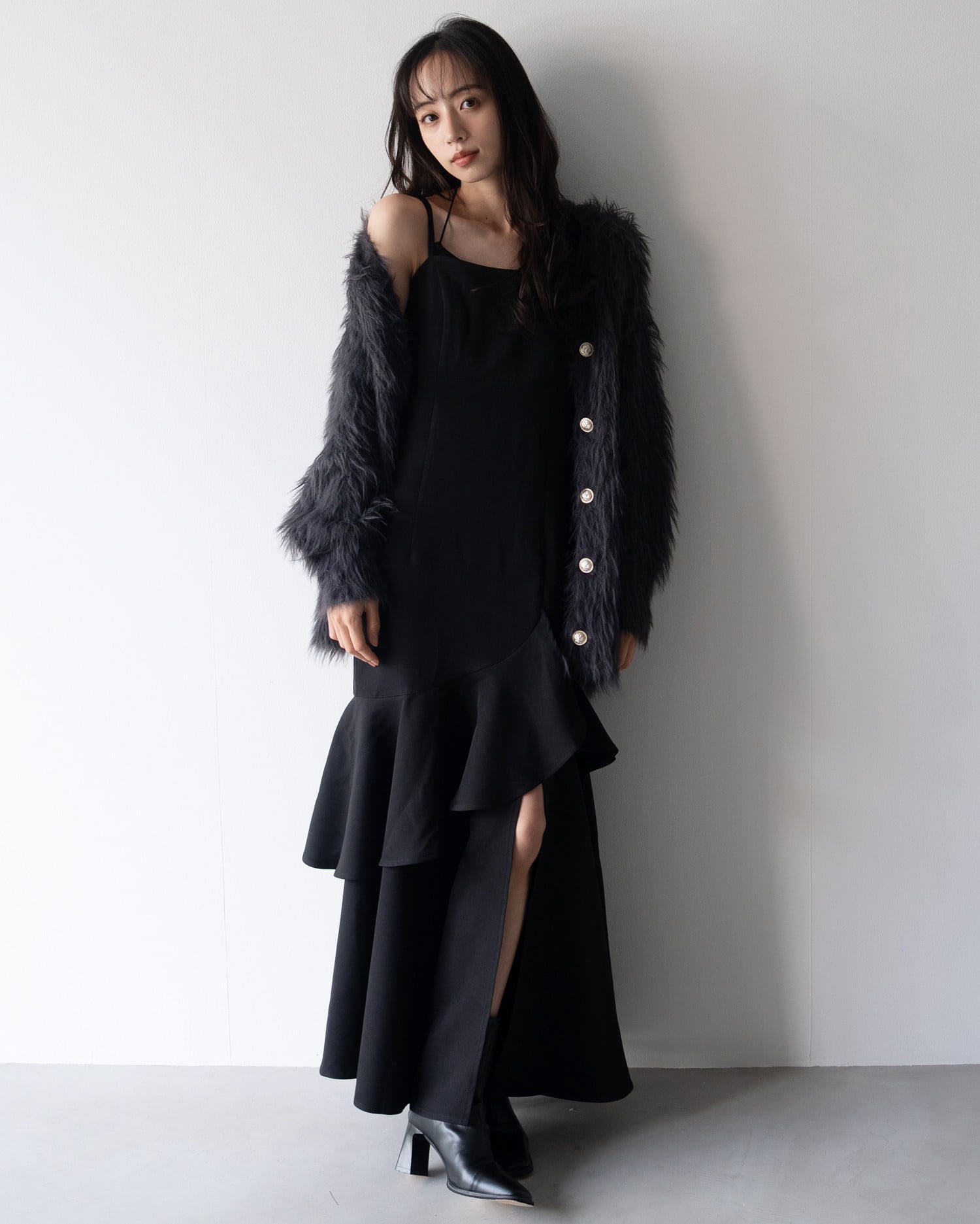 大人っぽく着られるロング丈&フロントの大胆なスリットが◎。