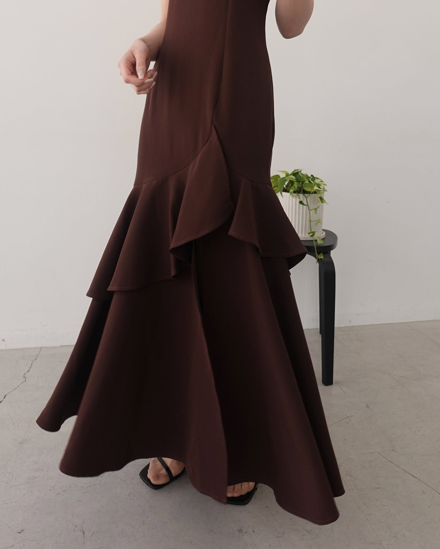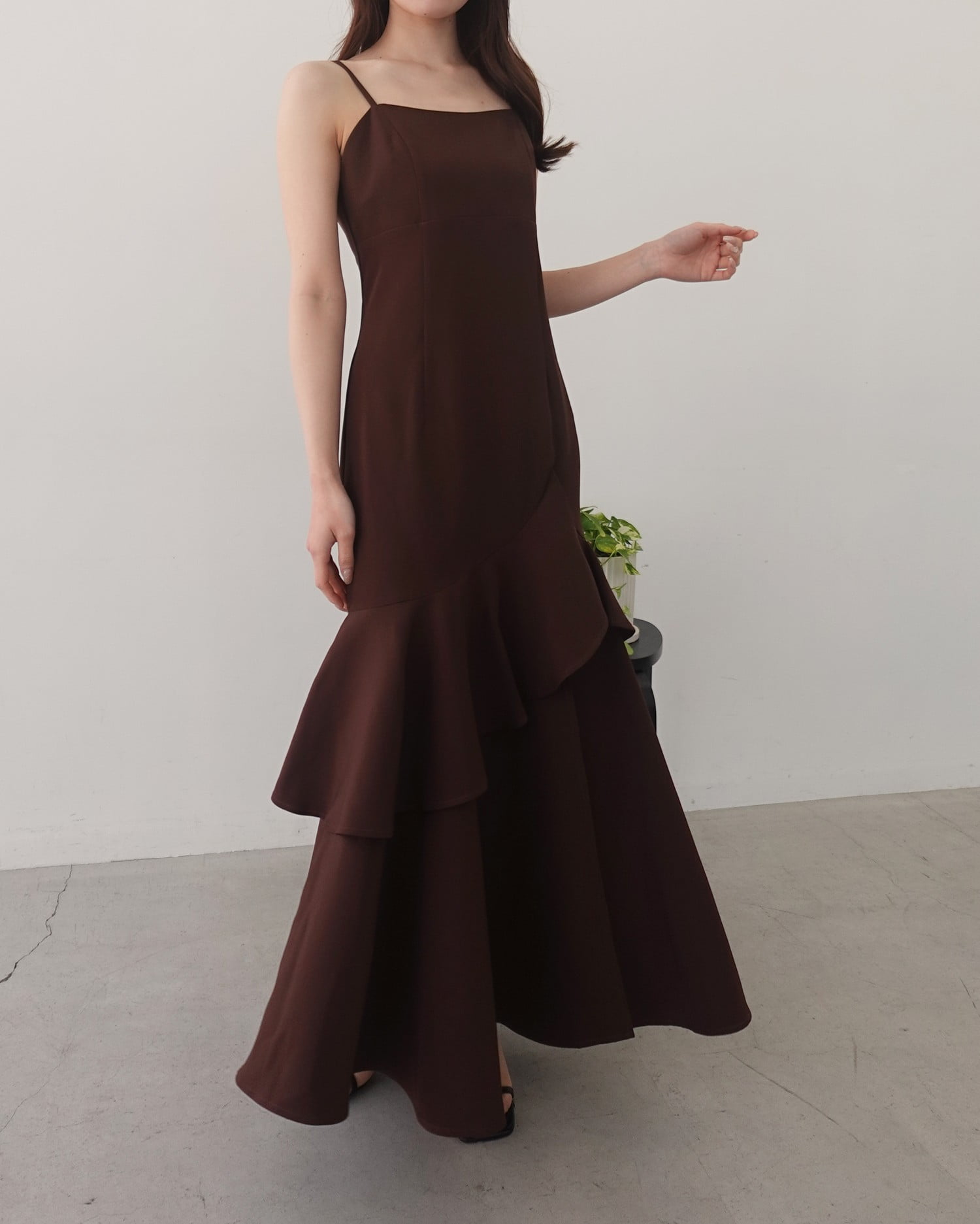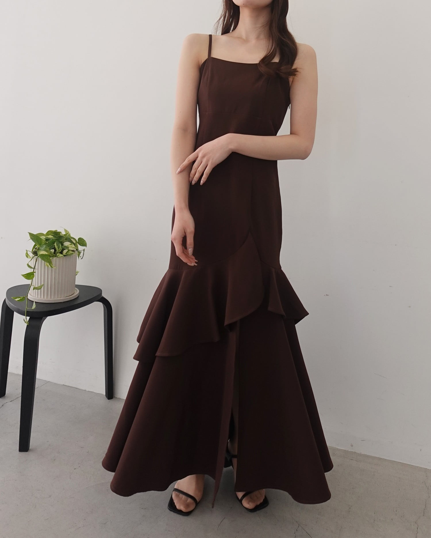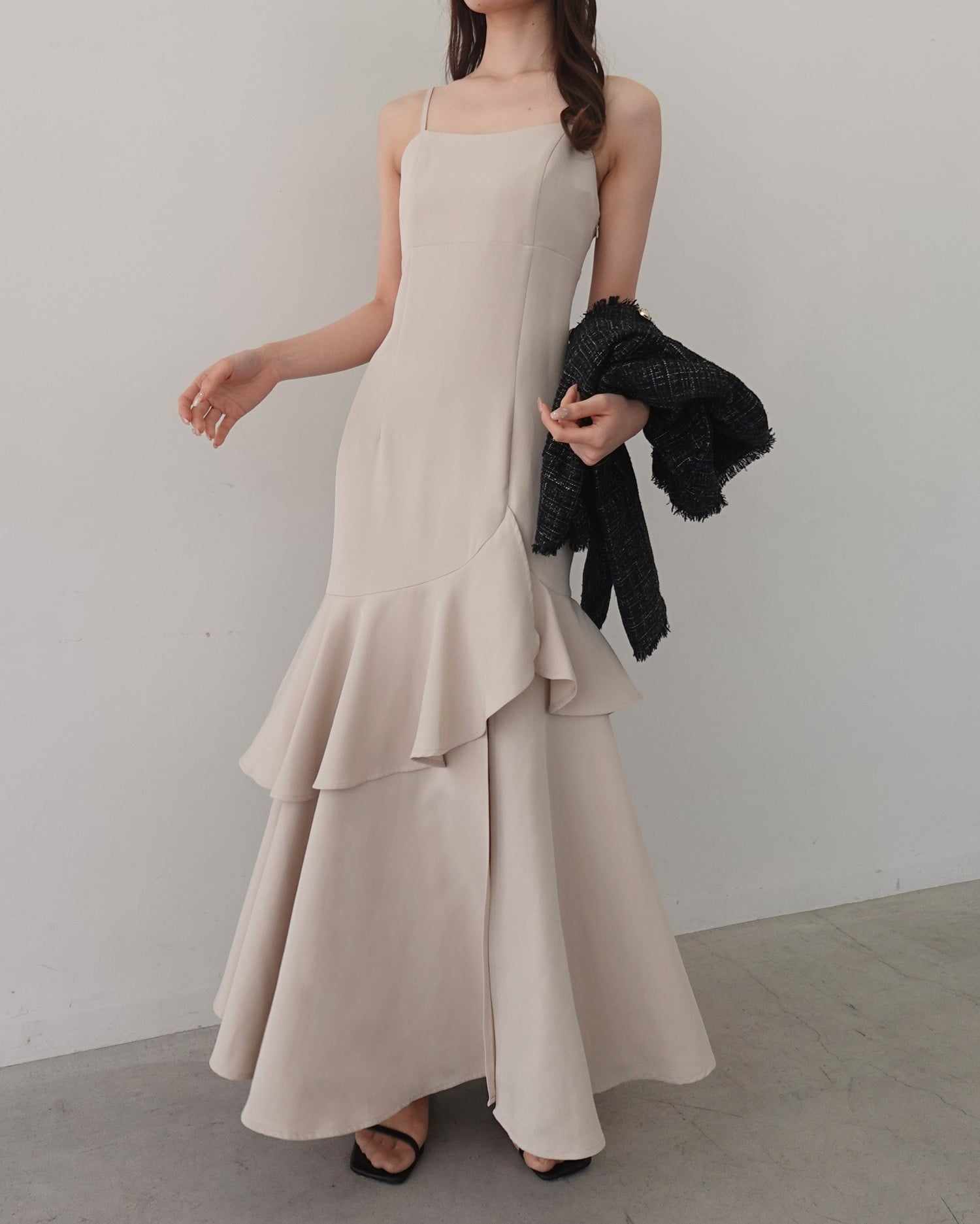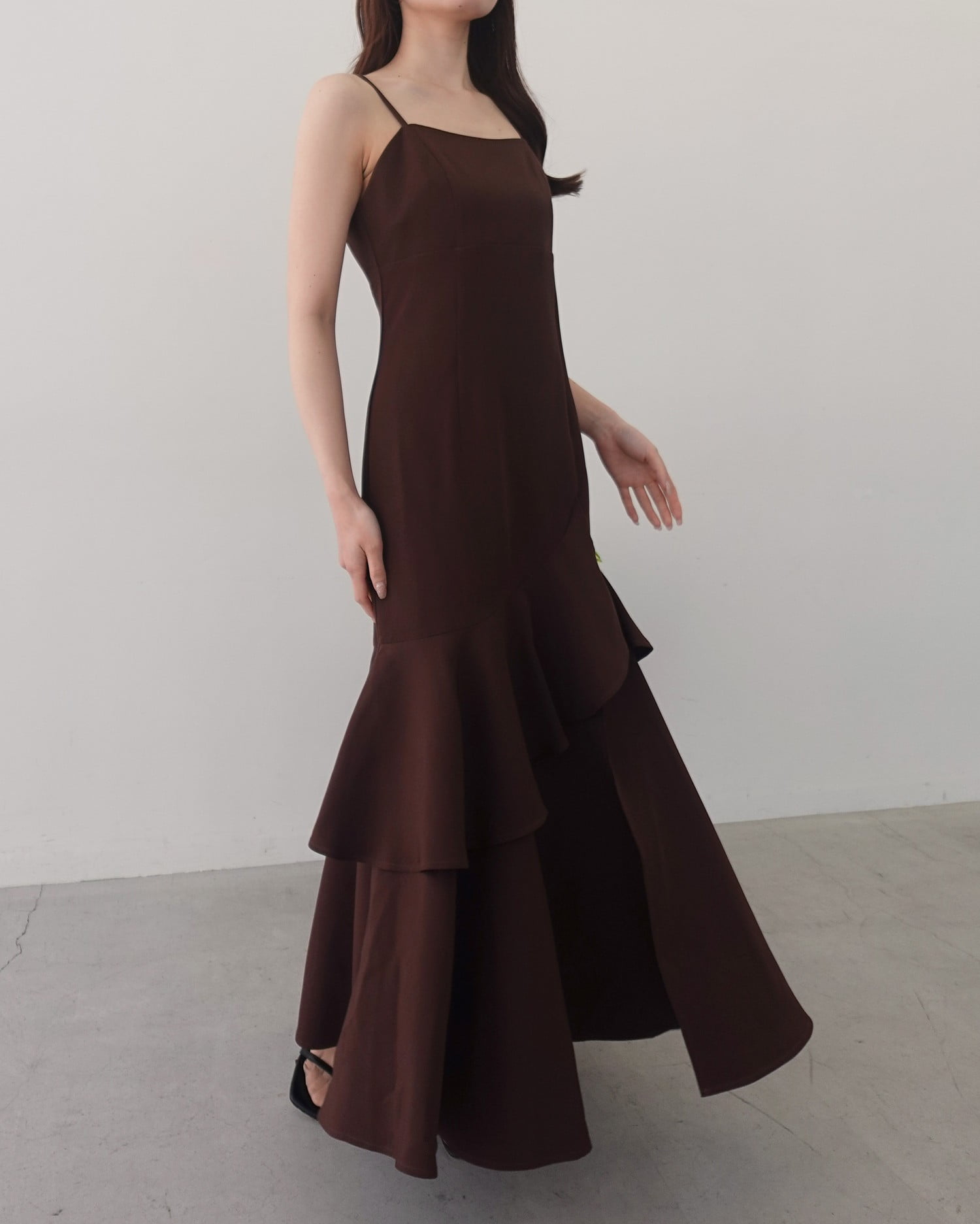 アシンメトリーのフリルがレディなキャミソールワンピース。