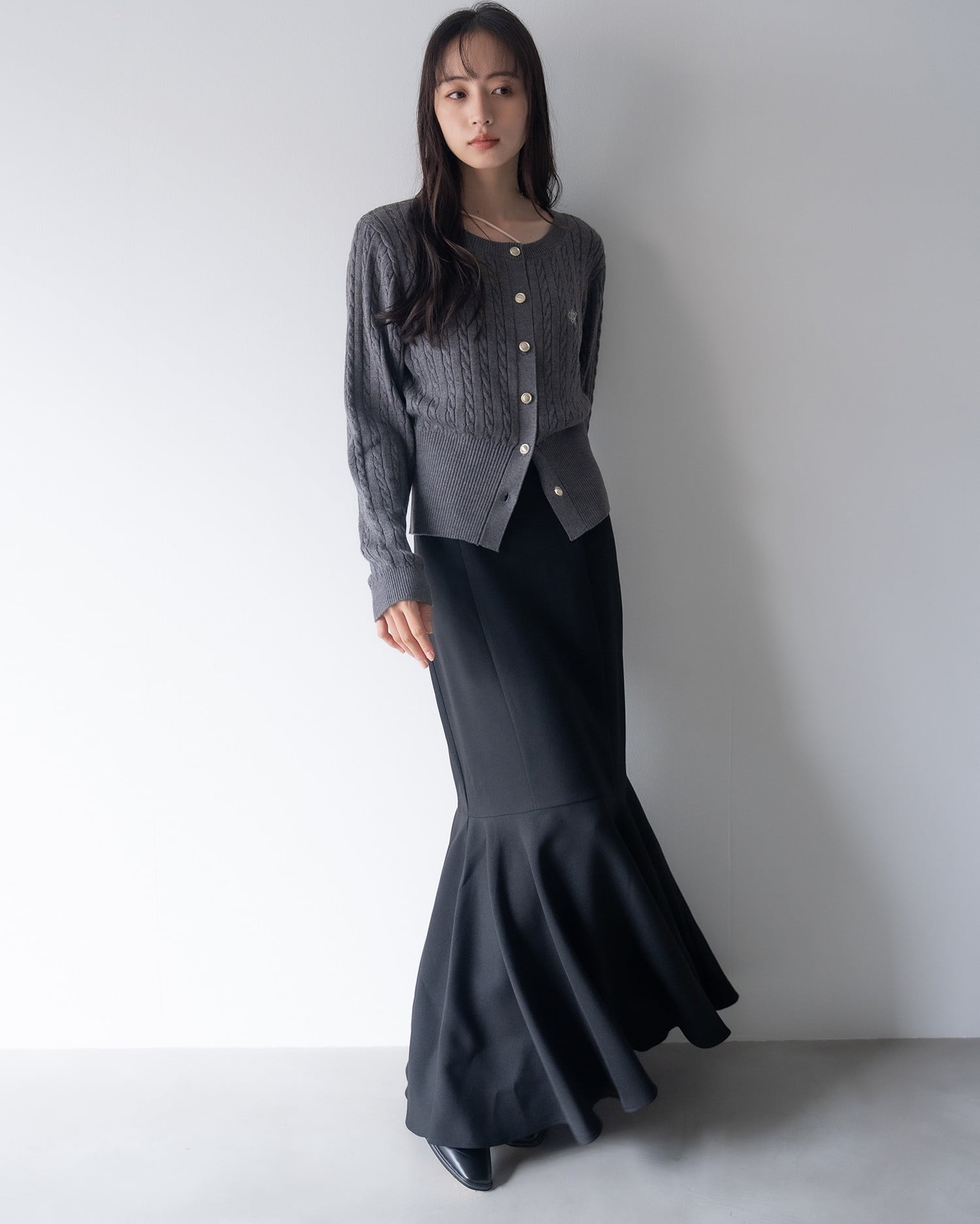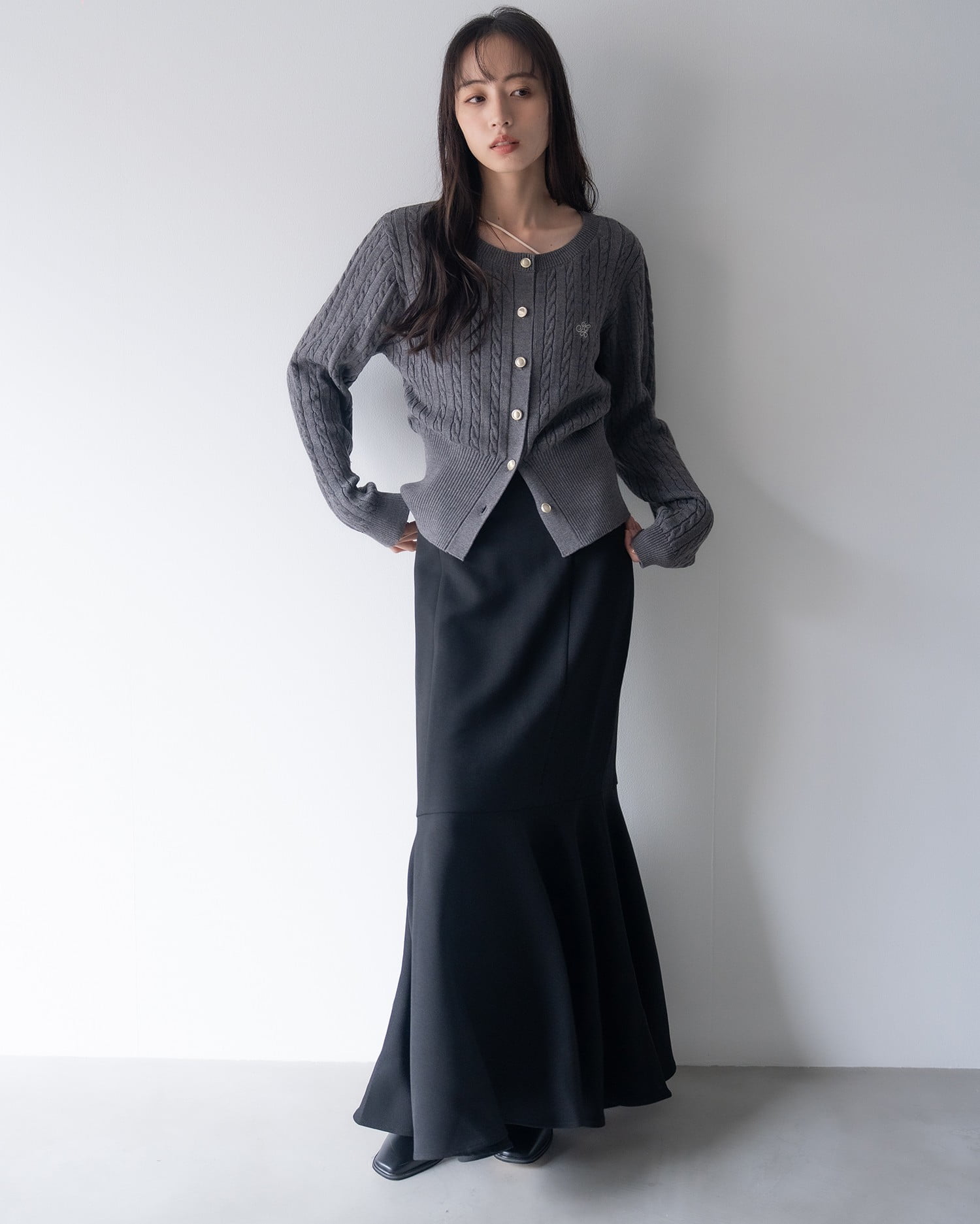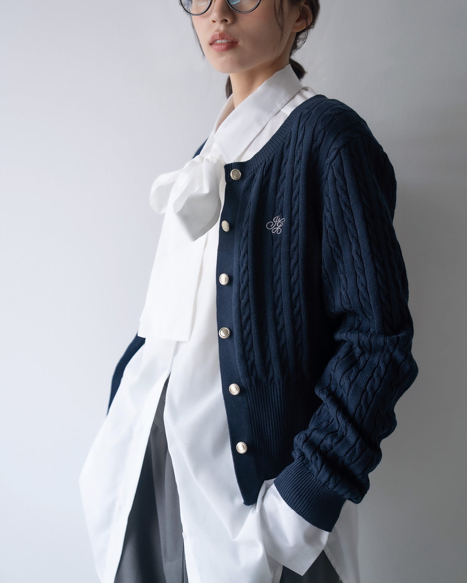優等生風のスタイルが完成するケーブル編みのカーディガン。
