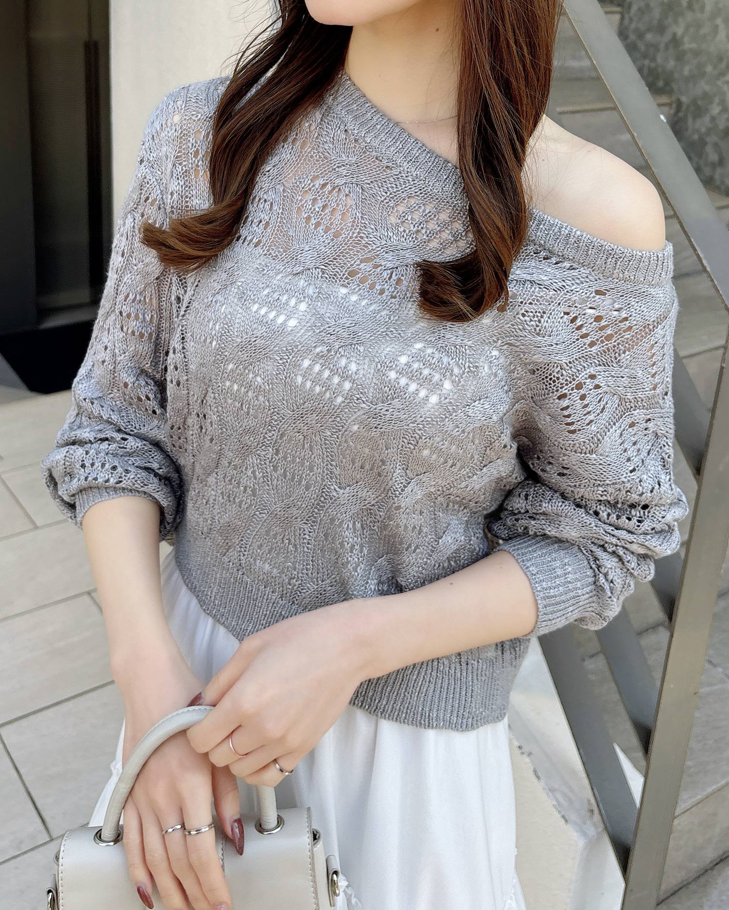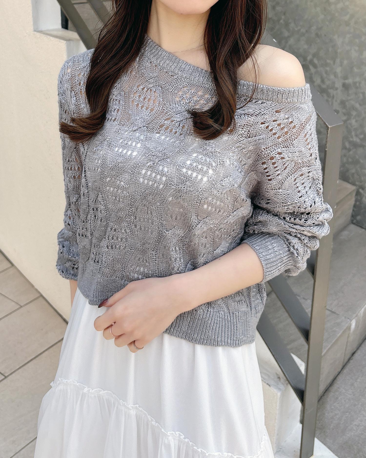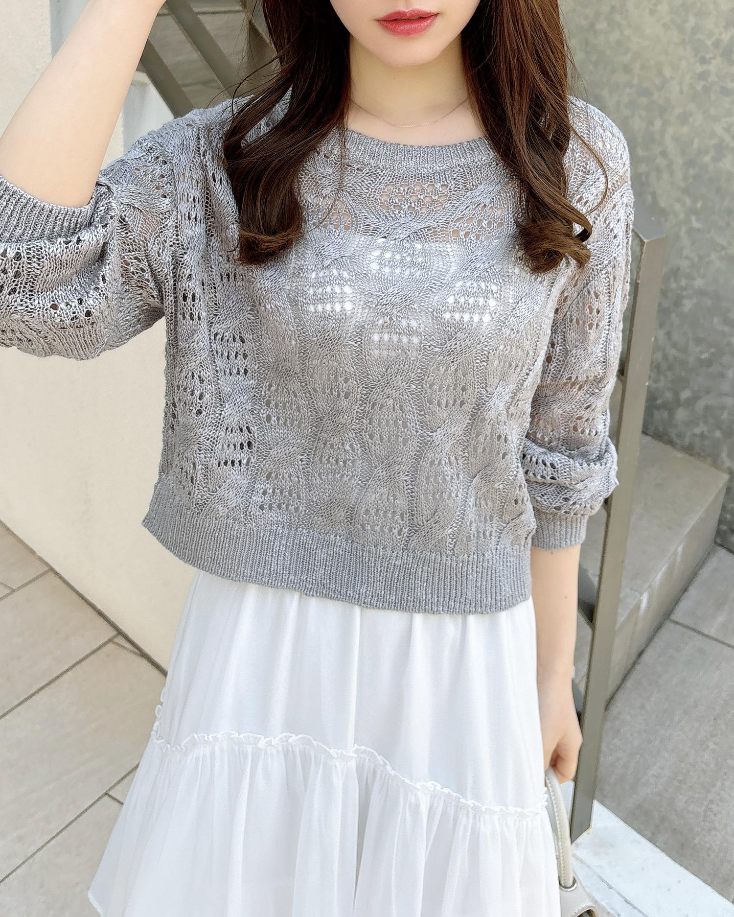 透かし編みのケーブルデザインが特徴のニットプルオーバー。