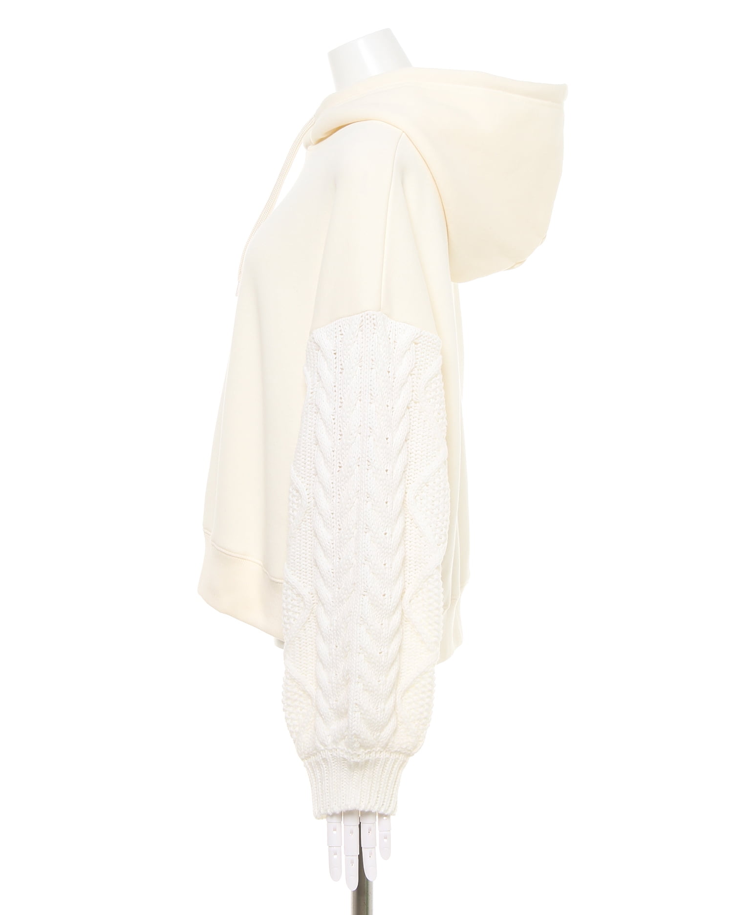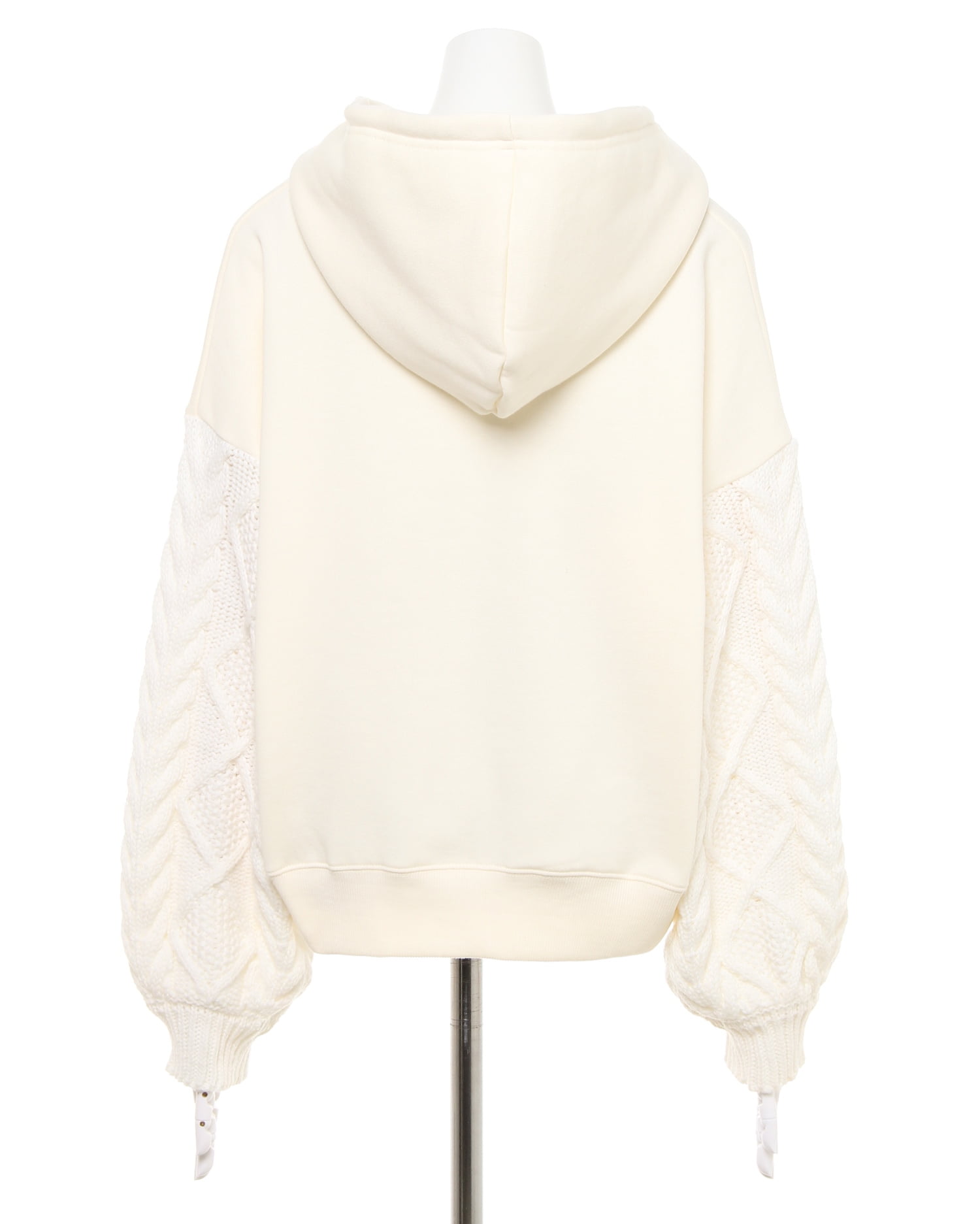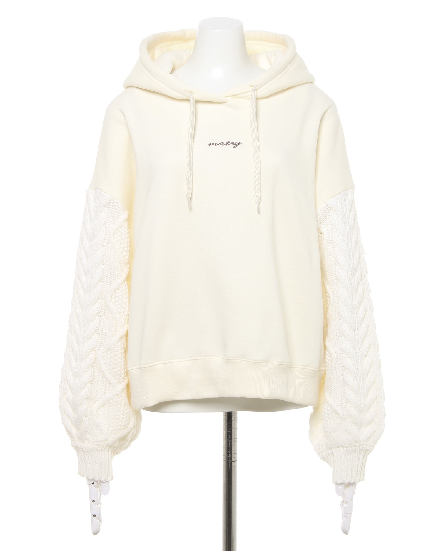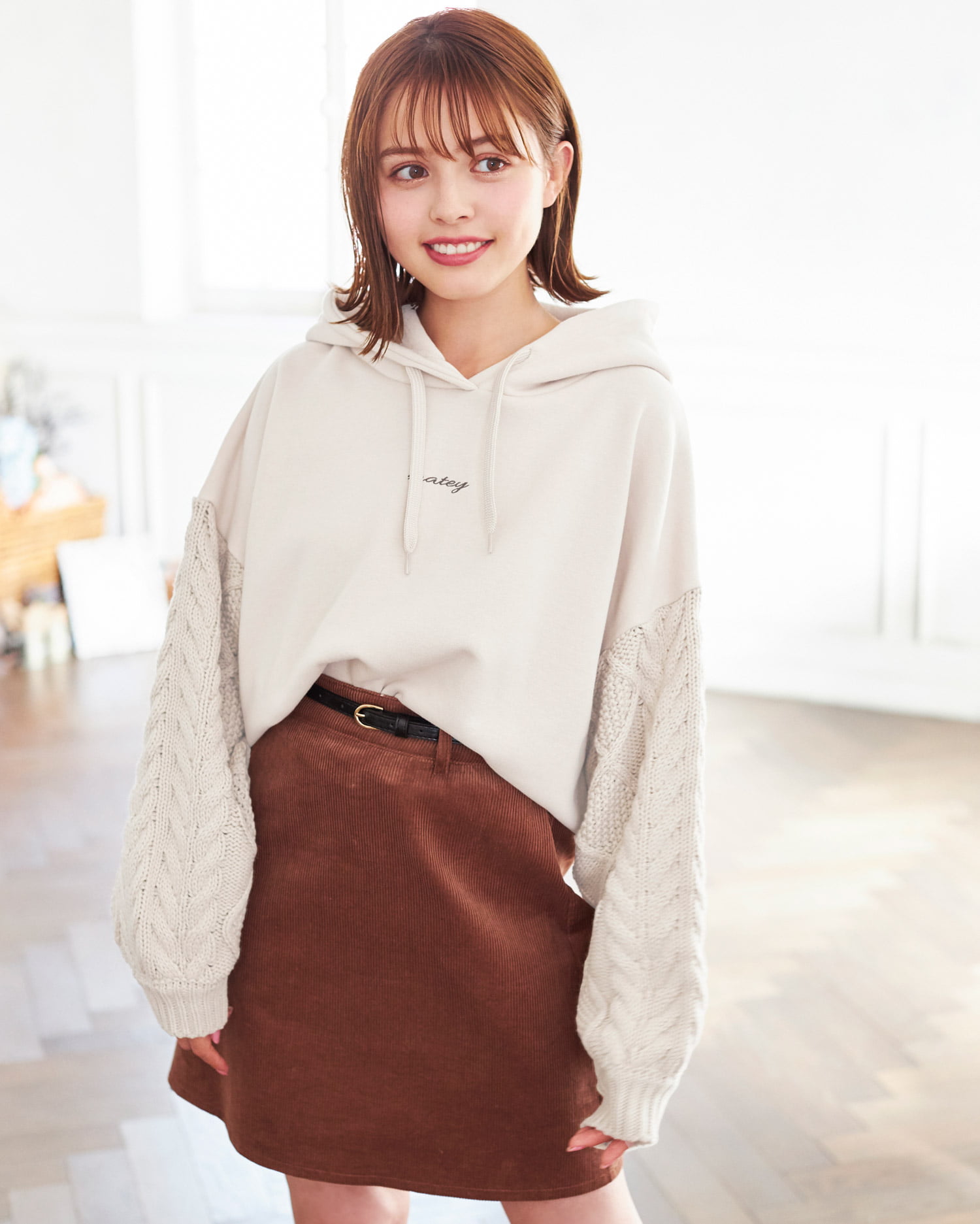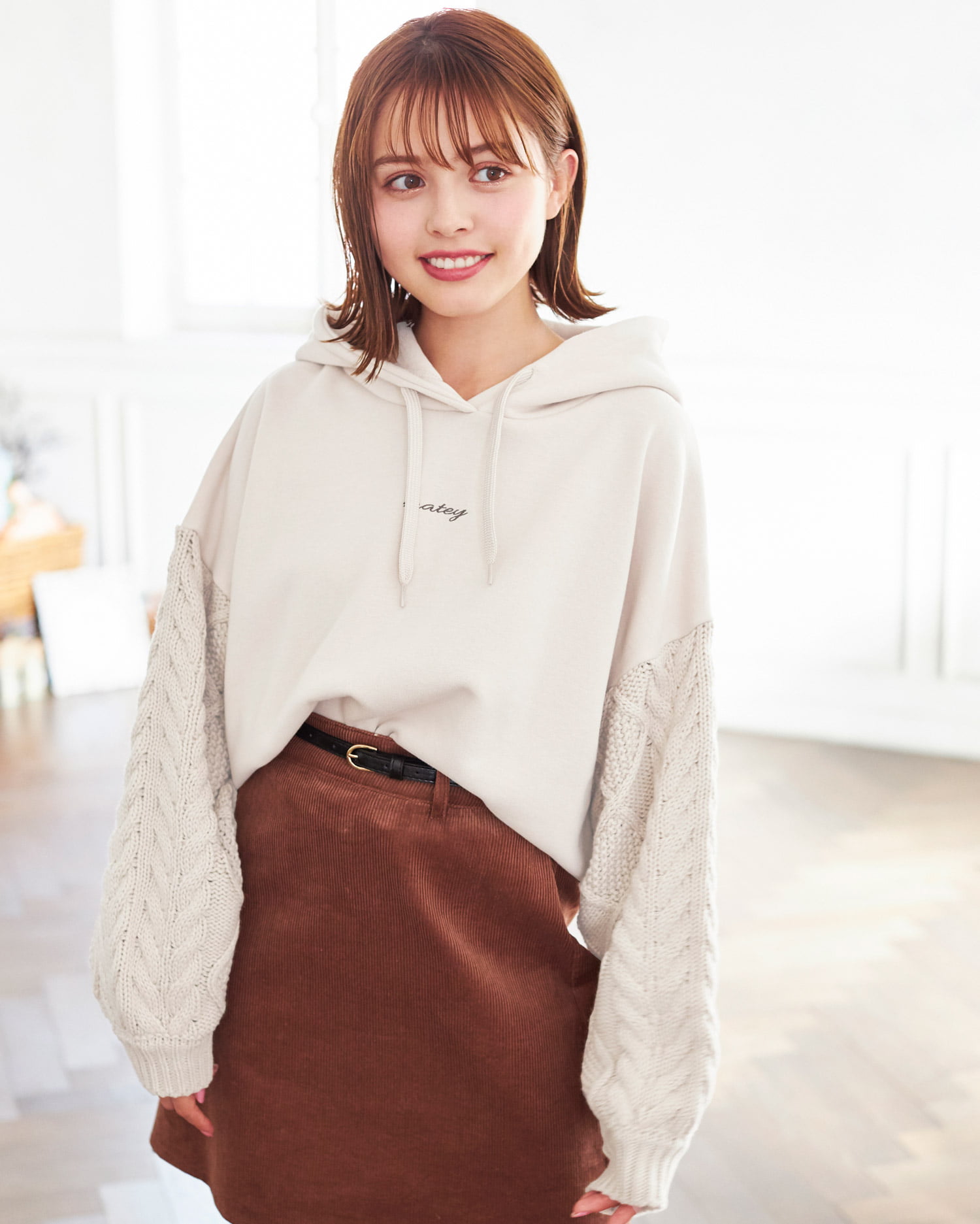 普段使いに便利なパーカーは袖のケーブル編みの切り替えデザインでナチュラル&ガーリーな雰囲気に。ショート丈とドロップショルダーの組み合わせで今年らしいシルエットの着こなしに導きます。コンパクトな丈感はパンツやスカートでもバランス良く合わせられてデイリーに活躍。胸元の刺しゅうロゴがクラス感をプラスします。スウェット部分は裏起毛素材で暖かく、ゆったりとした身頃はリラックス感のある快適な着心地です。