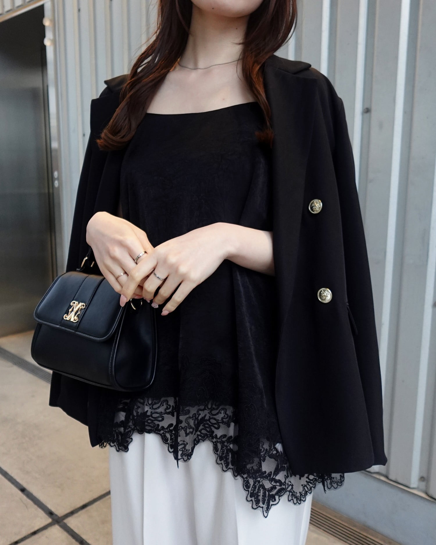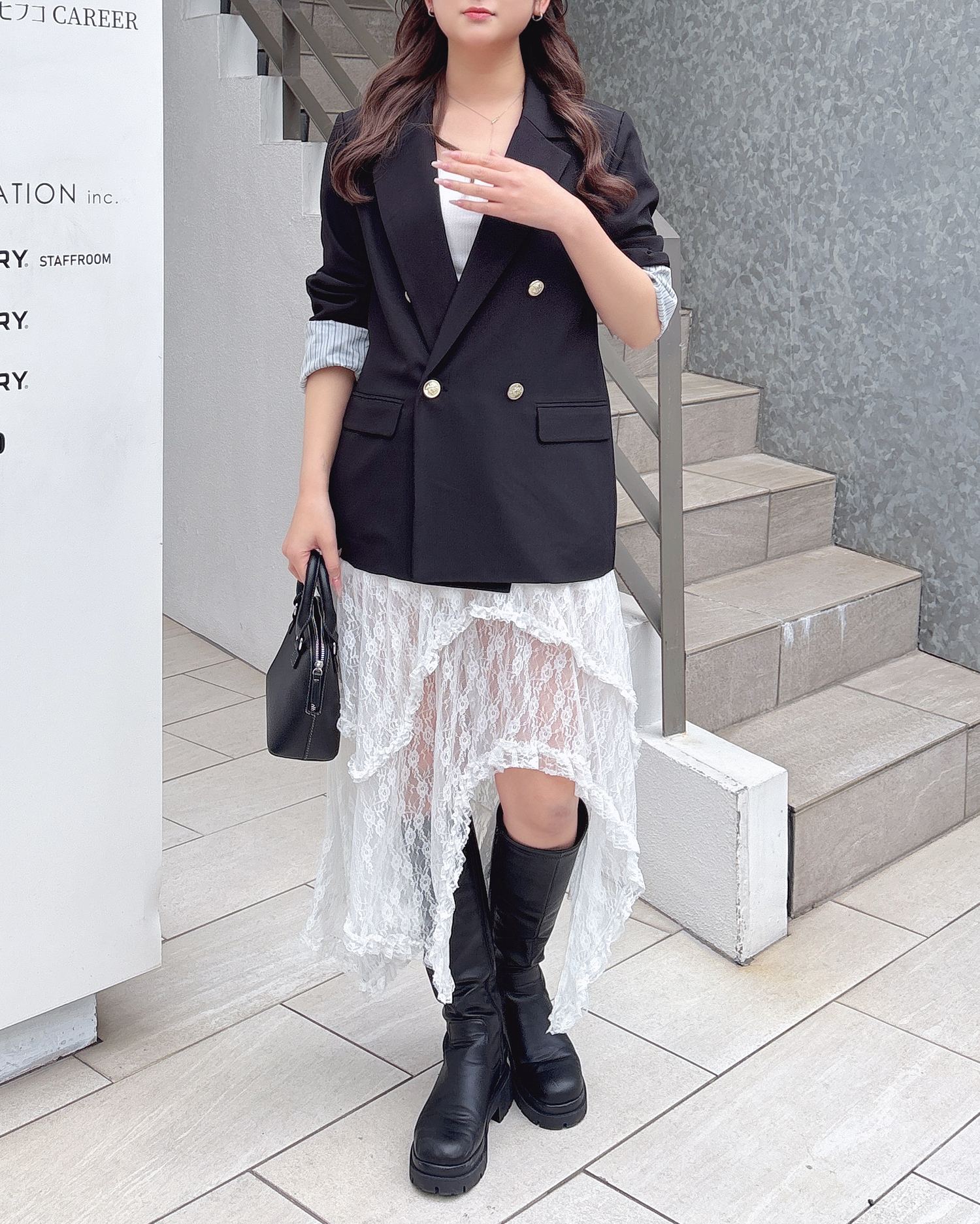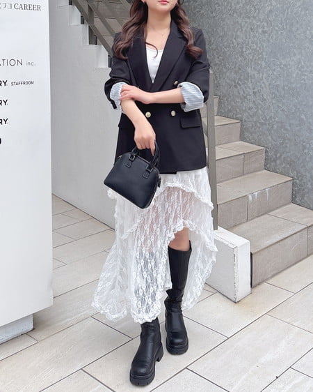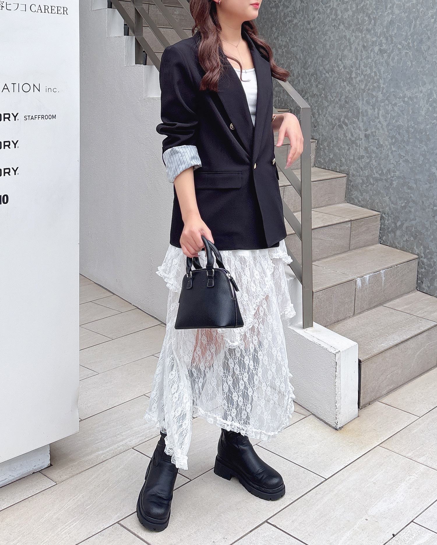 ロングスカートやブラウスを合わせてエレガントなスタイリングに。
