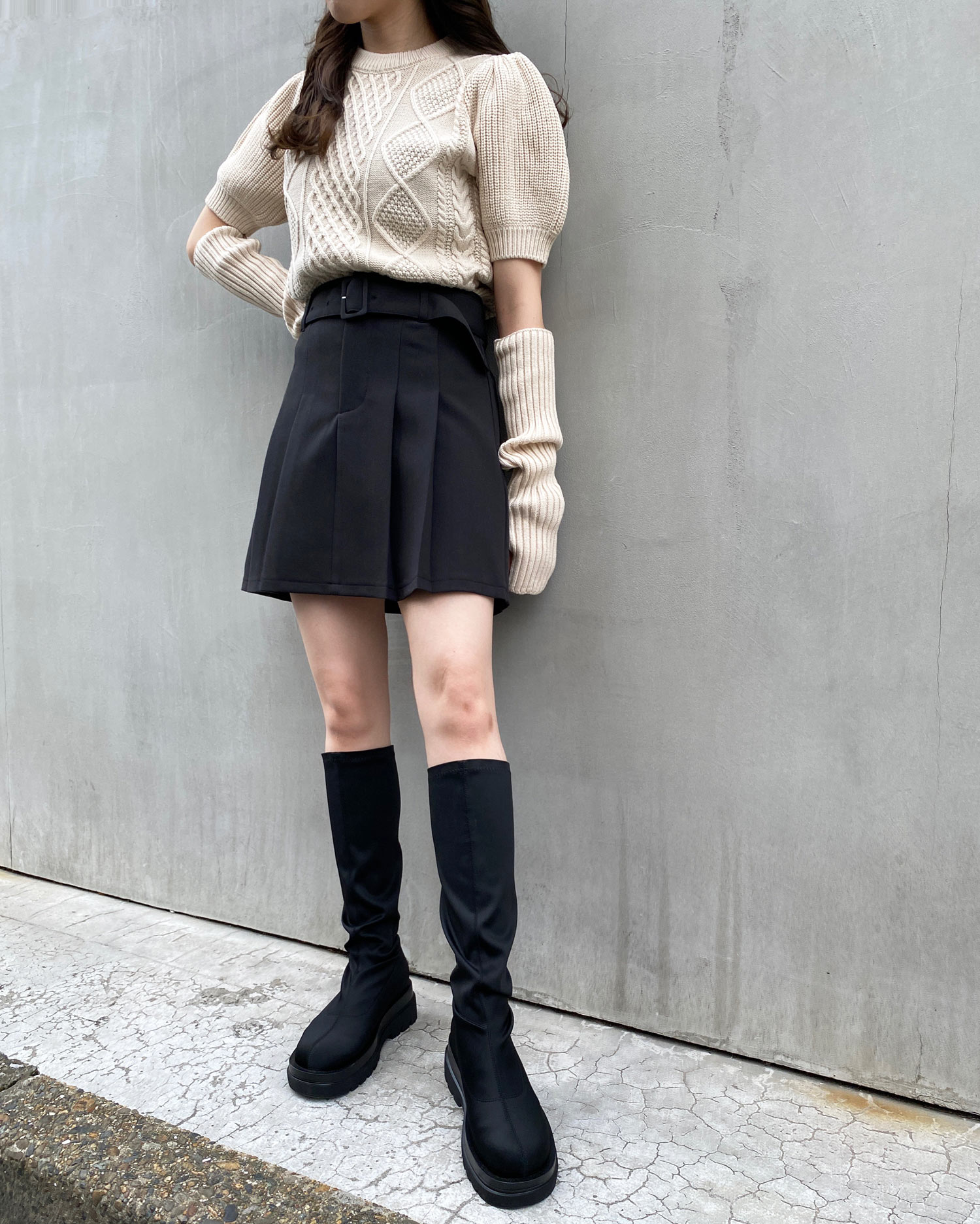 アームウォーマーと半袖ニットは単品でも使えるので、スタイルに合わせて様々な着こなしを楽しんで。