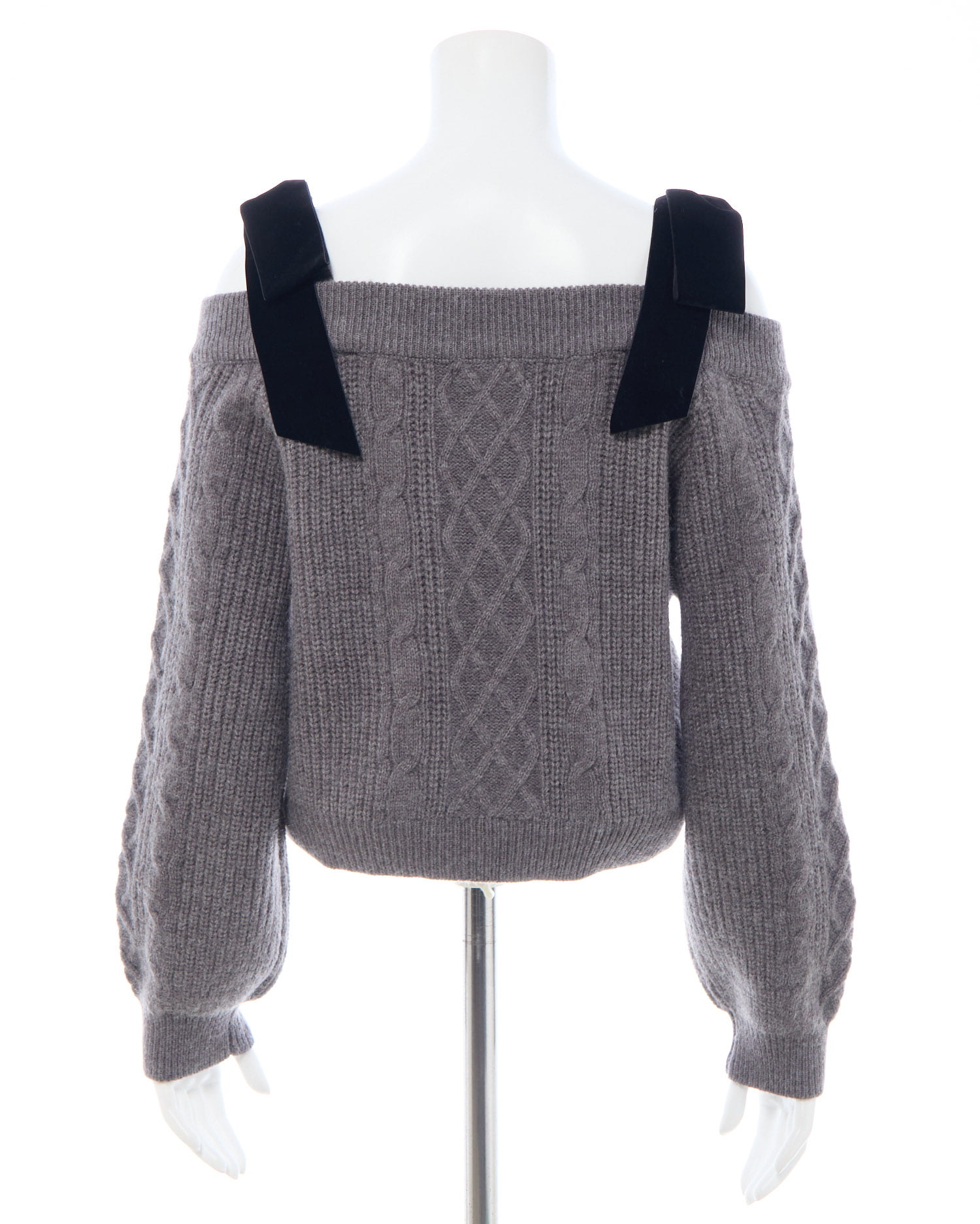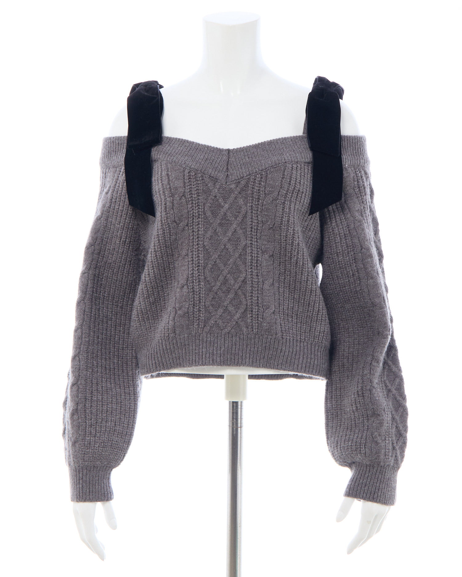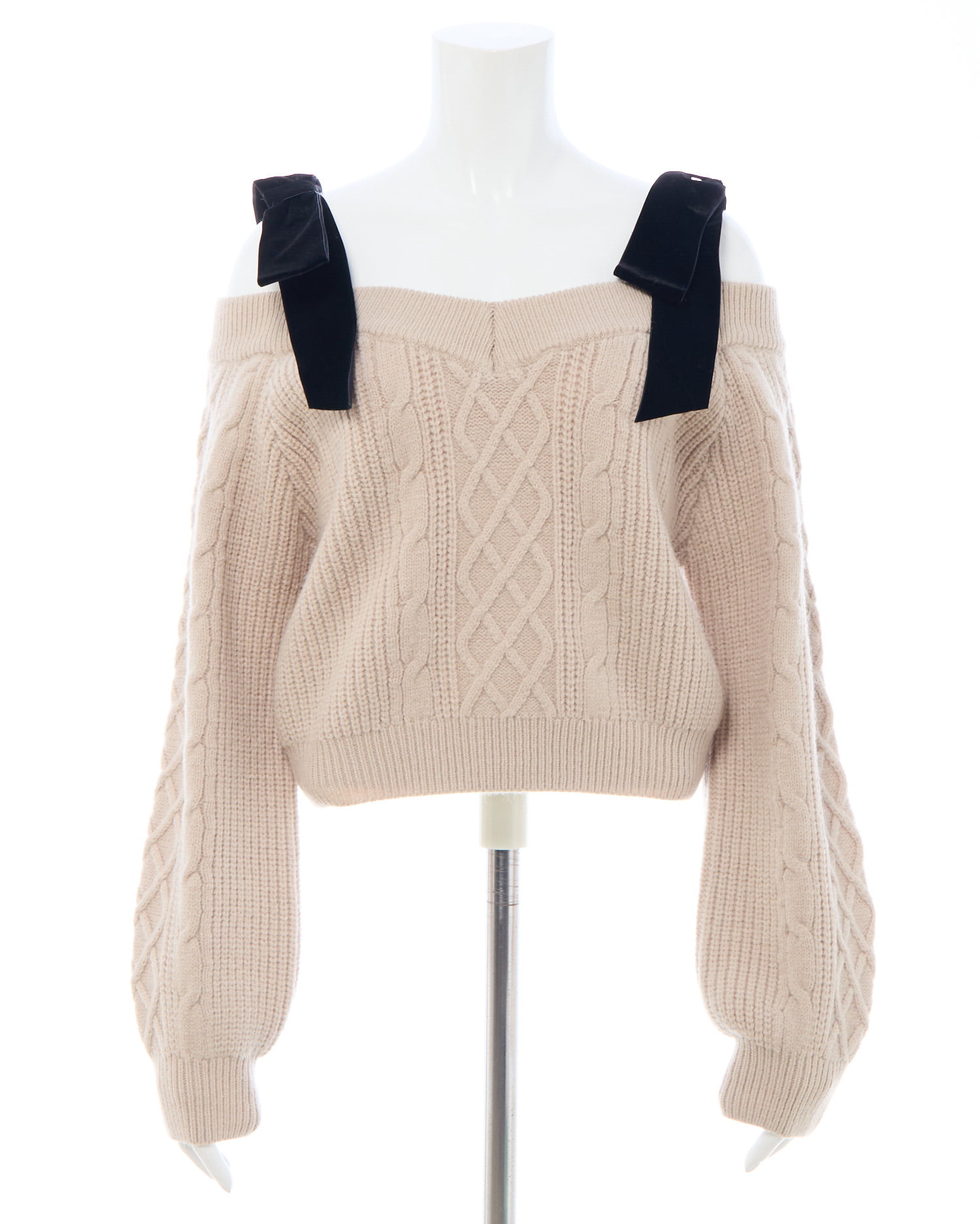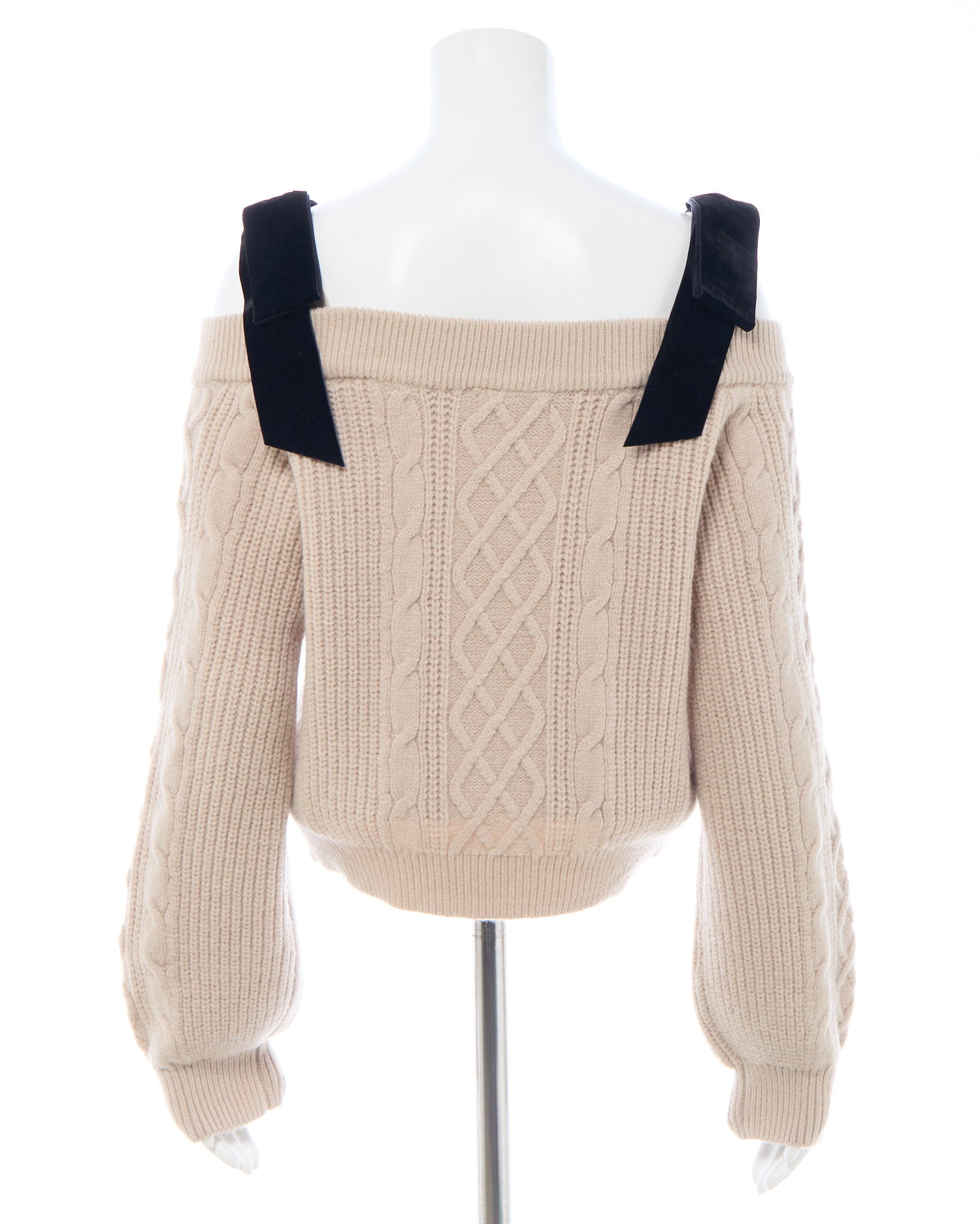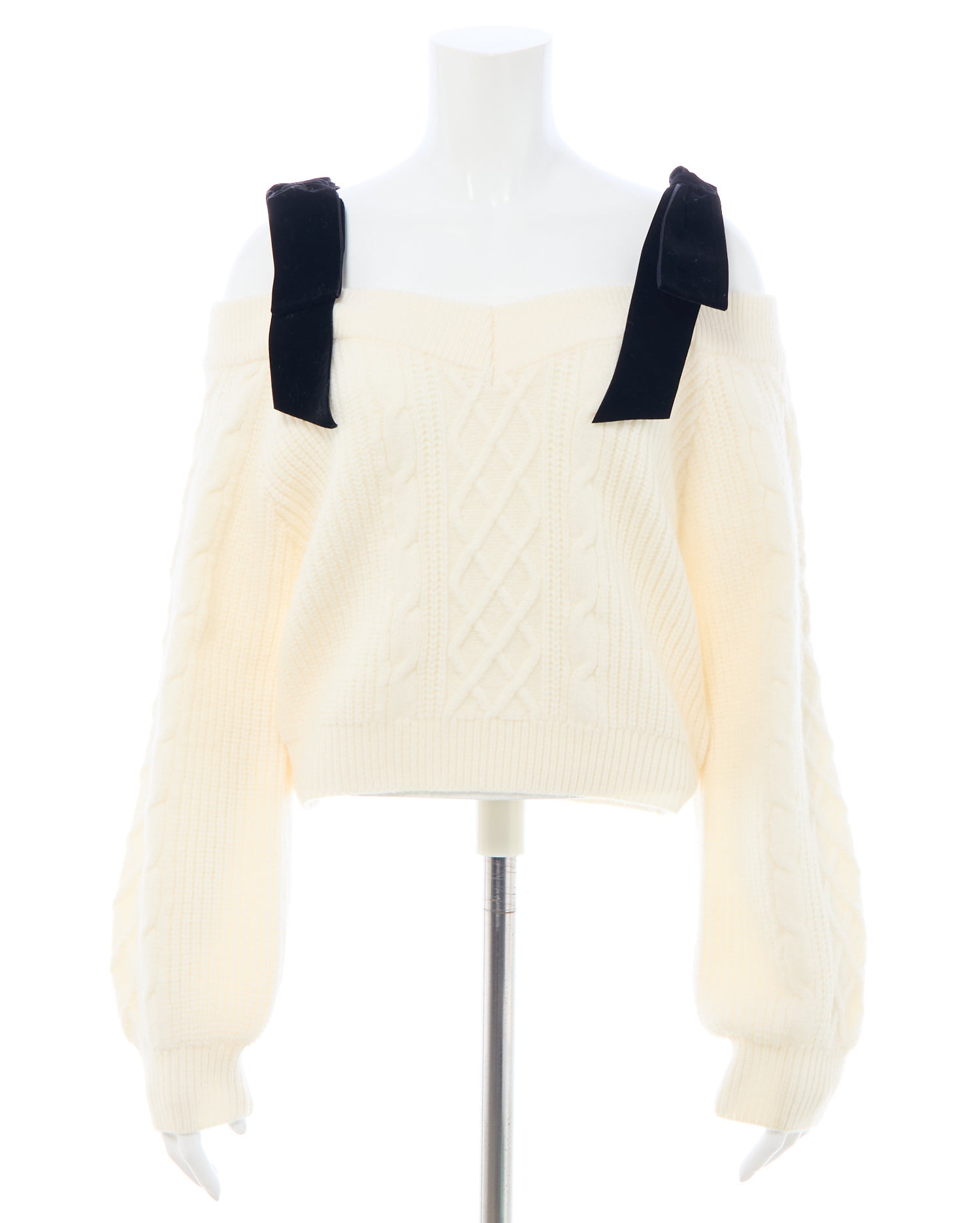 ルーズなケーブル編みのオフショルニットに肩のベロアリボンの組み合わせが