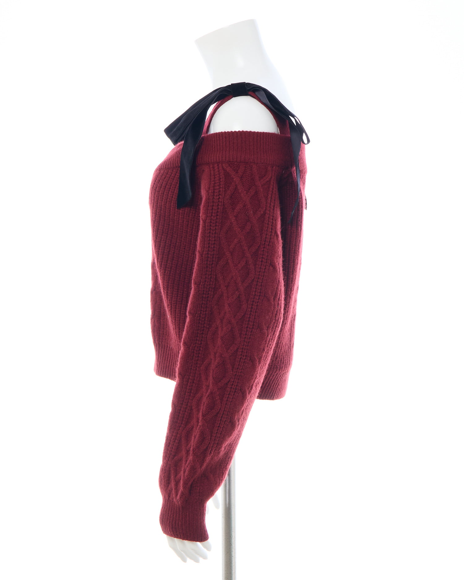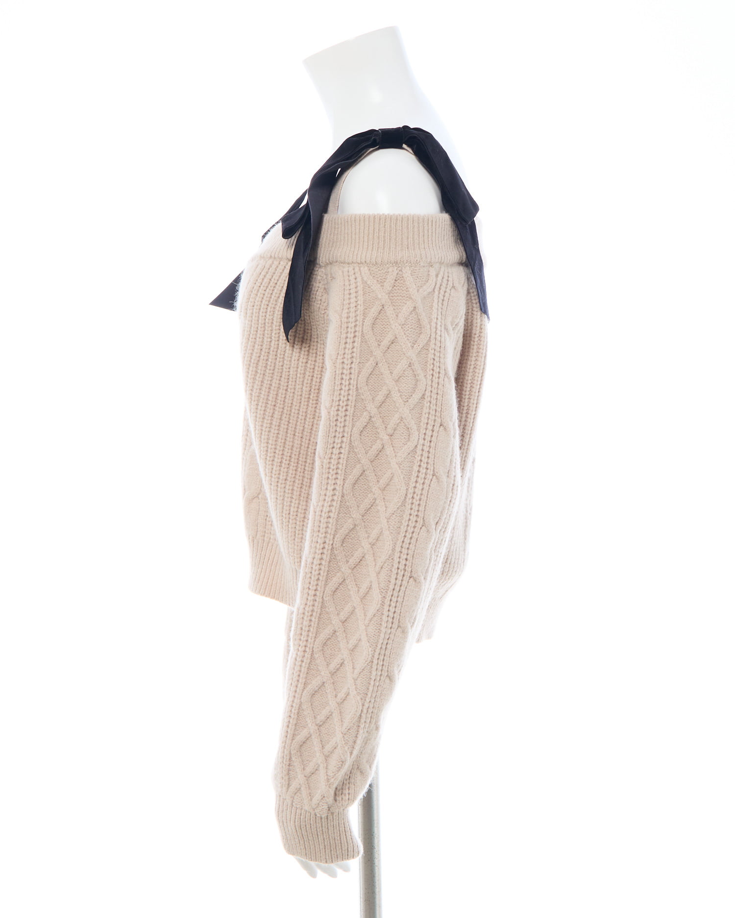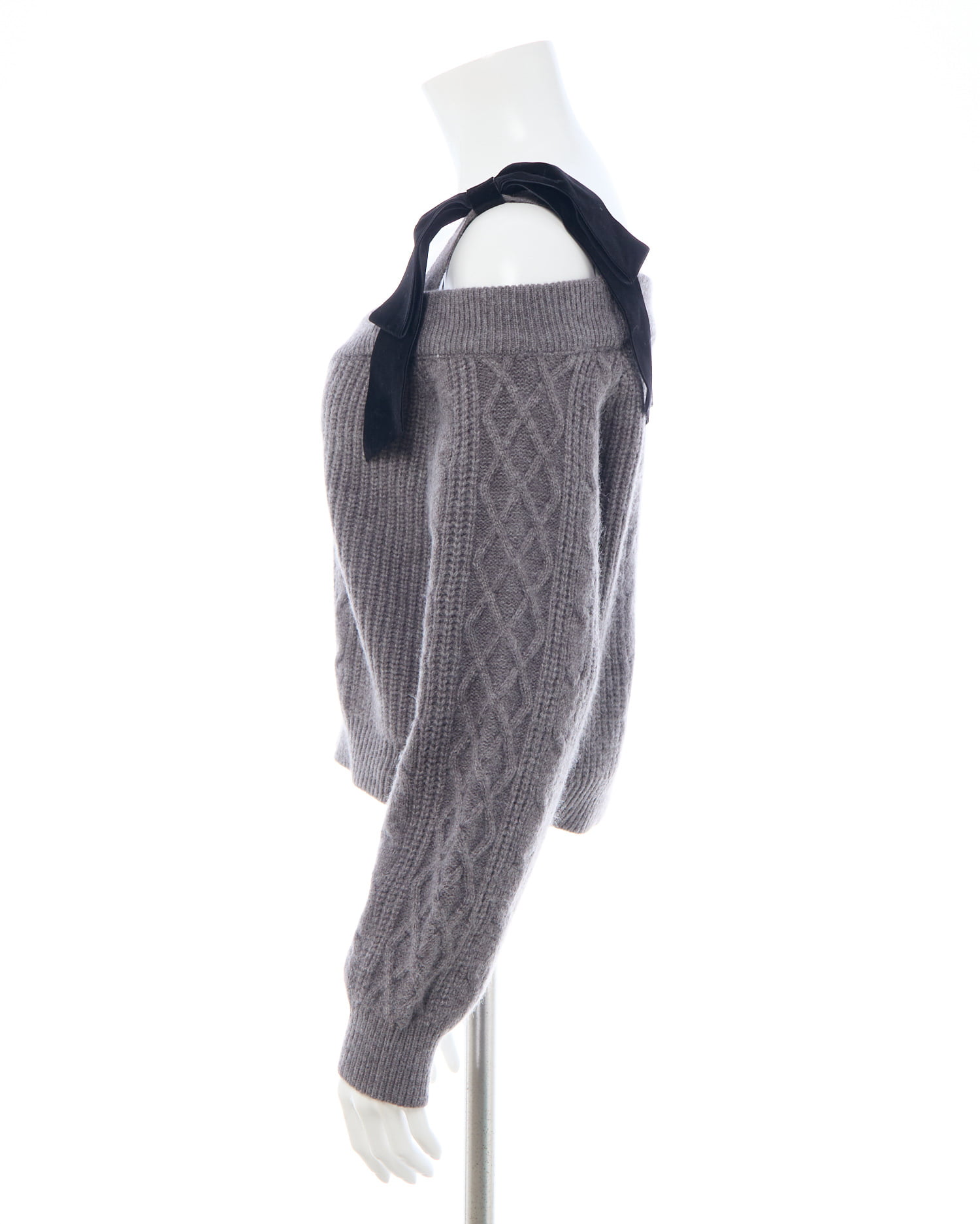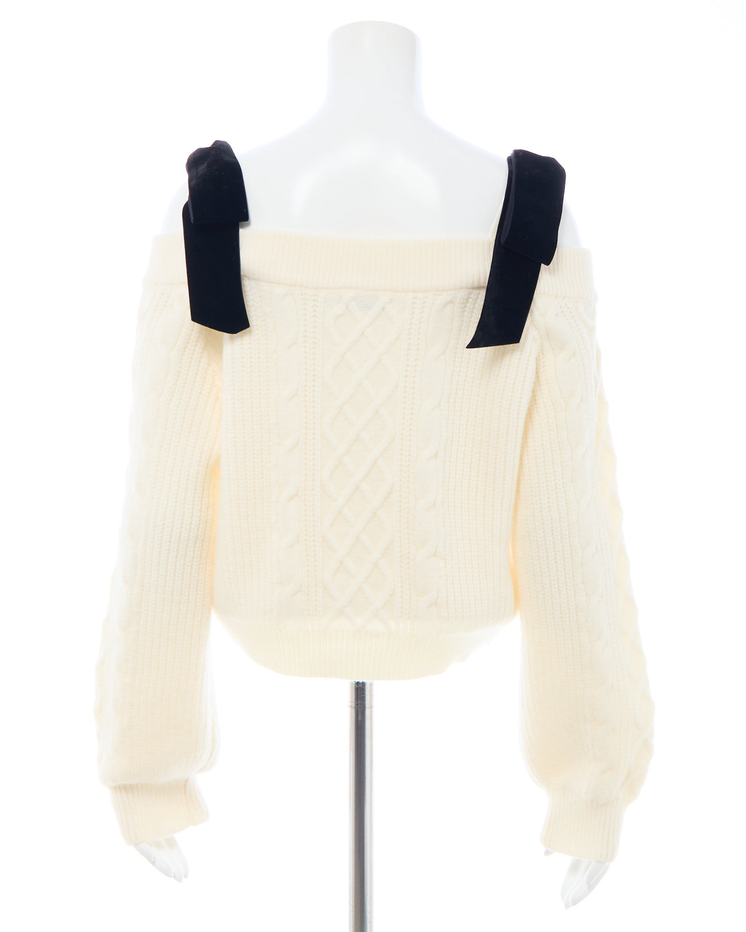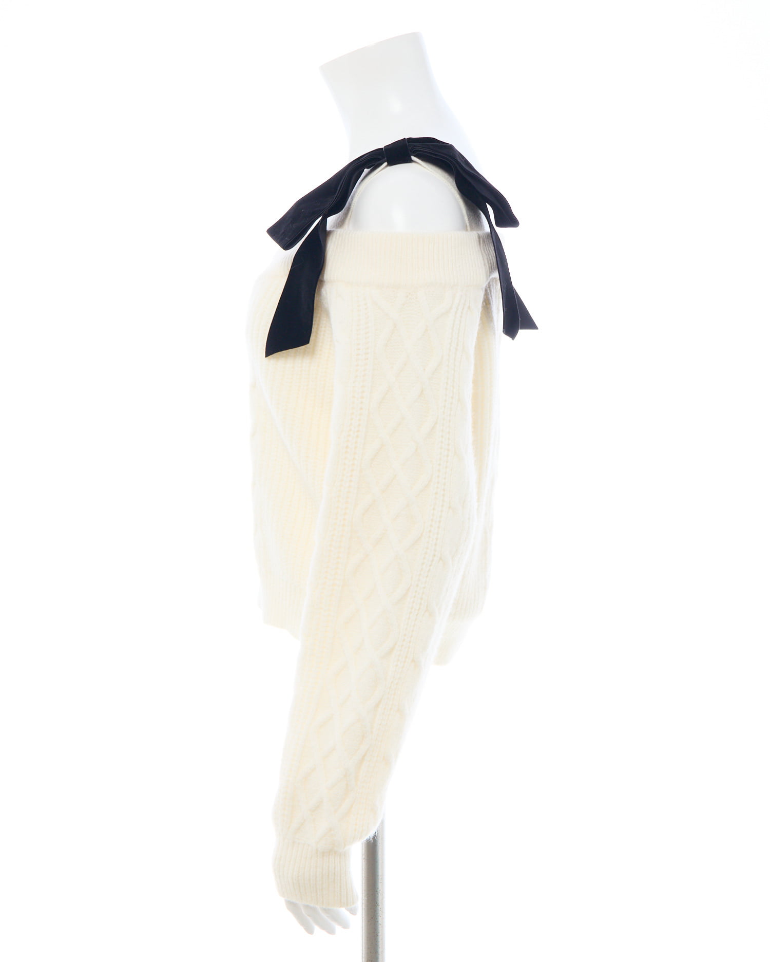 ルーズなケーブル編みのオフショルニットに肩のベロアリボンの組み合わせが