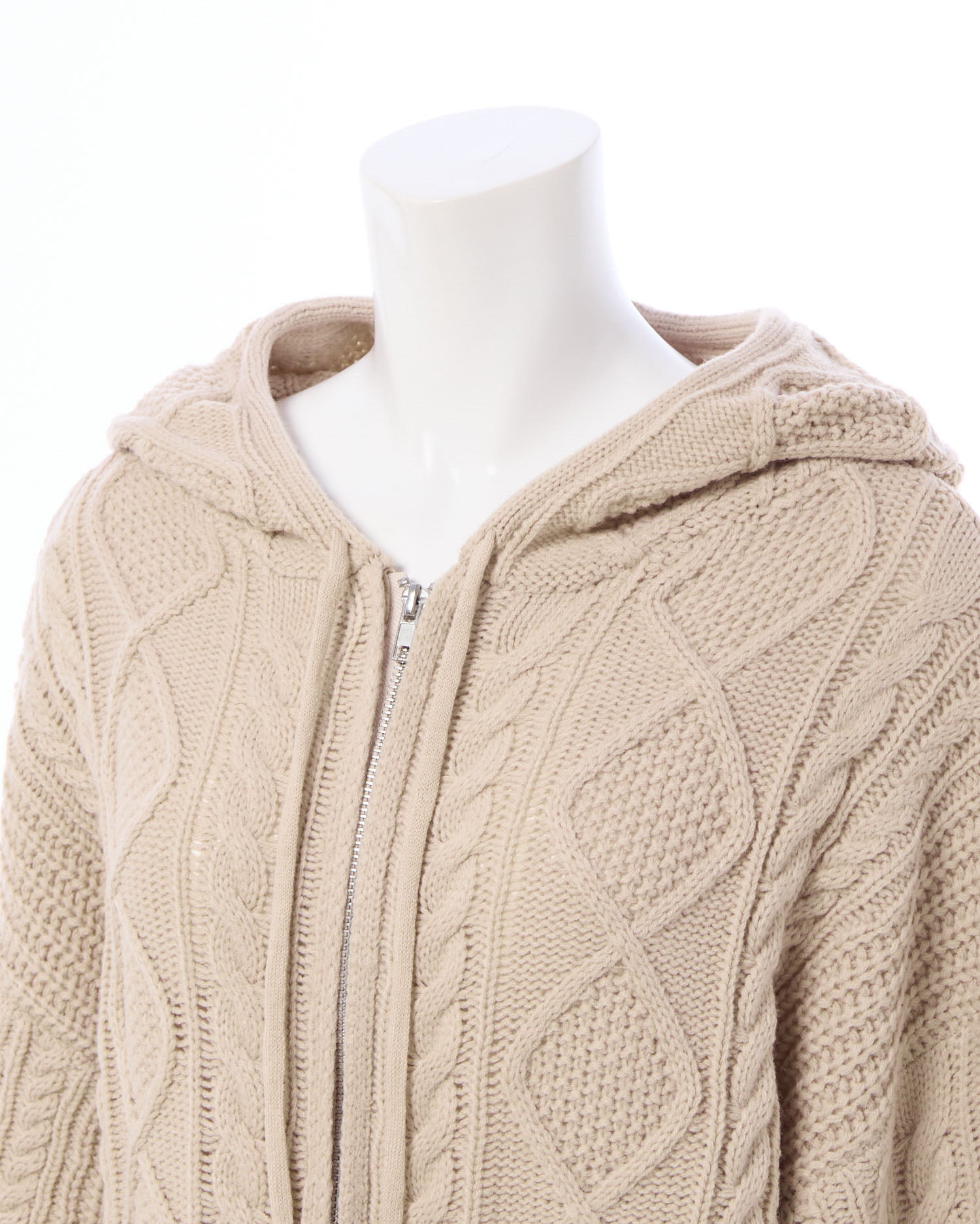 【存在感のある編地がアクセントのケーブルニットパーカー】