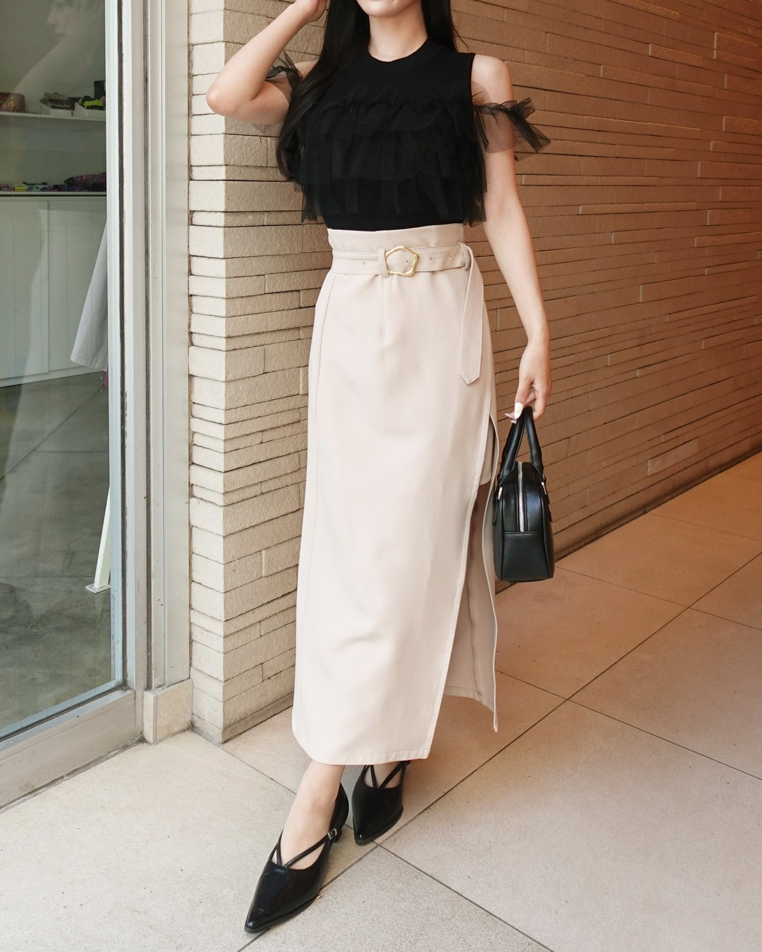 トレンドのショート丈トップスにもバランス良く合わせられます。