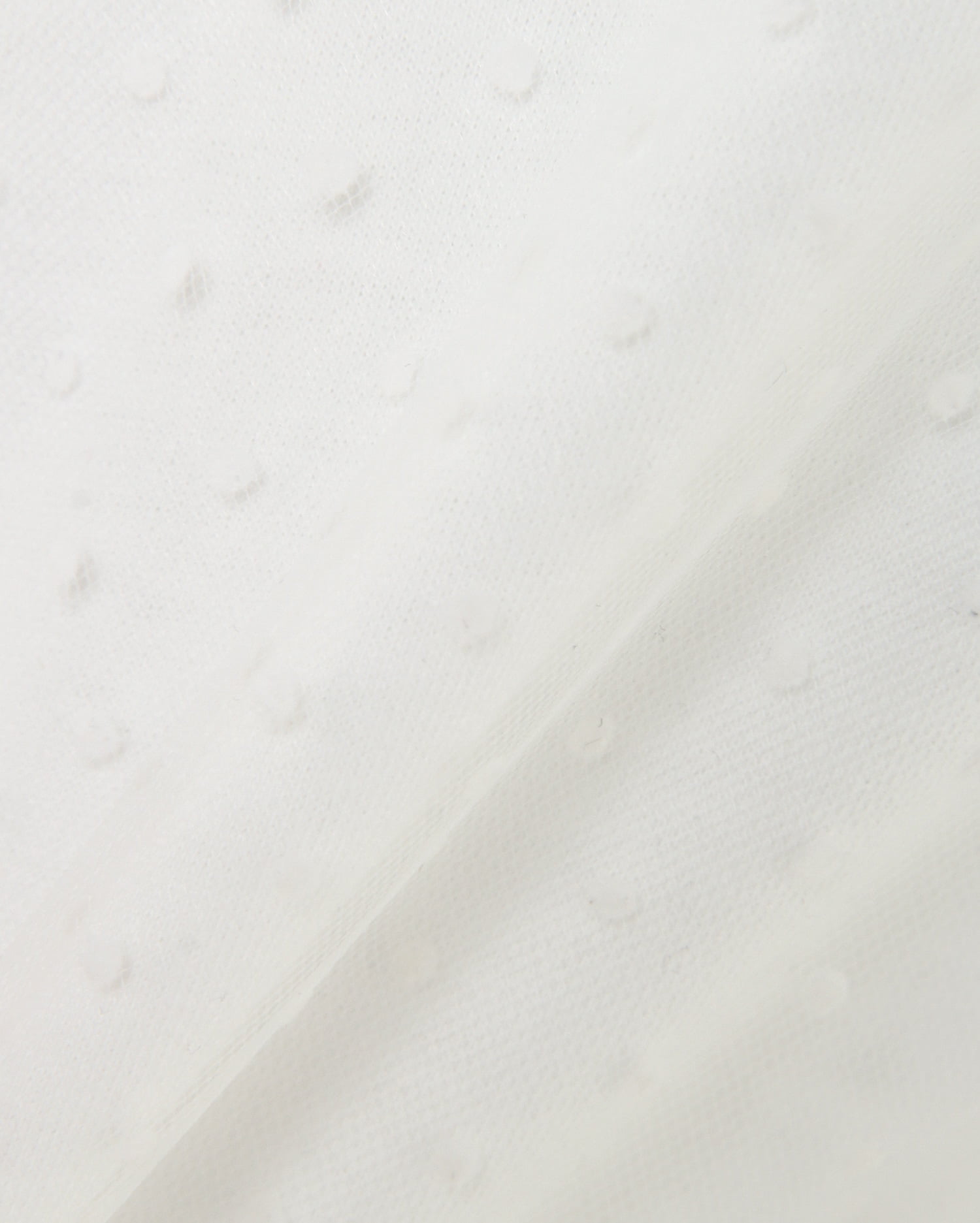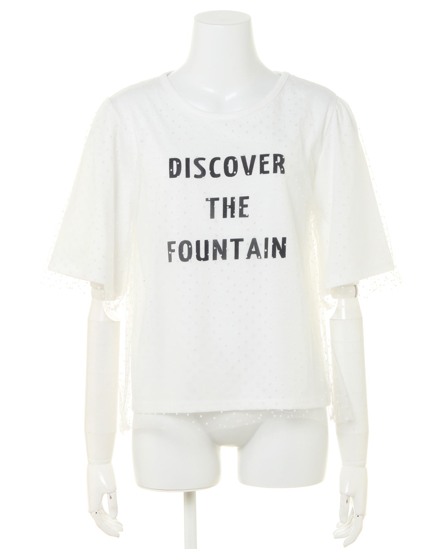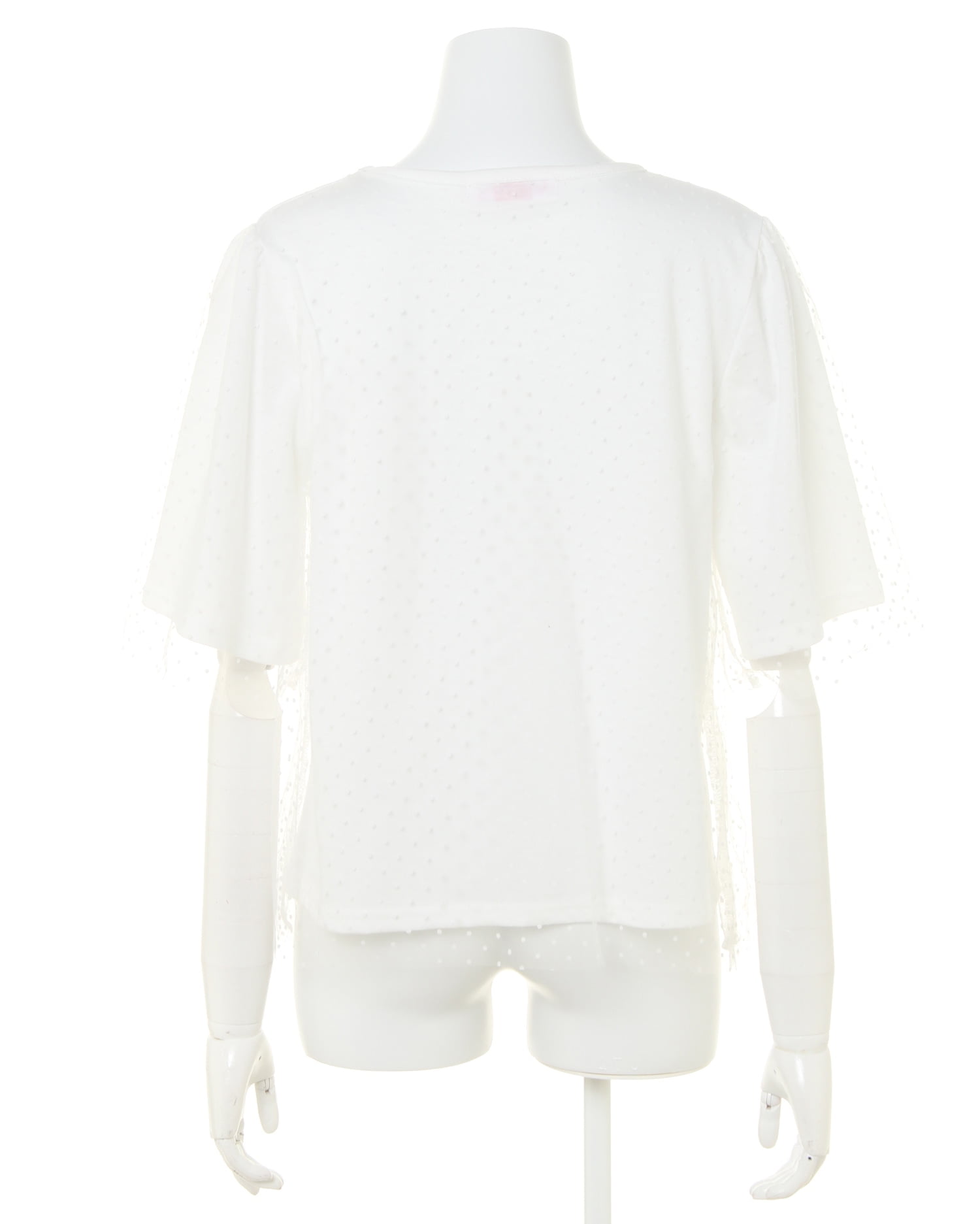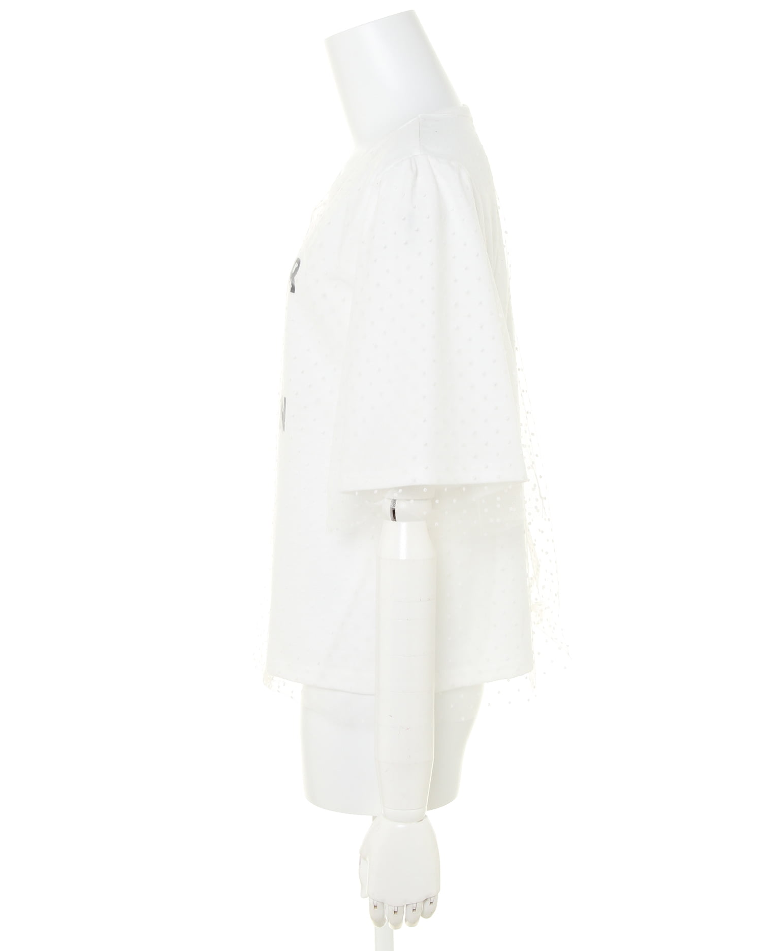 トレンドのドットデザインをチュールで取り入れた新鮮なデザインのトップス。コンパクトなシルエットのTシャツに、透け感のあるドットチュールをドッキングさせたエアリー感のある1枚です。肩口にギャザーを入れたボリュームスリーブも今年らしさたっぷり。ほんのり透けるフロントのロゴがアクセントになっています。長さを変えた袖と裾は華奢見え効果も◎。