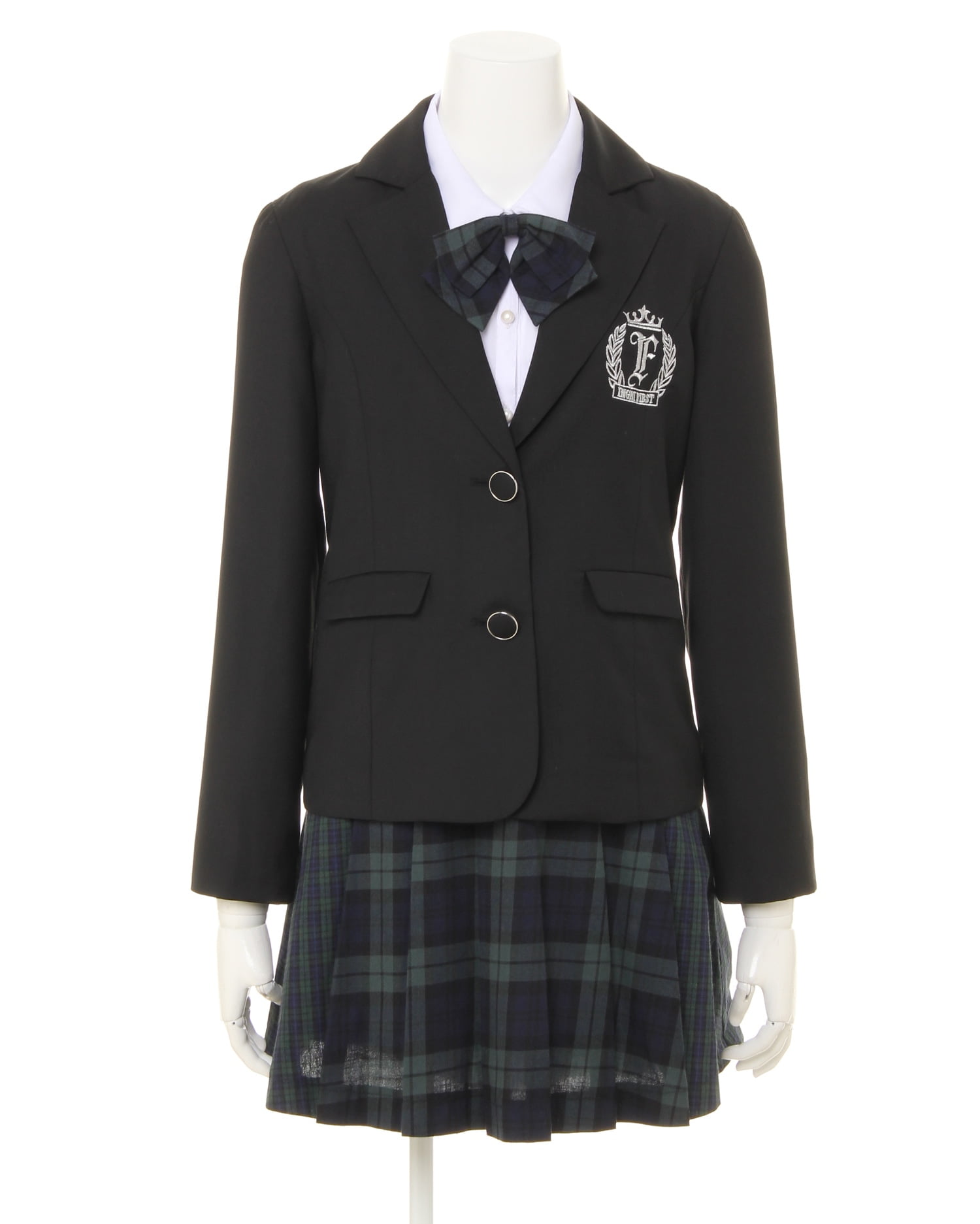 ブラックのジャケットに落ち着いたグリーンが映える卒服セット。毎年人気のセットが今年も登場です。ジャケット、スカート、ブラウス、リボンタイの4点セットは、これだけでトレンド感のあるコーディネイトに。ベーシックシルエットのジャケットは、胸元のシルバーのブランド刺しゅうロゴがアクセントになっています。大小のチェックを組み合わせたデザイン性のあるスカートは、バックウエストがゴム仕様で穿きやすいのがポイント。クラシカルなプチフリルがアクセントになったブラウスは、しなやかな生地で肌触りも◎。ワンタッチで付け外しできるスカートと同布のリボンタイ付き。単品でも活躍するお得なセットです。