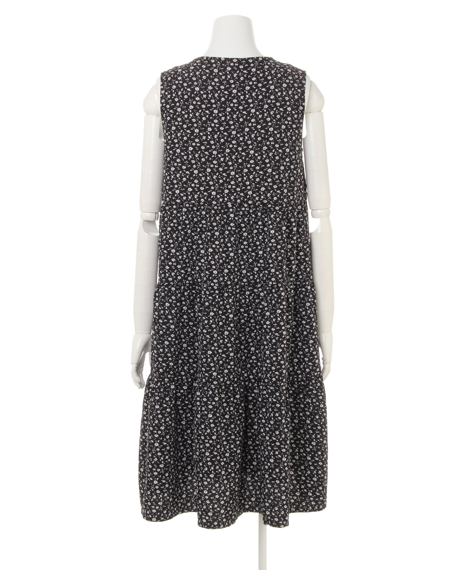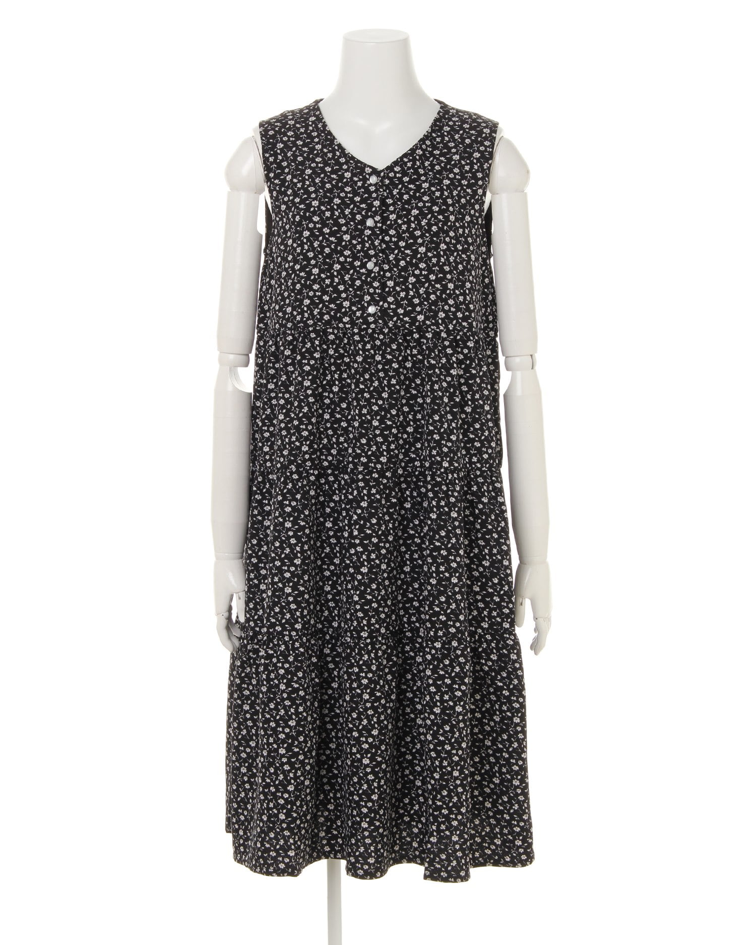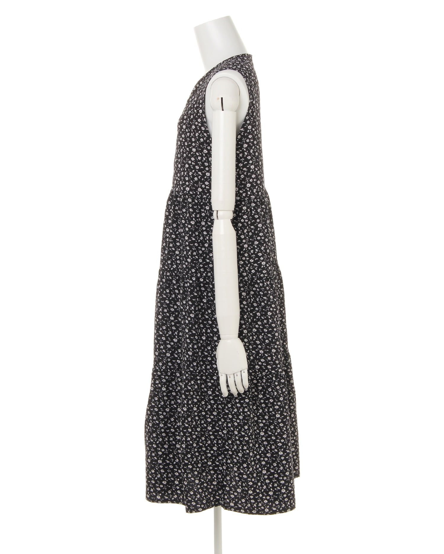 落ち着いた配色と単色のフラワープリントの組み合わせで大人っぽい着こなしが完成するロングワンピース。上半身をコンパクトに見せてくれるノースリーブデザインと、高いウエスト位置から裾に向かって広がるシルエットでスタイルアップ効果も狙えます。フロントのボタンを開ければ着脱もスムーズ。今年らしいティアードデザインがキュートな印象です。肌触りの良い滑らかな裏地付きで1枚でも安心して着られます。