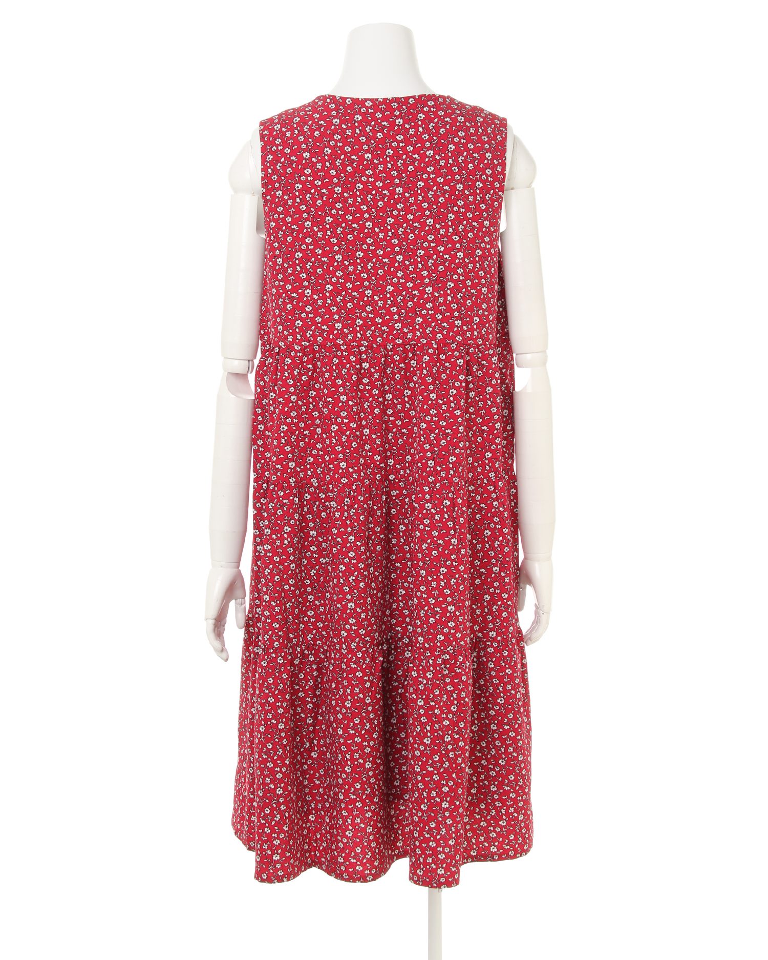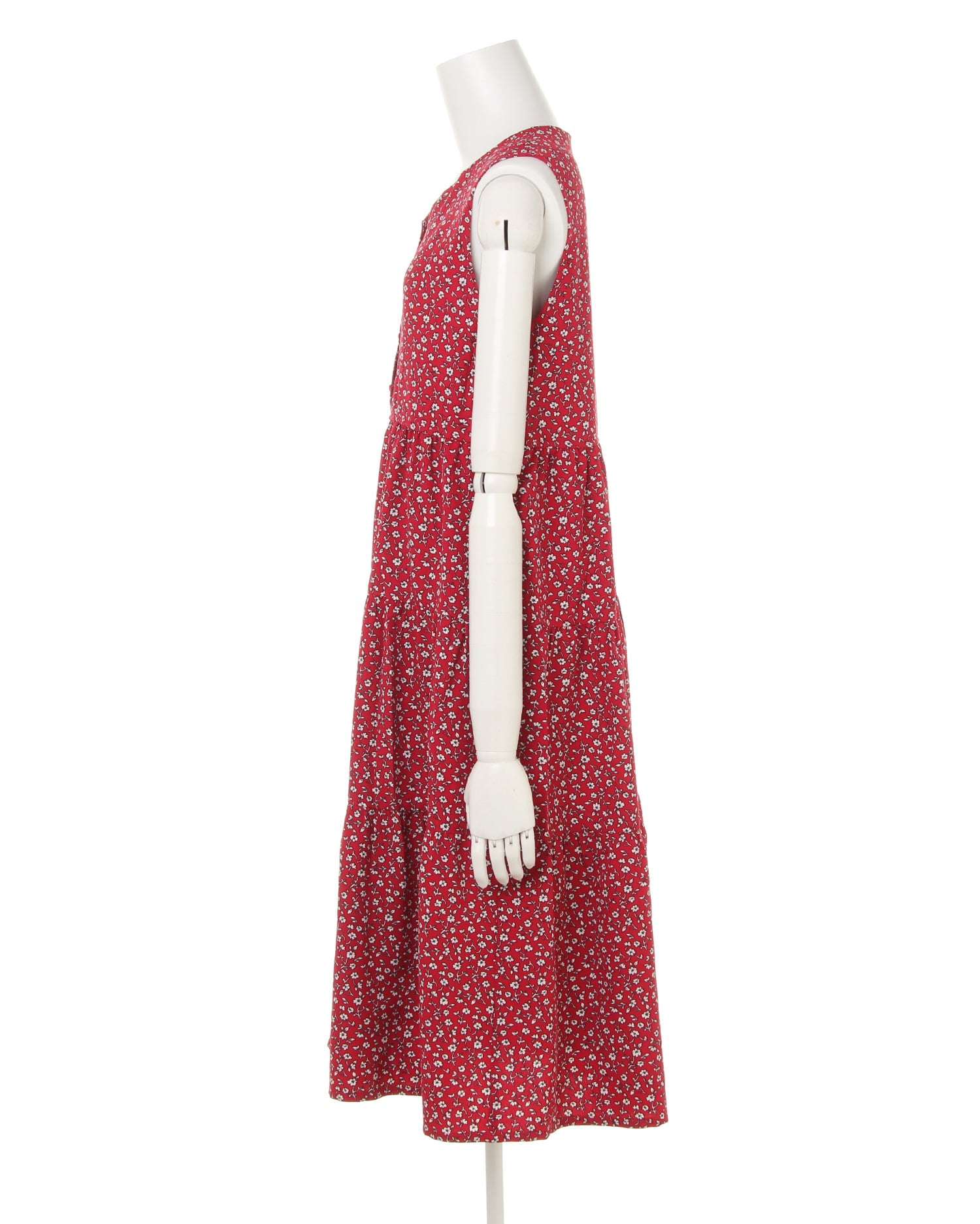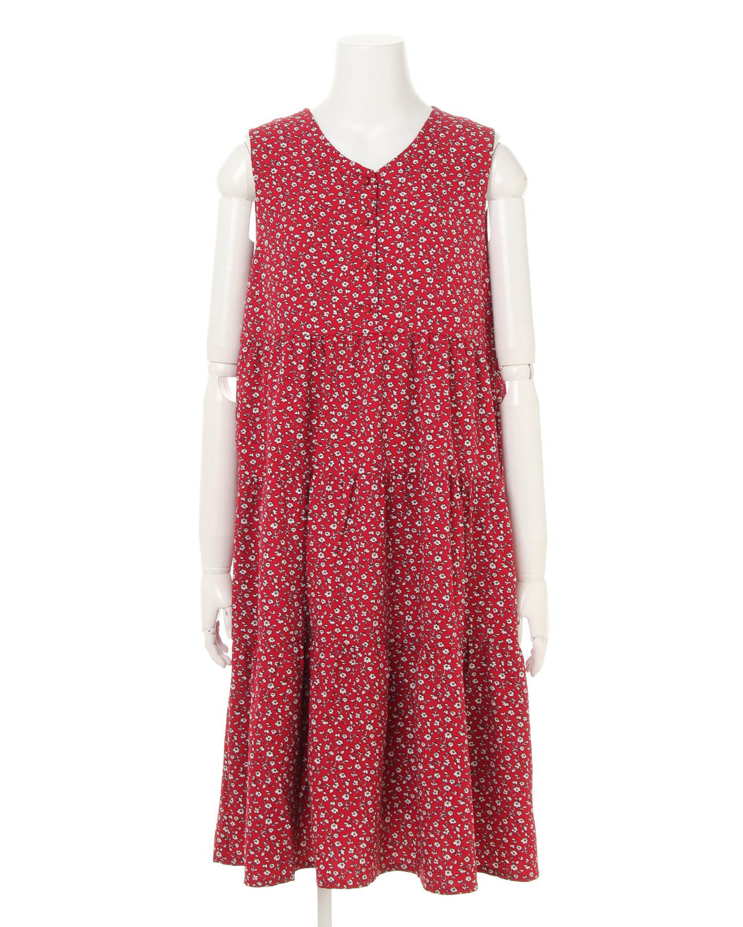 落ち着いた配色と単色のフラワープリントの組み合わせで大人っぽい着こなしが完成するロングワンピース。上半身をコンパクトに見せてくれるノースリーブデザインと、高いウエスト位置から裾に向かって広がるシルエットでスタイルアップ効果も狙えます。フロントのボタンを開ければ着脱もスムーズ。今年らしいティアードデザインがキュートな印象です。肌触りの良い滑らかな裏地付きで1枚でも安心して着られます。