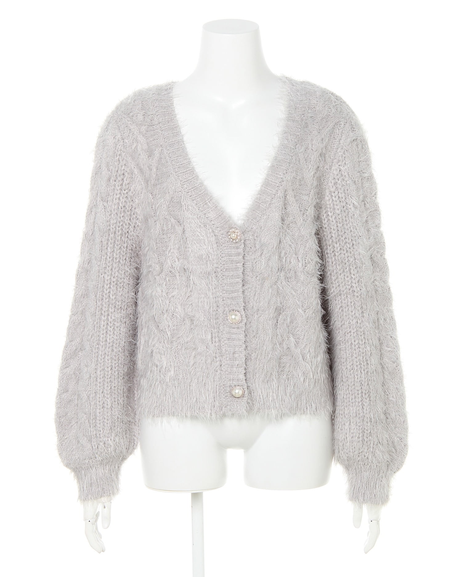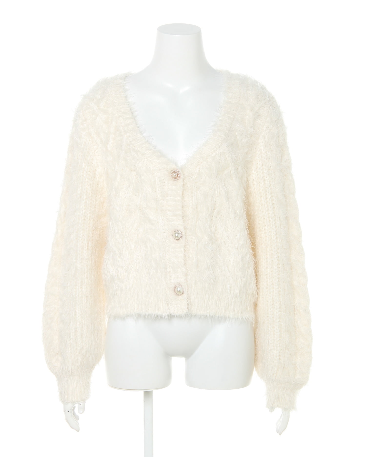 毛足の長いフェザーニットとハートモチーフの編地でキュート&ガーリーなカーディガン。深めのVネックで顔周りを明るく映します。すっきりとしたネックラインはインナーを合わせるのにも快適。もちっとした柔らかな肌触りで着心地抜群 普段使いに重宝します。フロント部分の装飾ボタンがフェミニン。コンパクトな丈感は様々なトップスともバランス良く合わせられます。羽織りとしても◎。